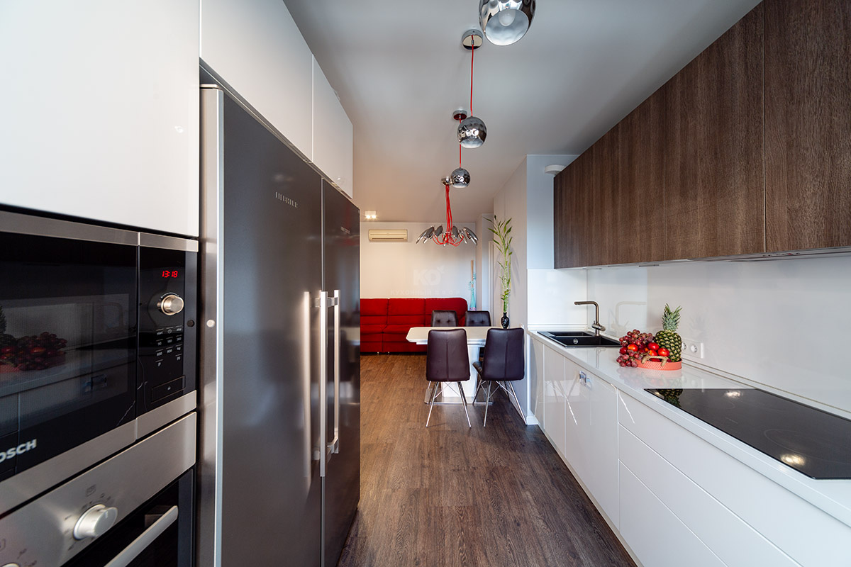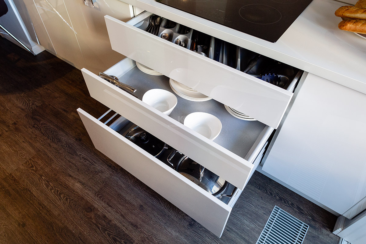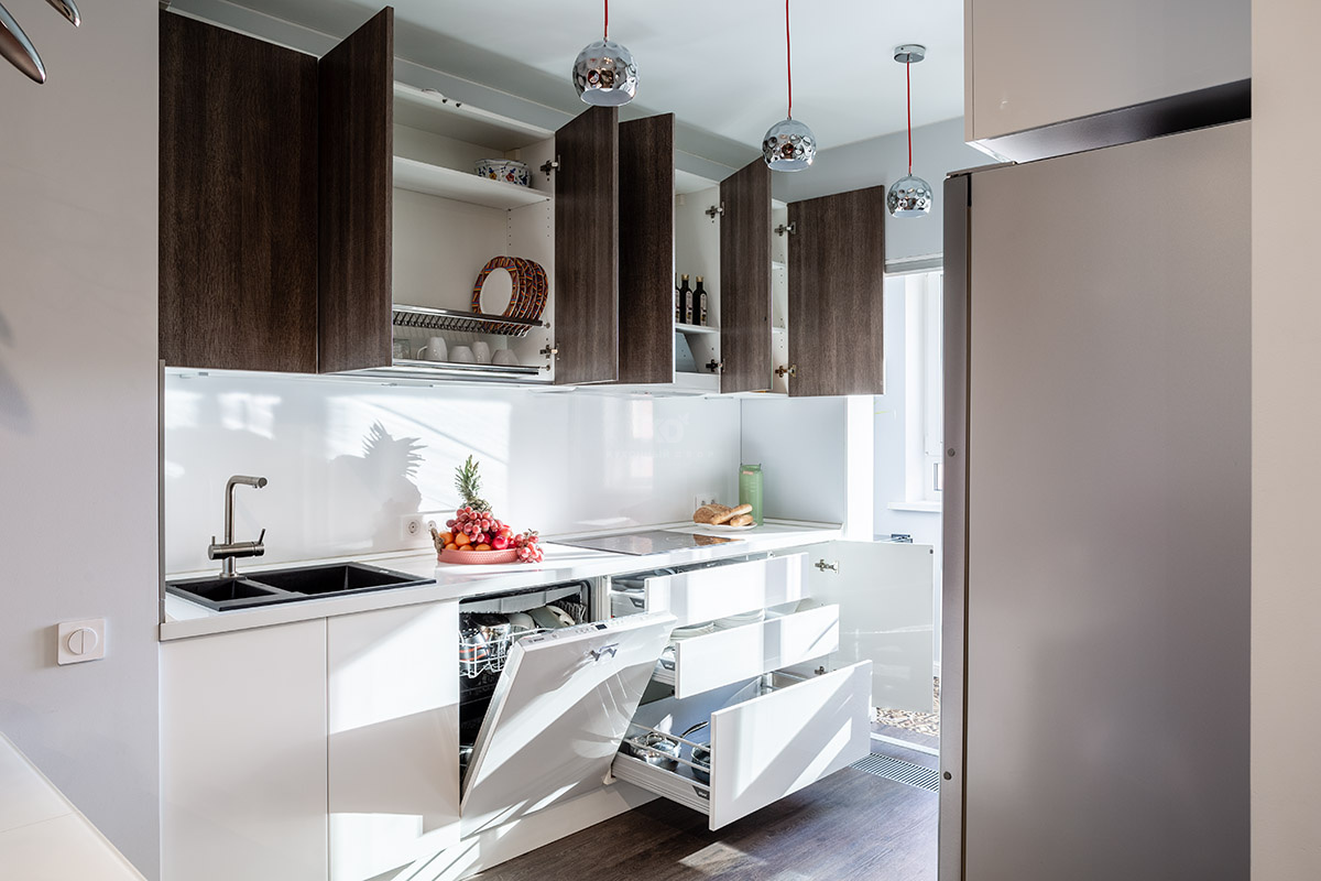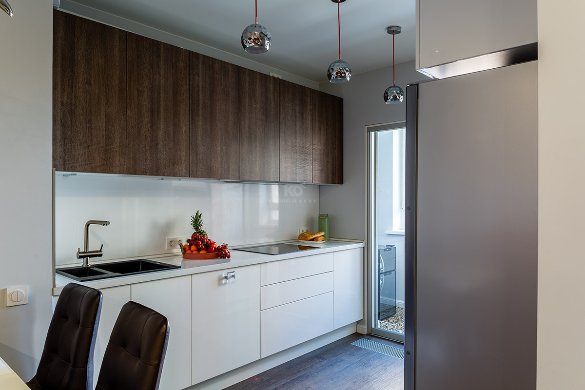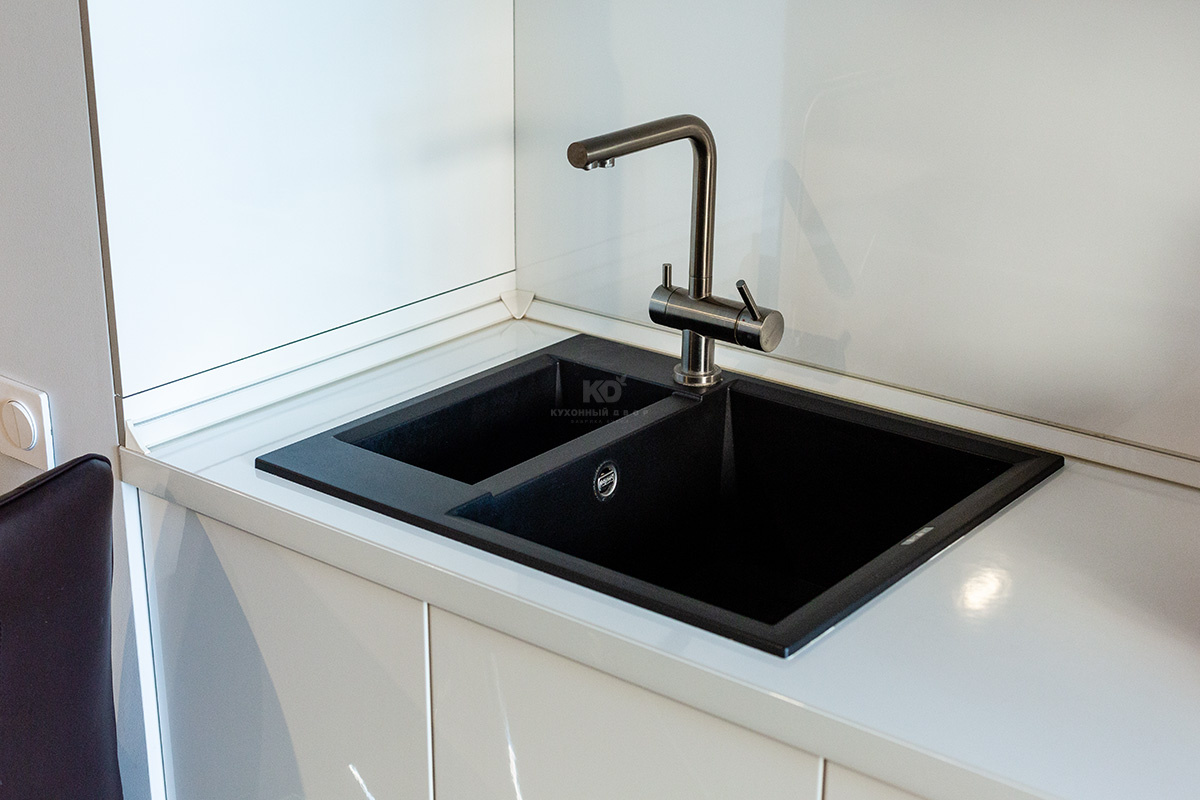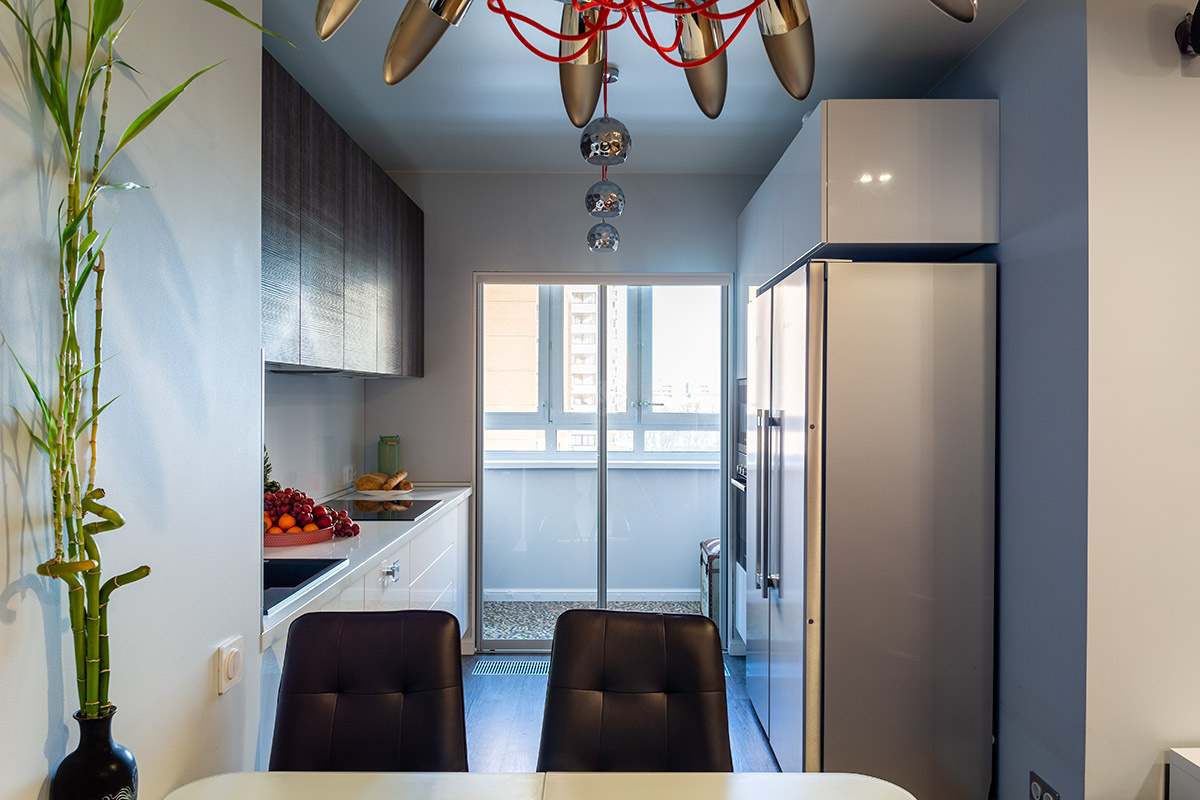 Фасады зоны у противоположной стены полностью выполнены из белой ультраглянцевой MDF. Когда сквозь большие стеклянные двери лоджии льётся солнечный свет, кухня буквально завораживает игрой отражений! И вдвойне приятно, что эта красота совмещена с практичностью. Оснащение «Ричарда» позволяет не просто готовить, а наслаждаться этим процессом. Духовой шкаф и СВЧ здесь установлены на высоте, удобной для хозяйки. А вместительные зоны хранения и ящики полного выдвижения помогут хранить даже самую объёмную посуду в идеальном порядке. Эта удобная и красивая кухня купается в лучах солнца и дарит солнечное настроение своим хозяевам!