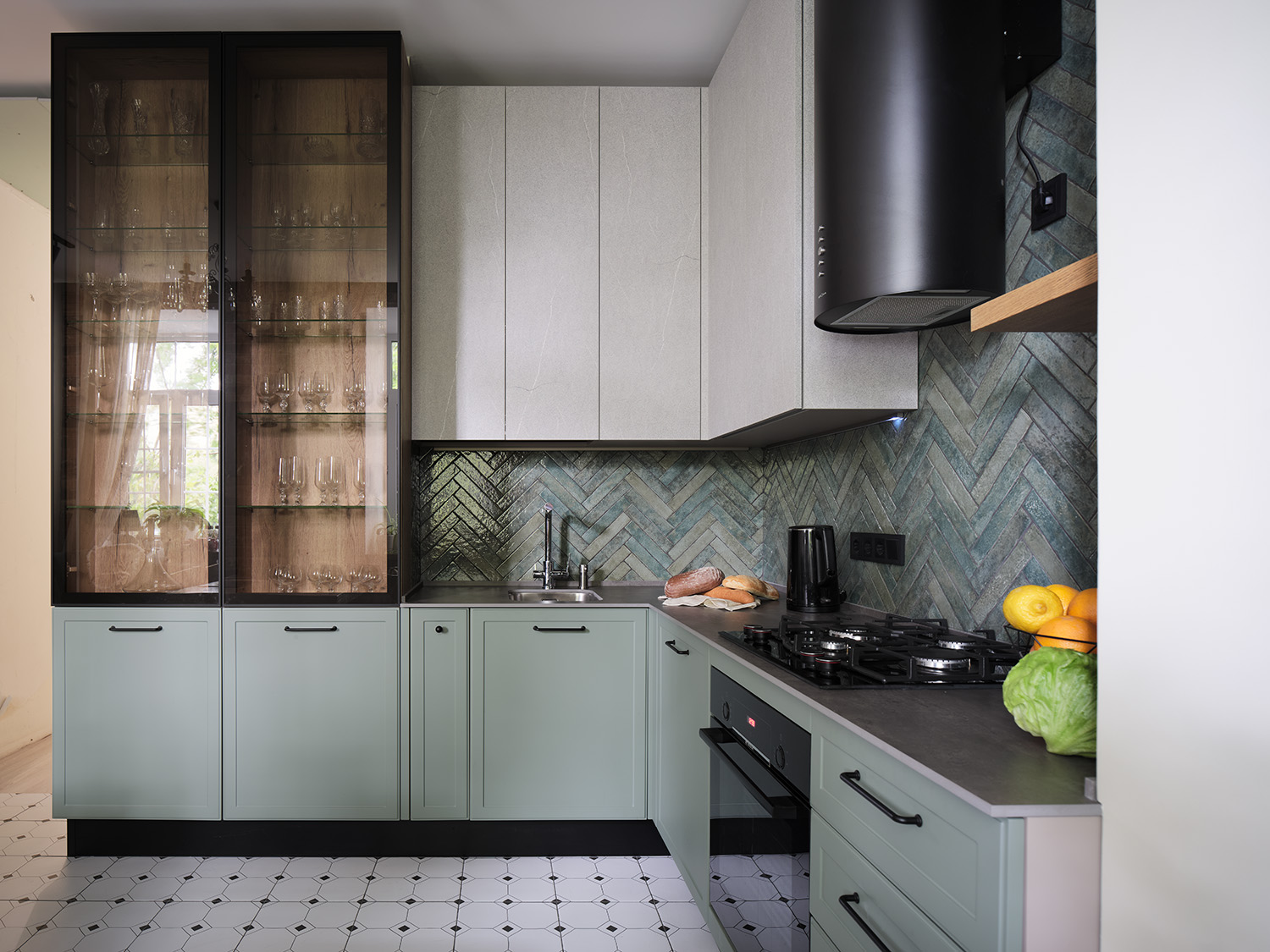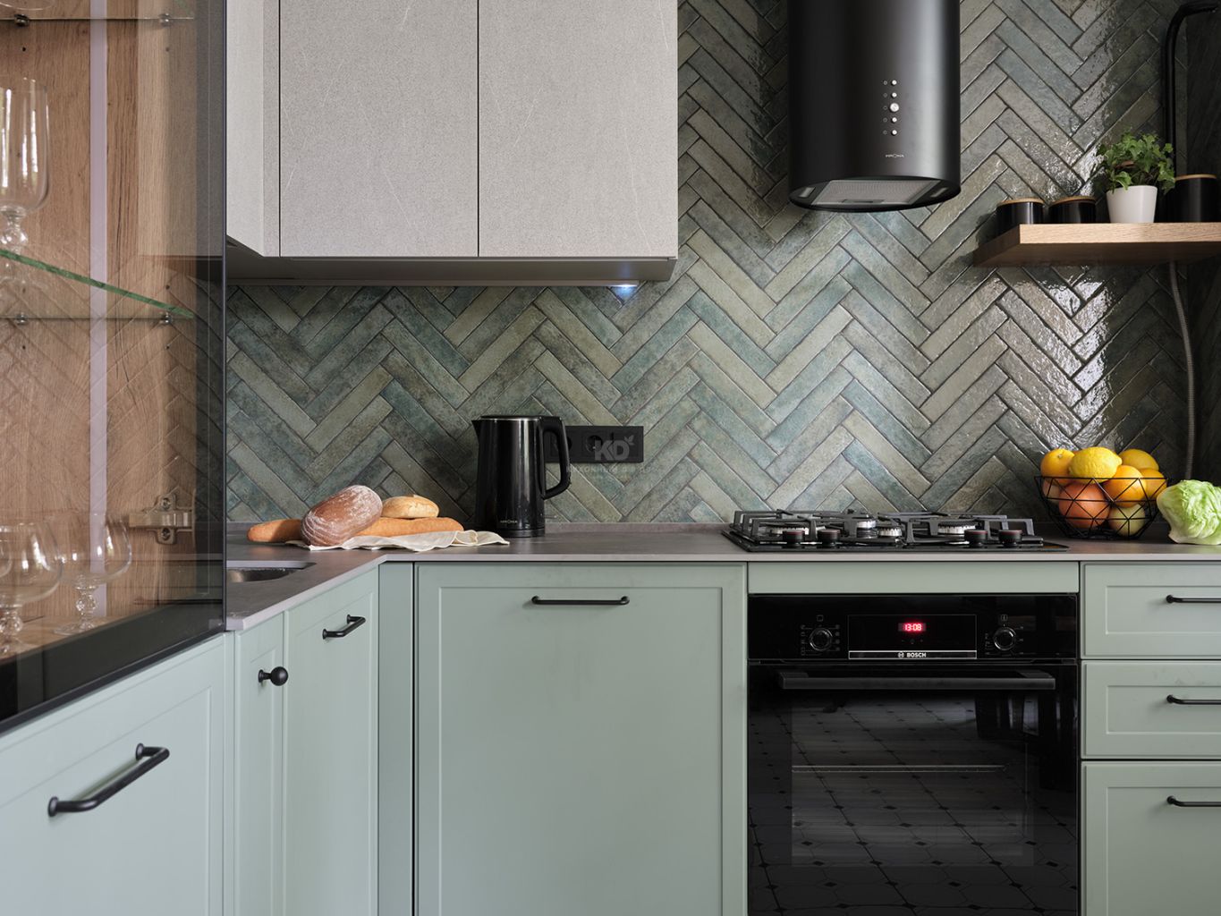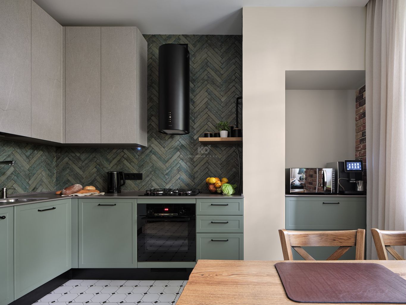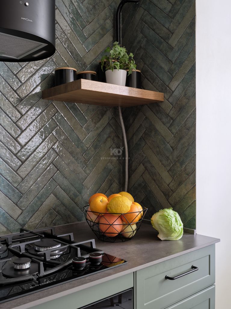 Столешница из тонкой керамики под камень стала метафорой фьордов — спокойной, величественной, вечной. Она будто хранит в себе отголоски гранитных берегов и прохладную силу воды. Мойка подстольного монтажа поддерживает идею чистых линий и визуальной свободы. Она не перетягивает внимание на себя, но создаёт ощущение завершённости и цельности образа. Зелёная плитка, уложенная изящной ёлочкой, словно сплетает ветви высоких норвежских сосен. При каждом взгляде на неё хозяева будто слышат мягкий хруст сухой хвои под ногами и ощущают свежий воздух северного леса.