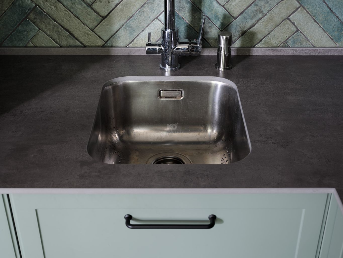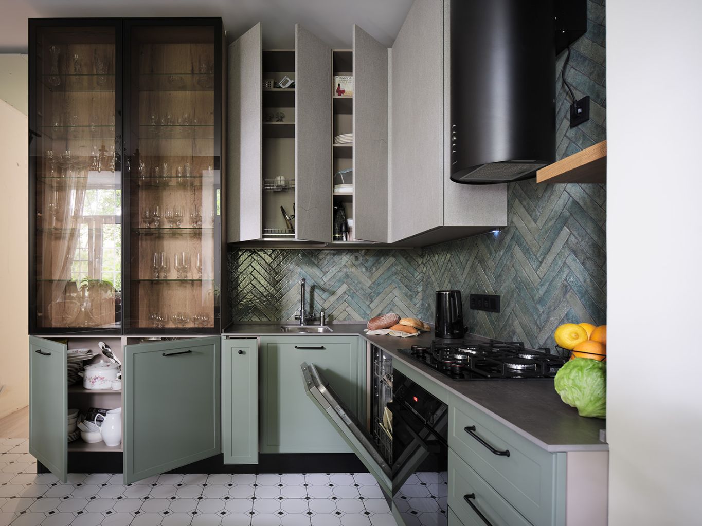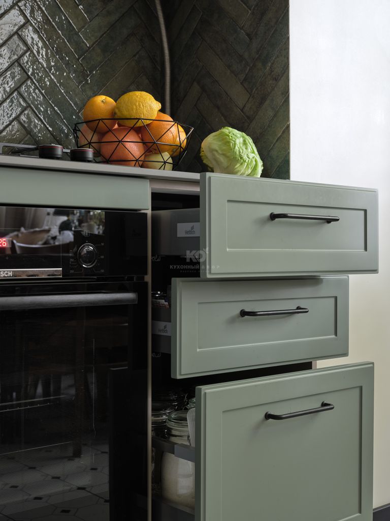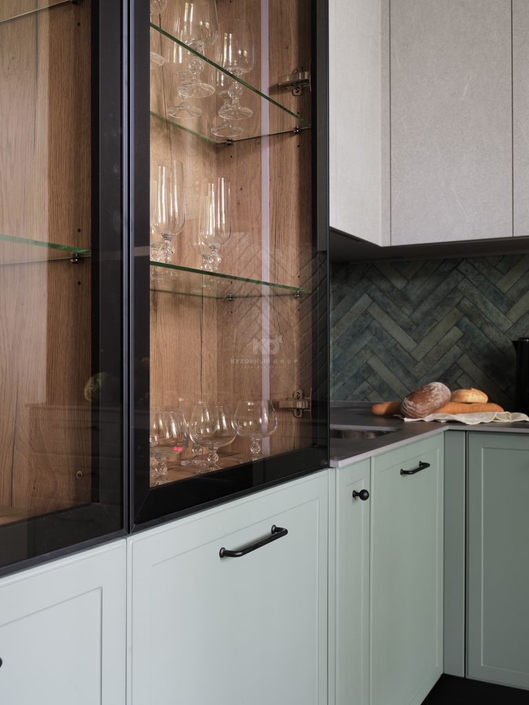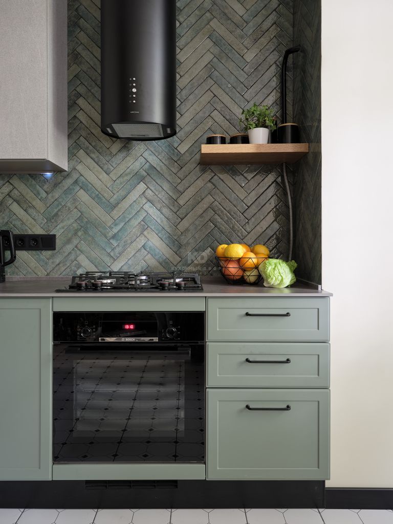 Столешница из тонкой керамики под камень стала метафорой фьордов — спокойной, величественной, вечной. Она будто хранит в себе отголоски гранитных берегов и прохладную силу воды. Мойка подстольного монтажа поддерживает идею чистых линий и визуальной свободы. Она не перетягивает внимание на себя, но создаёт ощущение завершённости и цельности образа. Зелёная плитка, уложенная изящной ёлочкой, словно сплетает ветви высоких норвежских сосен. При каждом взгляде на неё хозяева будто слышат мягкий хруст сухой хвои под ногами и ощущают свежий воздух северного леса.