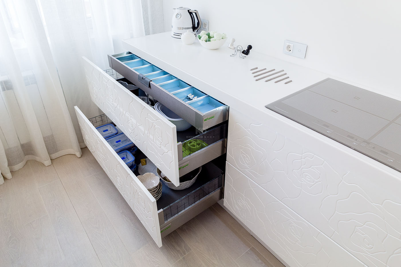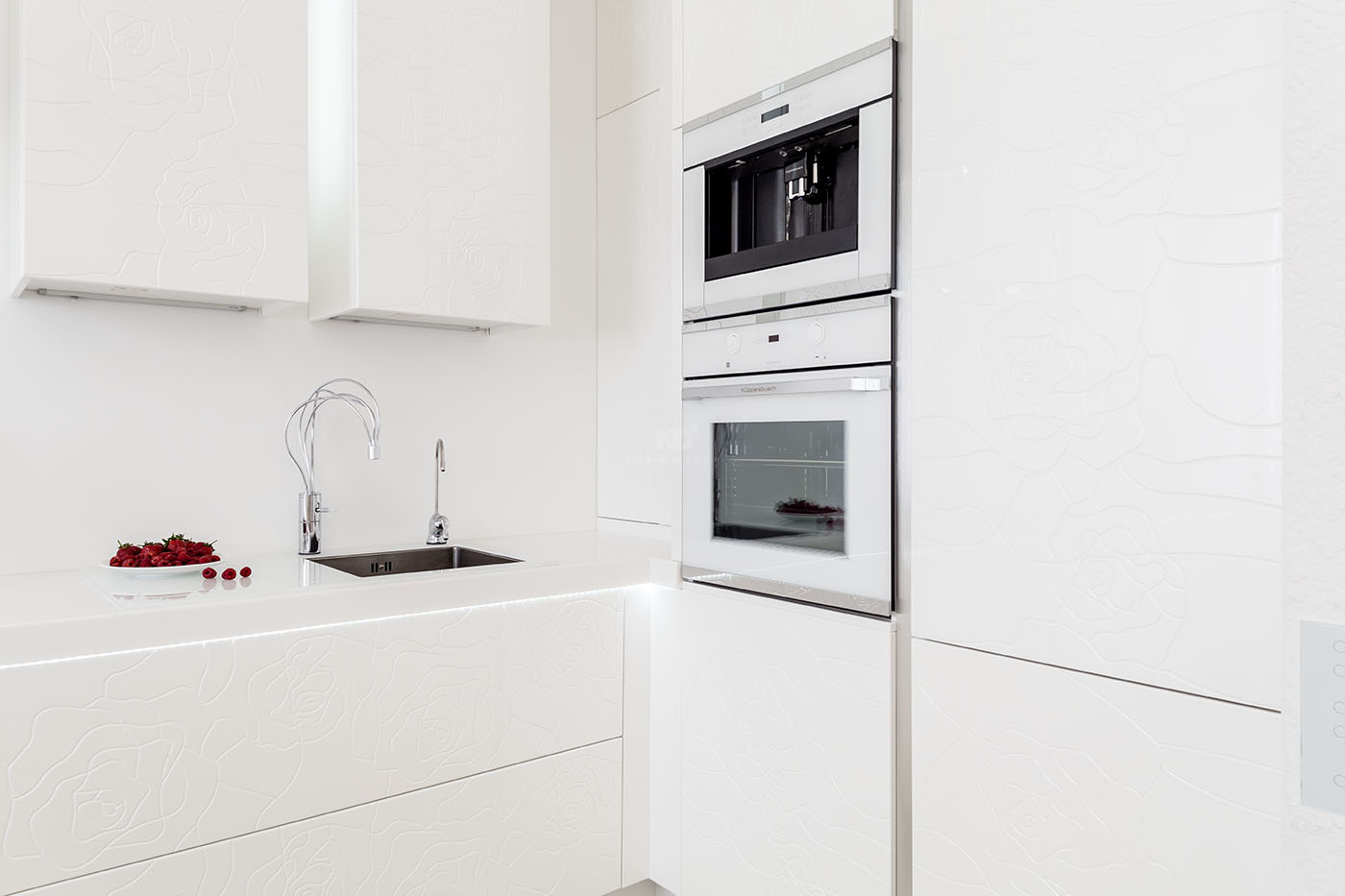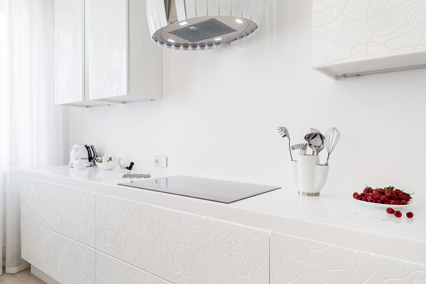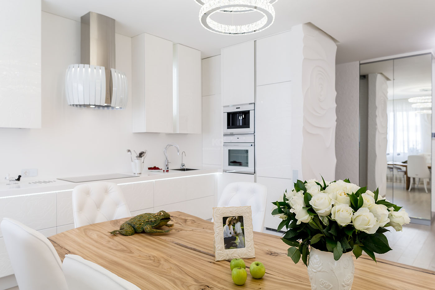 Лёгкость, чистота и большая любовь к белым розам. Эти образы вдохновили Анну на обновление интерьеров, а наших дизайнеров – на создание очередного шедевра! Соединив современный стиль с природными мотивами, «Кухонный Двор» наполнил квартиру нашей клиентки неповторимыми чувствами!