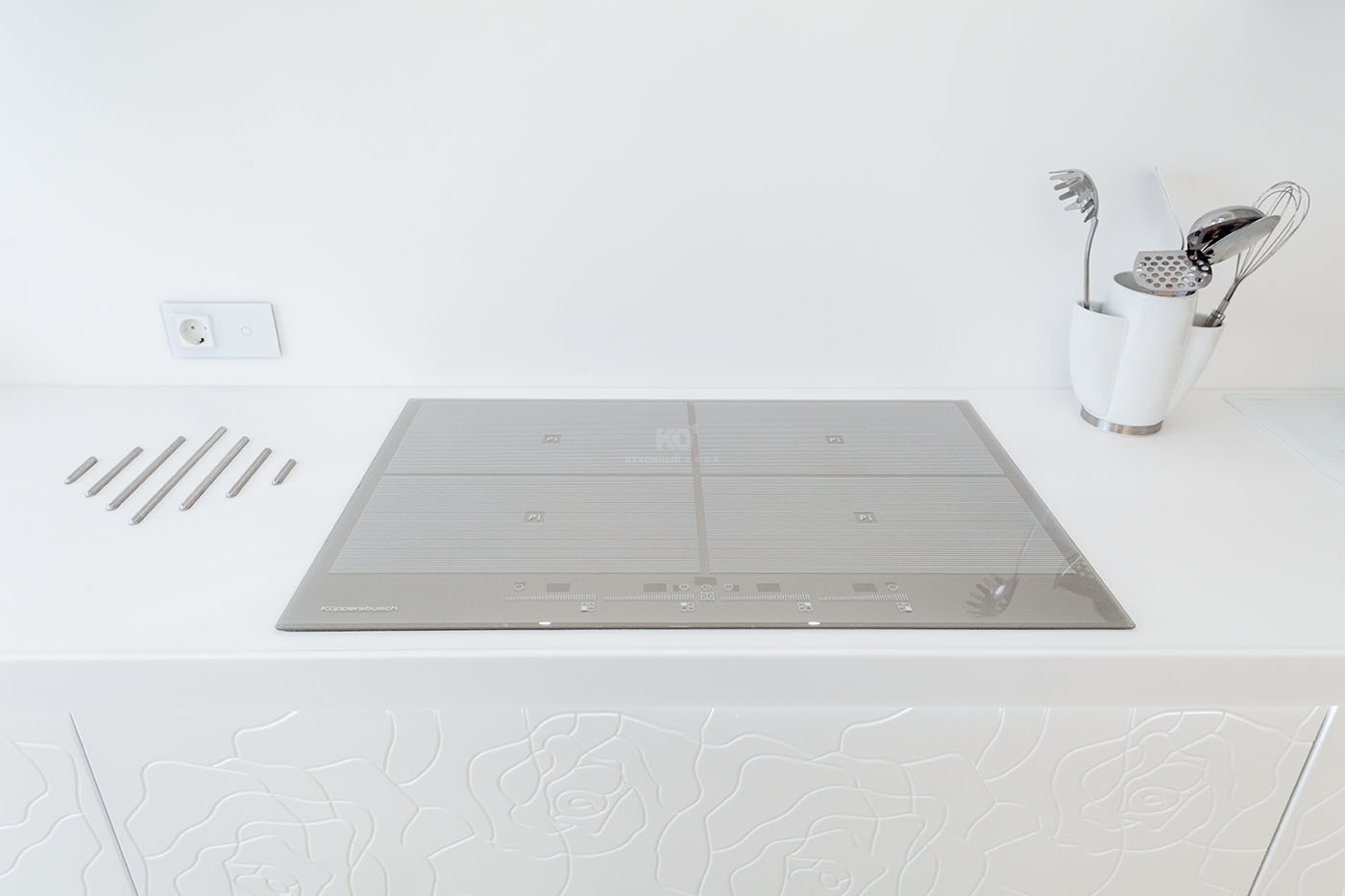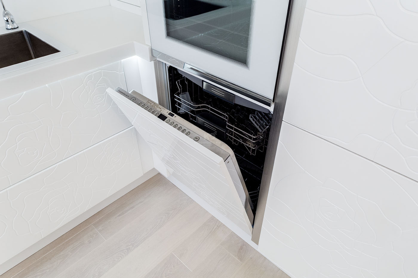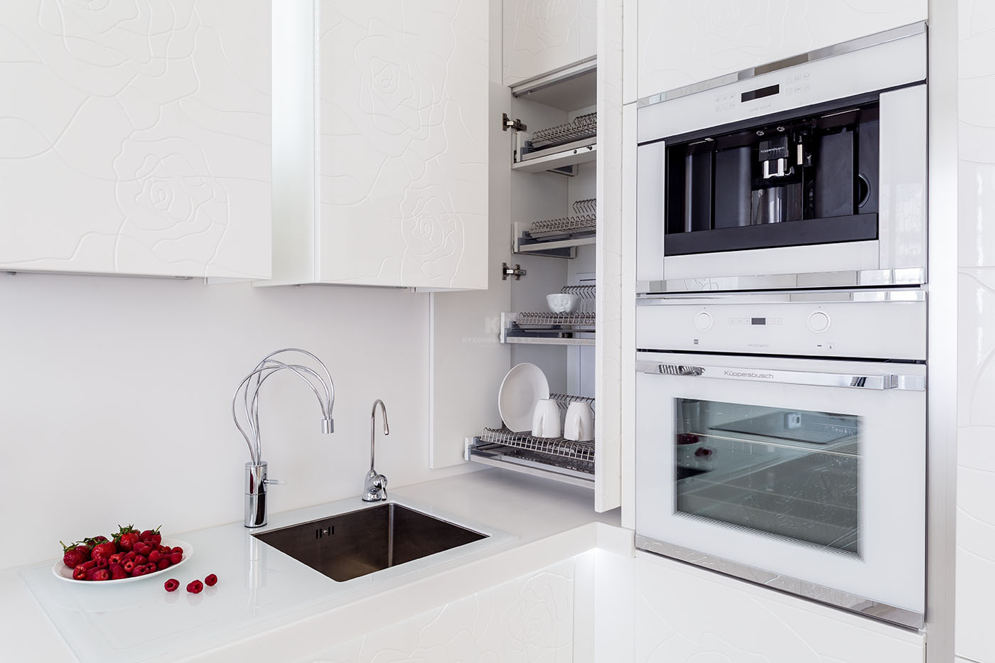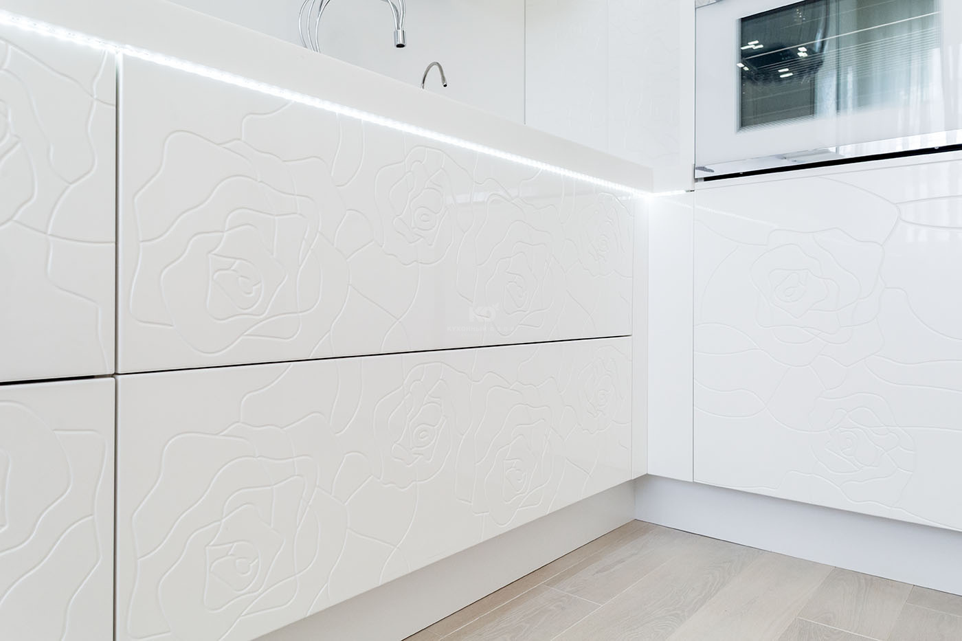 Модерн здесь отнюдь не холоден, а напротив – полон жизни и чувств. Фасады кухни покрывает изящная «цветочная» фрезеровка, а смеситель выглядит словно переплетение тонких стебельков. Эти природные мотивы переходят на стены и шикарную обеденную зону, в сердце которой – массивный стол. Прекрасный в своей естественности, он ставит элегантную точку в образе кухни, превращая ее в тихий, роскошный сад. Именно так должна выглядеть изысканная утончённость!