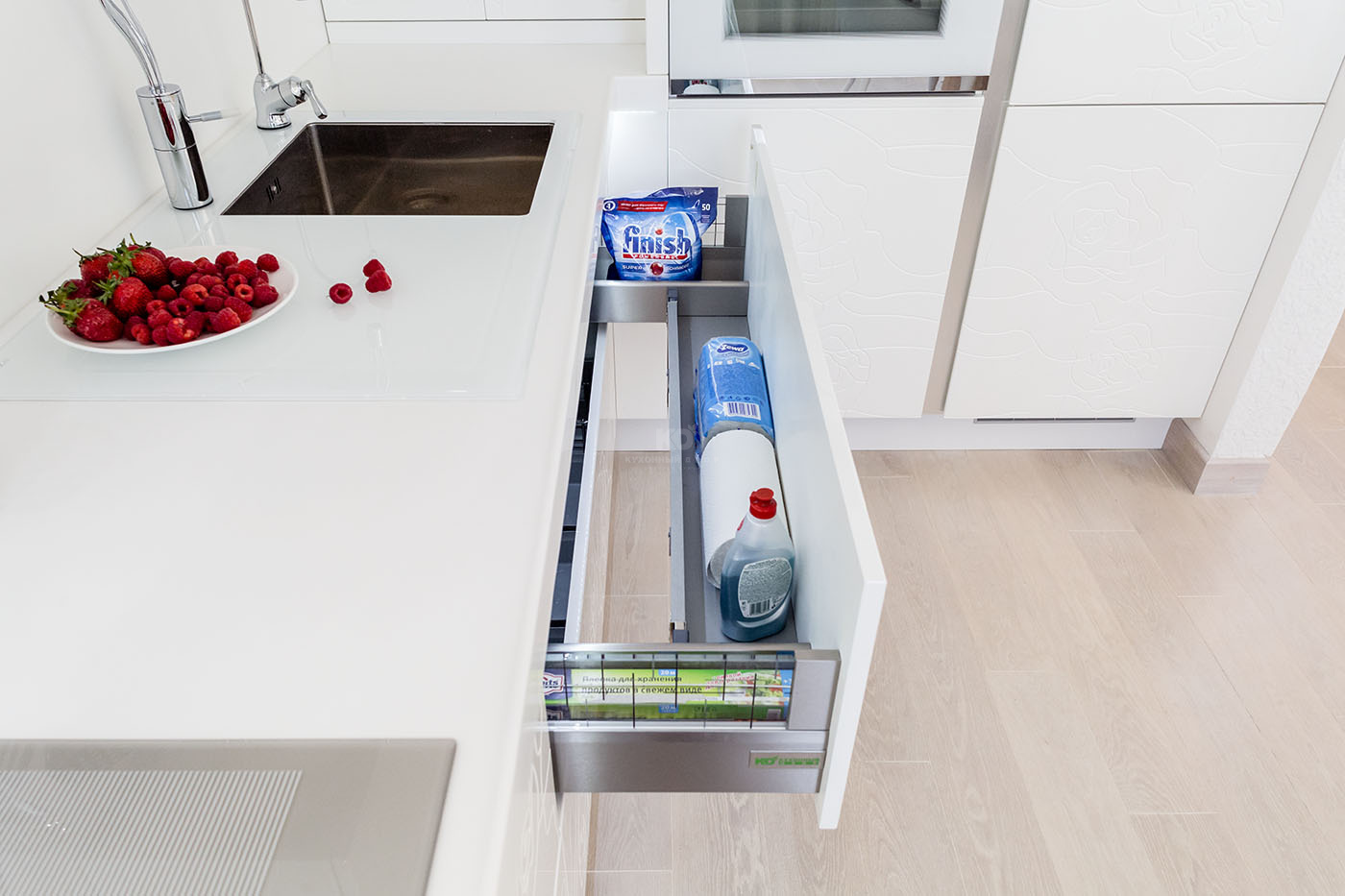 Для оформления кухни Анна выбрала пронзительно-белоснежную модель «Розали». Фасады без ручек и первоклассное техническое оснащение создали безукоризненный образ в стиле модерн. Центром композиции стала футуристическая вытяжка, оснащенная мягкой подсветкой. Ее обтекаемые формы привнесли едва уловимый контраст со строгими пропорциями модулей. Такие «призрачные» контрасты можно увидеть во многих деталях «Розали». И они делают ее неповторимой.
