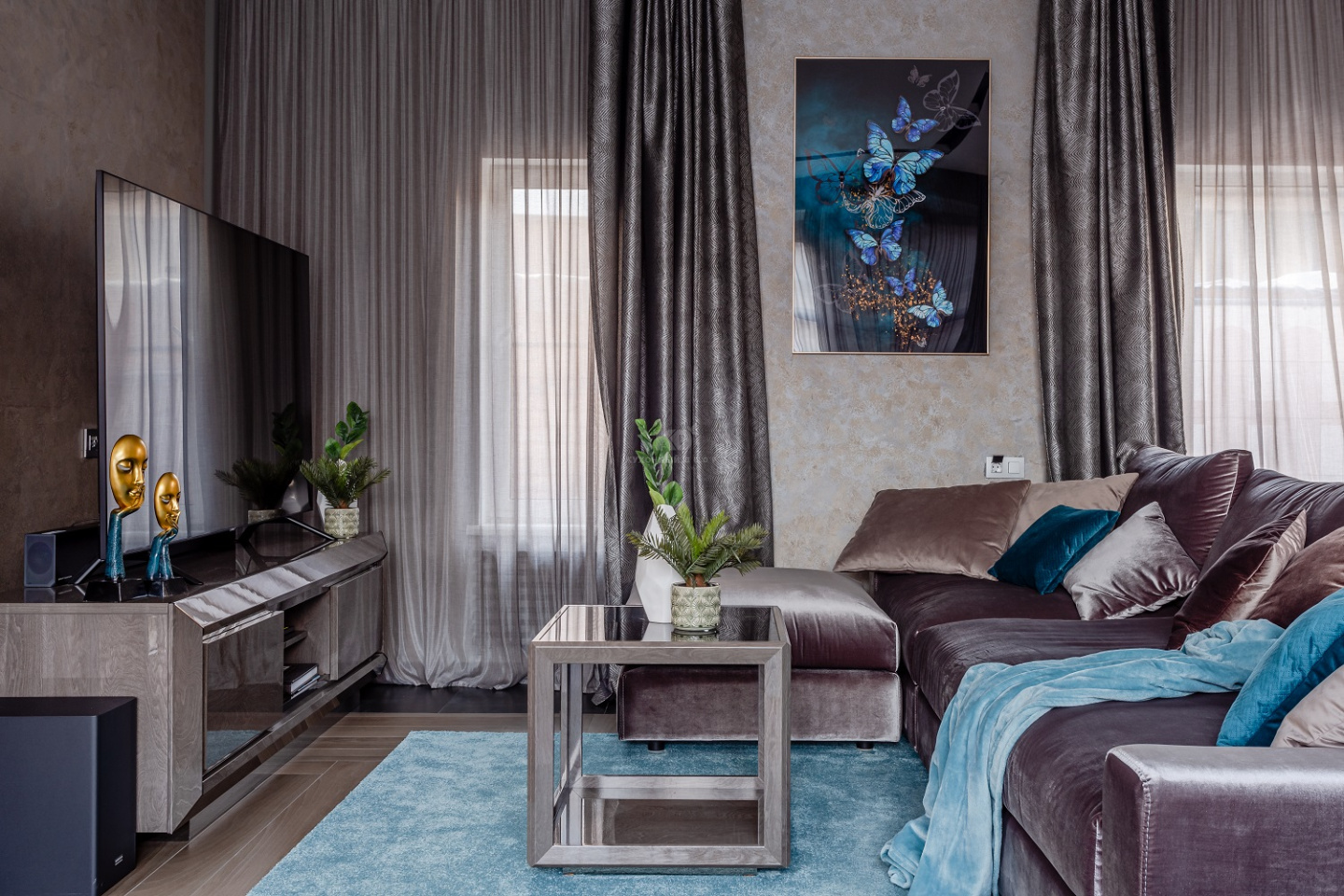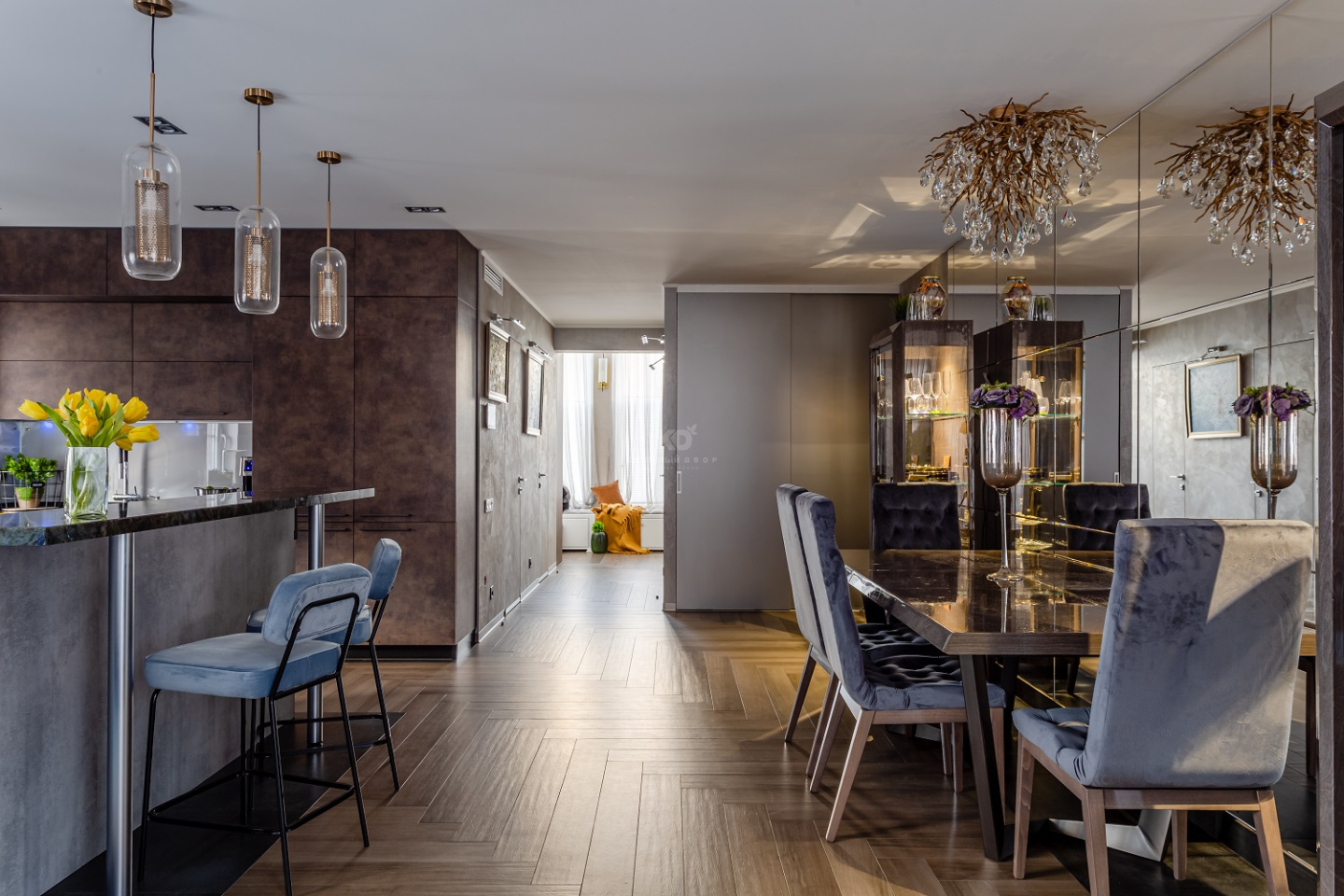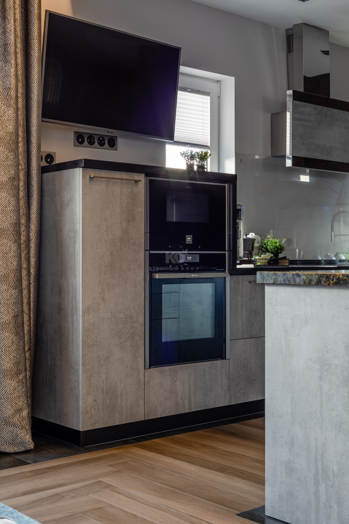 «Металлическая» зона кухни не имеет ручек – её фасады оснащены системой «Tip-On» и открываются лёгким нажатием. А вот область с «бетонными» фасадами, напротив, оснащена лаконичными ручками. Это создает дополнительный лёгкий контраст. Еще одна интересная деталь – столешница. Она соединяет обе зоны кухни, а также «обрамляет» область с духовым шкафом и СВЧ. Такое «Z»-образное обрамление перекликается со столешницей острова, где также есть возвышение в обеденной зоне. Таким образом Александра Панько связывает всё пространство и фактурно, и геометрически.