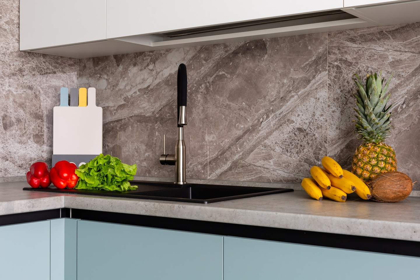 С первого взгляда на «Стоун Колор» можно понять – эта кухня очаровывает, прежде всего, своей лаконичностью. На фасадах из немецкой экоплиты Egger нет видимых ручек, и в нижнем ярусе их роль исполняют скрытые профили системы «Space Line». Они делают монолитный образ модели выразительным, подчёркивают строгие пропорции мебели, а также визуально «приподнимают» столешницу. В цвет профилей «Space Line» выполнен и цоколь, который окончательно задаёт цветовую ритмику «Стоуна».