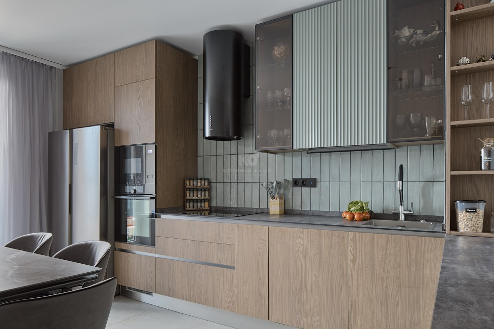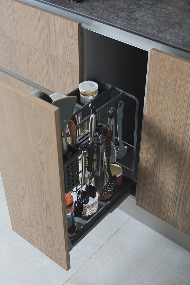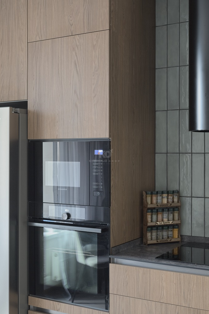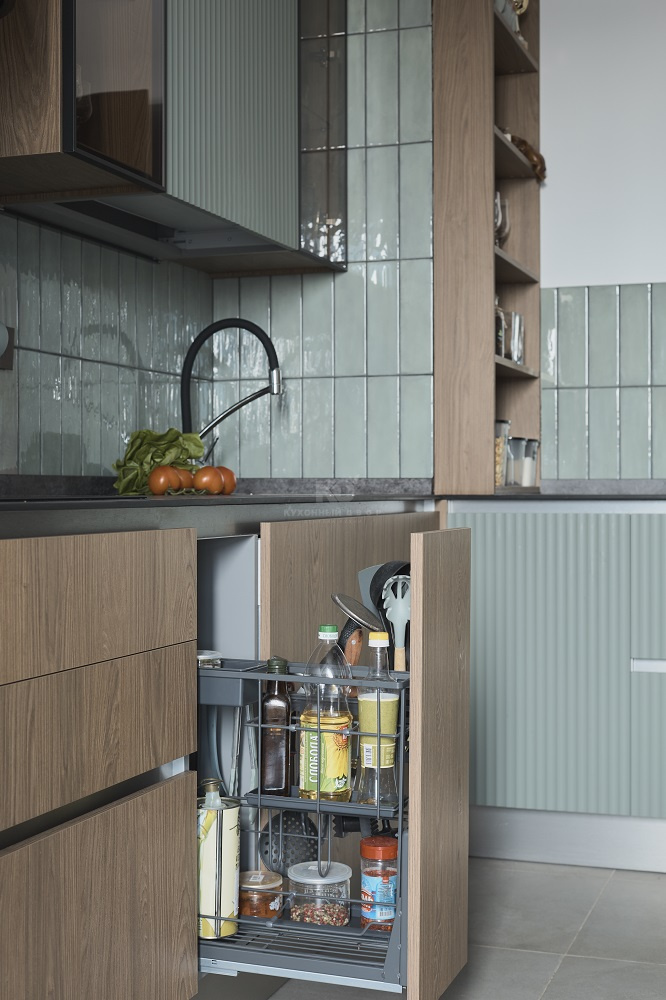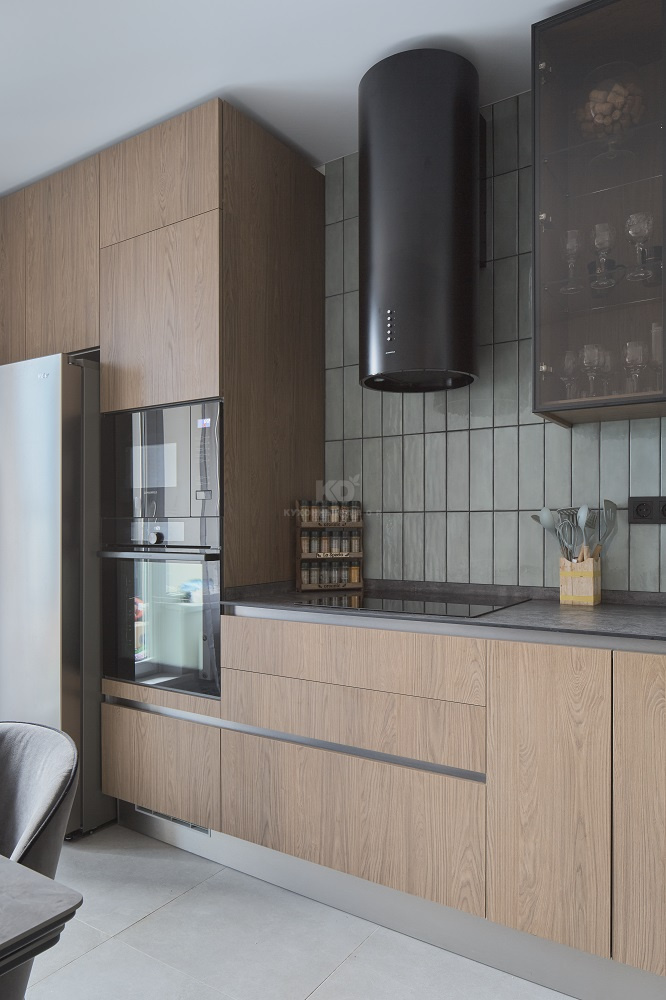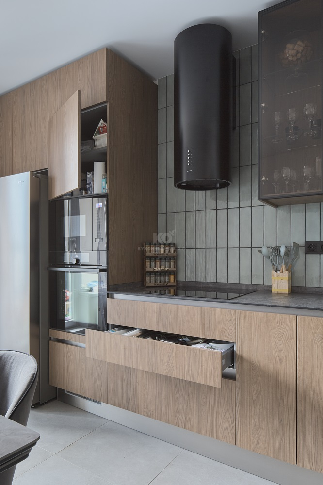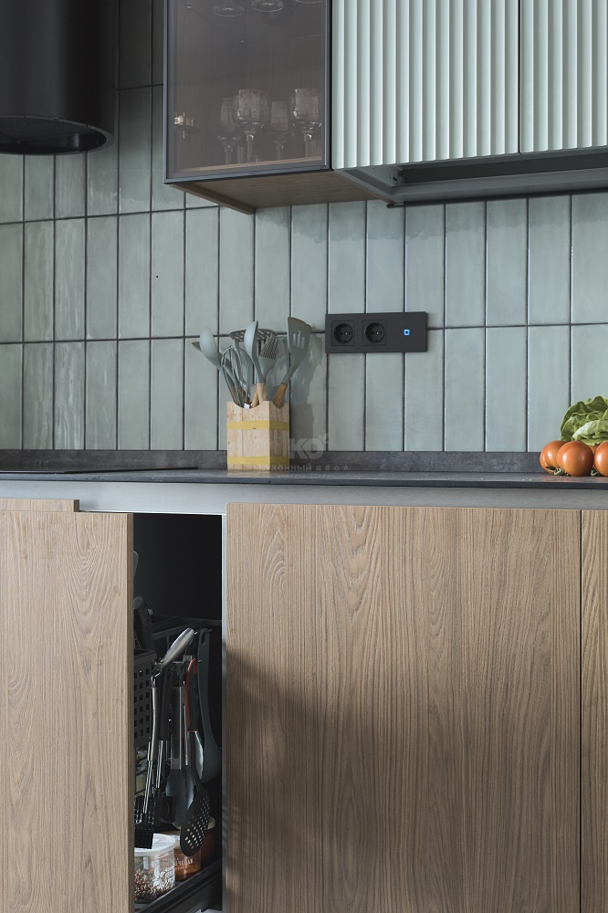 Явные отсылки к «Стоун Вуд» можно заметить, разглядывая фасады. Они выполнены из экоплиты Egger, которая искусно имитирует внешний вид и текстуру натуральной древесины и воплощает первозданную красоту природных материалов. В сочетании с оливковыми деталями кухня выглядит по-настоящему изысканно и натурально, максимально отражая основные черты экостиля. Фасады оснащены инновационной системой открывания без ручек «Space Line», делающей образ монолитным и завершенным. Это – один из реверансов модели «Стоун Вуд + Джейн Вертикаль» в сторону функциональных решений.