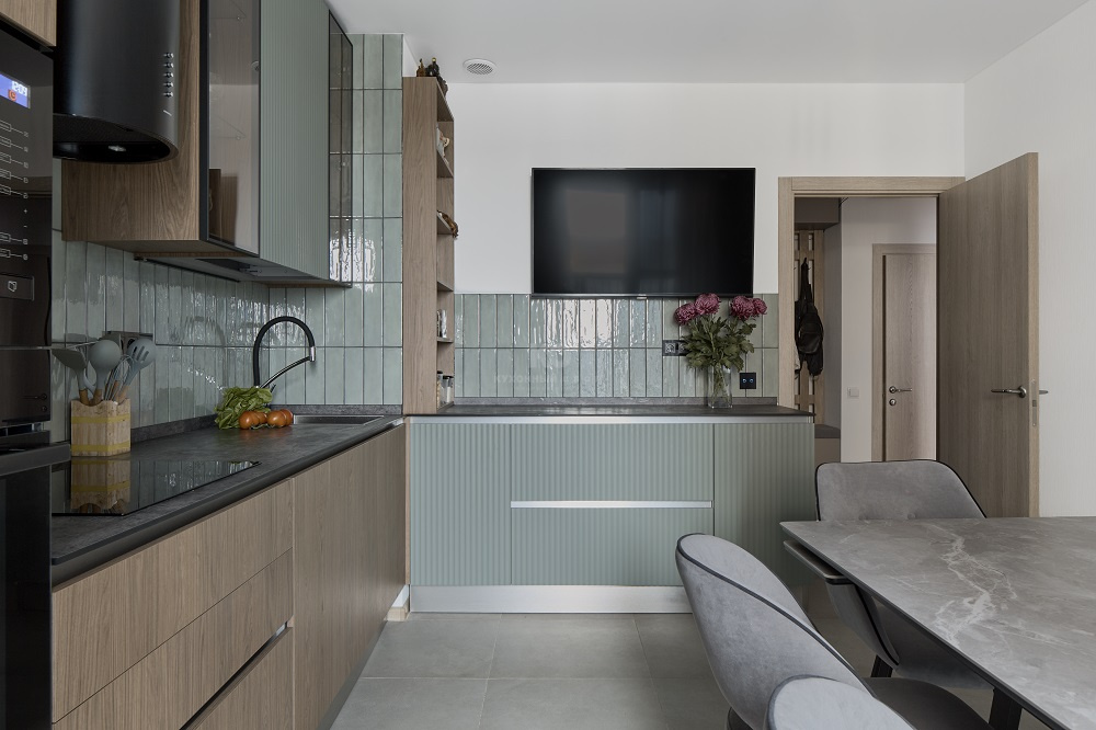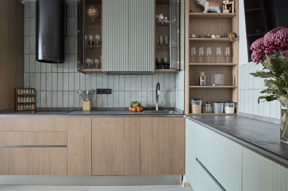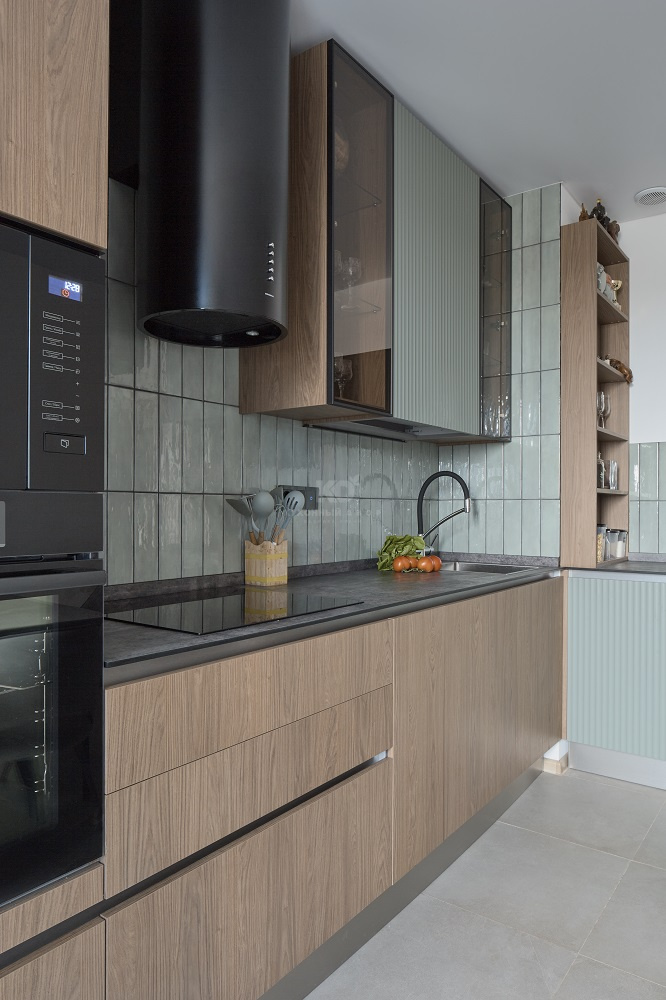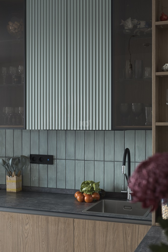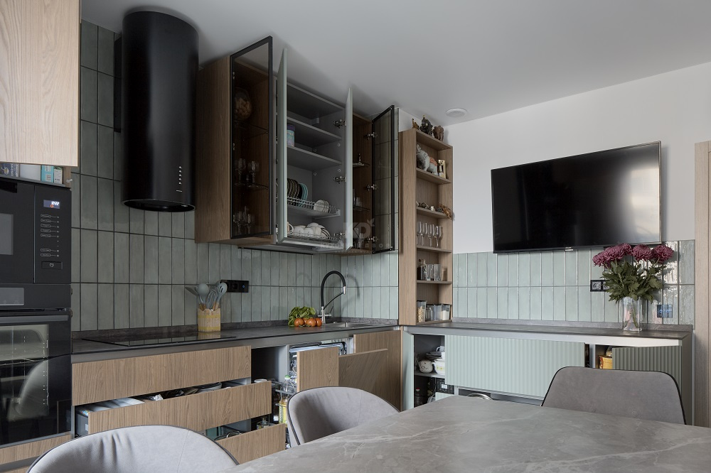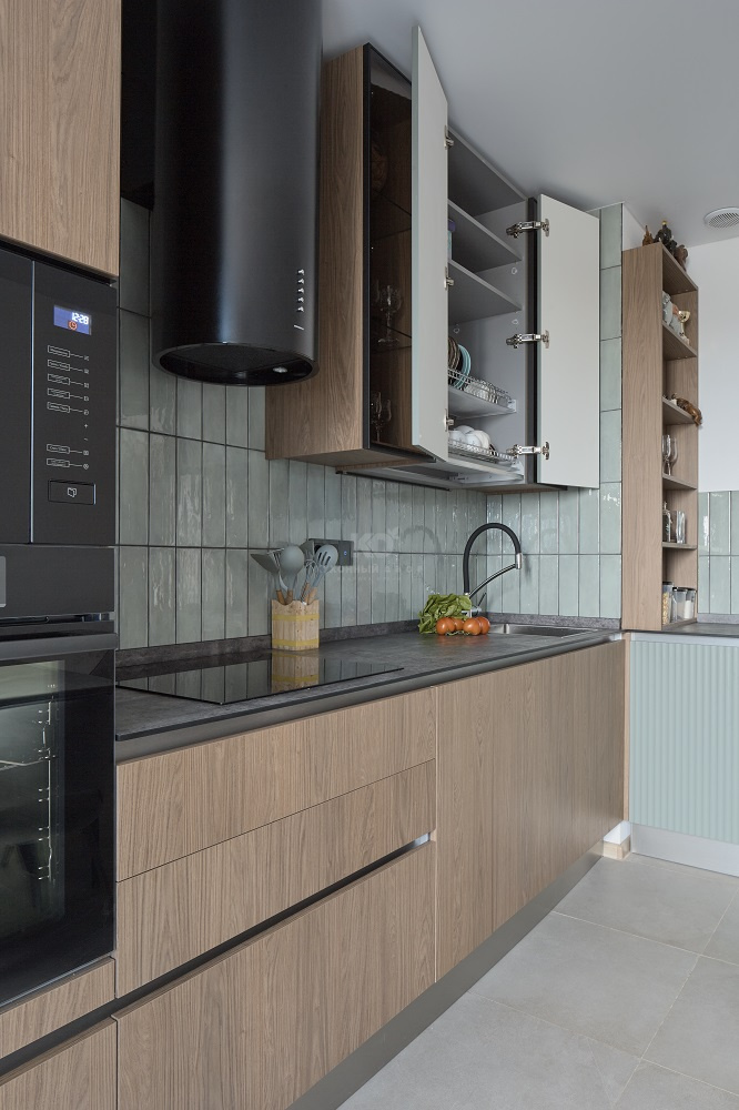 Явные отсылки к «Стоун Вуд» можно заметить, разглядывая фасады. Они выполнены из экоплиты Egger, которая искусно имитирует внешний вид и текстуру натуральной древесины и воплощает первозданную красоту природных материалов. В сочетании с оливковыми деталями кухня выглядит по-настоящему изысканно и натурально, максимально отражая основные черты экостиля. Фасады оснащены инновационной системой открывания без ручек «Space Line», делающей образ монолитным и завершенным. Это – один из реверансов модели «Стоун Вуд + Джейн Вертикаль» в сторону функциональных решений.