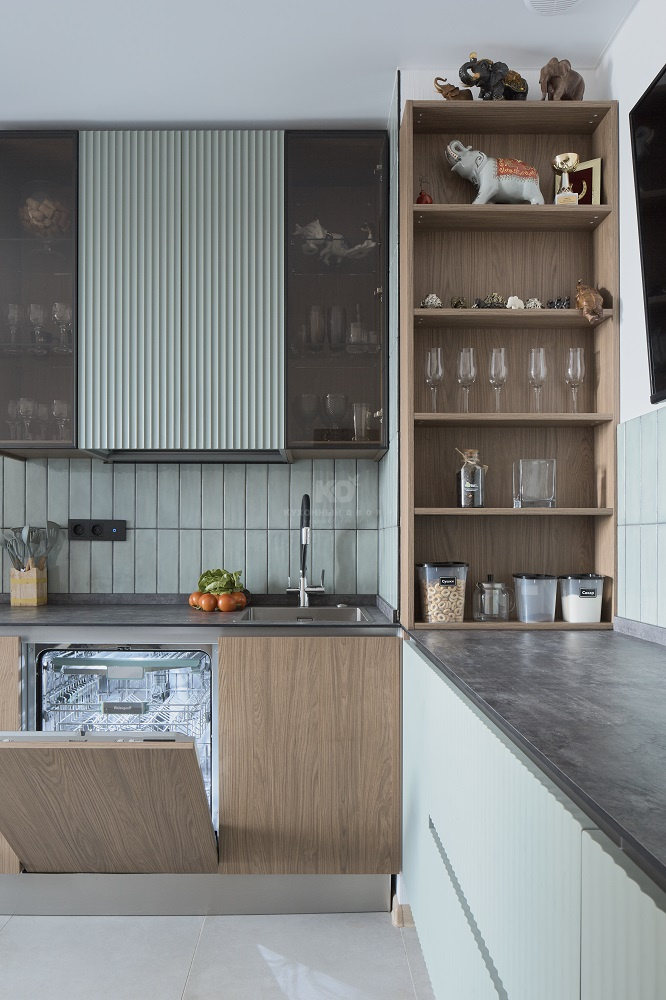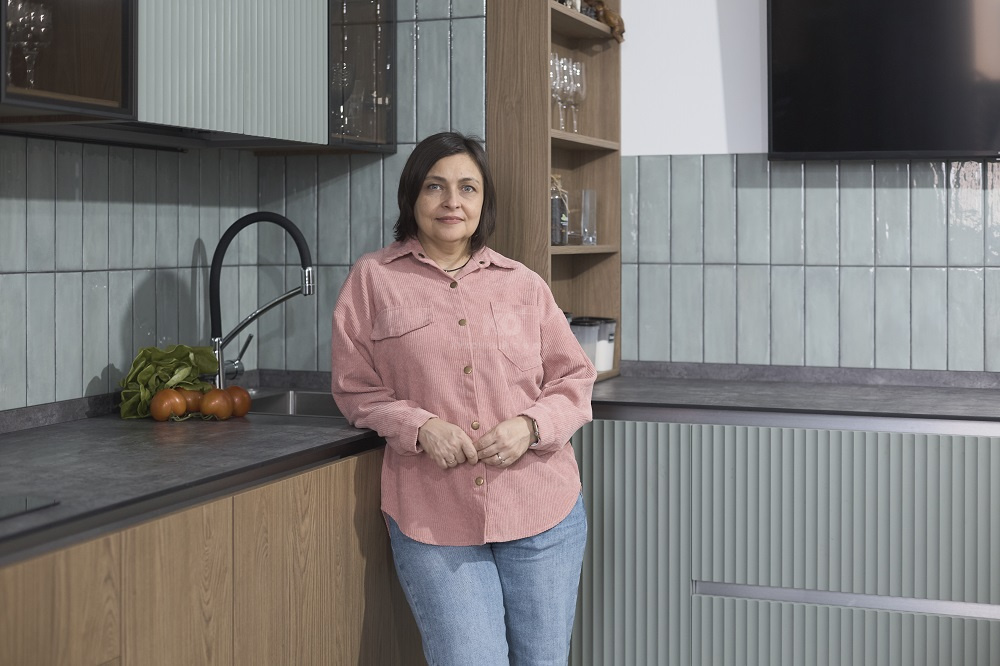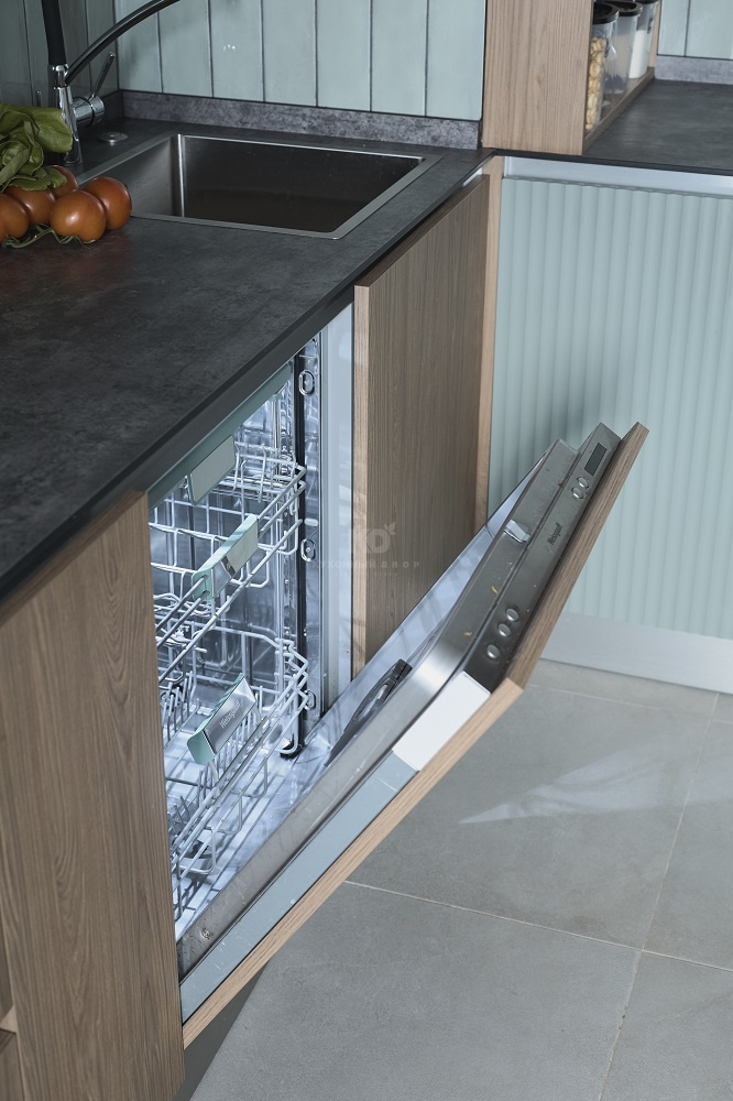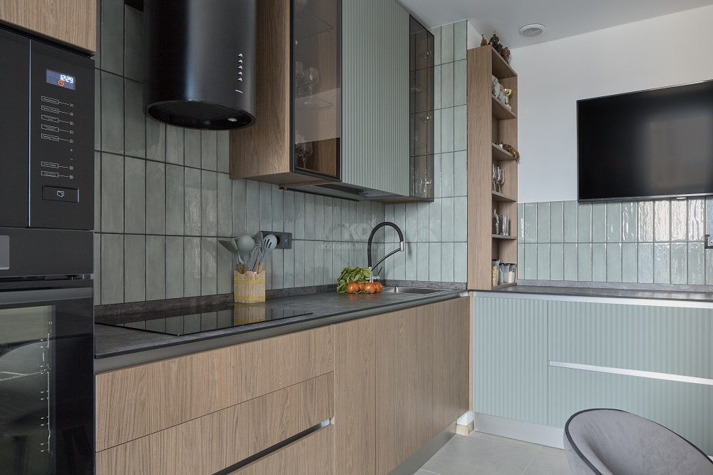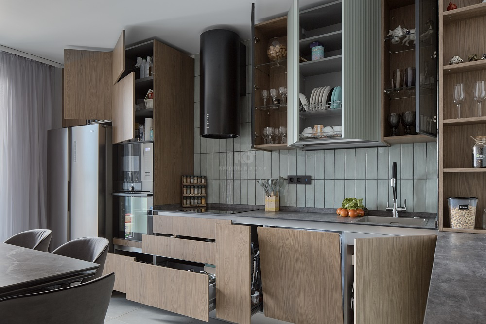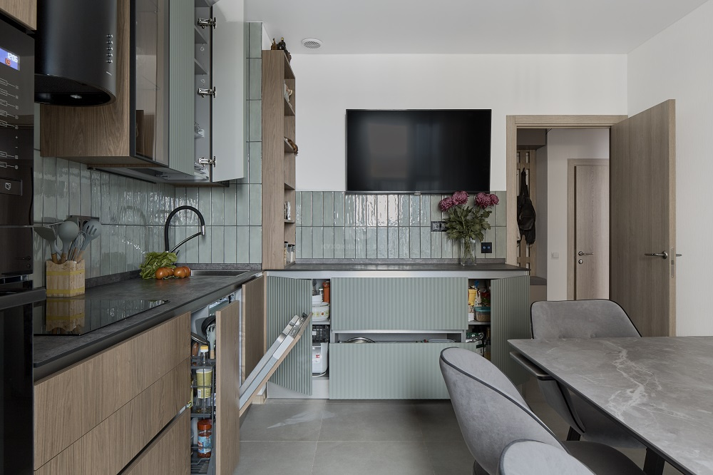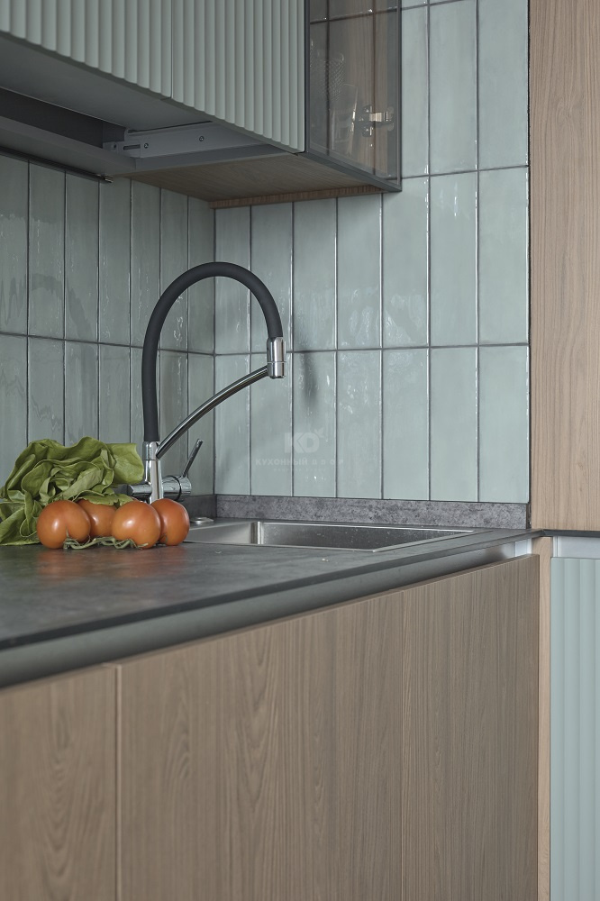 Явные отсылки к «Стоун Вуд» можно заметить, разглядывая фасады. Они выполнены из экоплиты Egger, которая искусно имитирует внешний вид и текстуру натуральной древесины и воплощает первозданную красоту природных материалов. В сочетании с оливковыми деталями кухня выглядит по-настоящему изысканно и натурально, максимально отражая основные черты экостиля. Фасады оснащены инновационной системой открывания без ручек «Space Line», делающей образ монолитным и завершенным. Это – один из реверансов модели «Стоун Вуд + Джейн Вертикаль» в сторону функциональных решений.