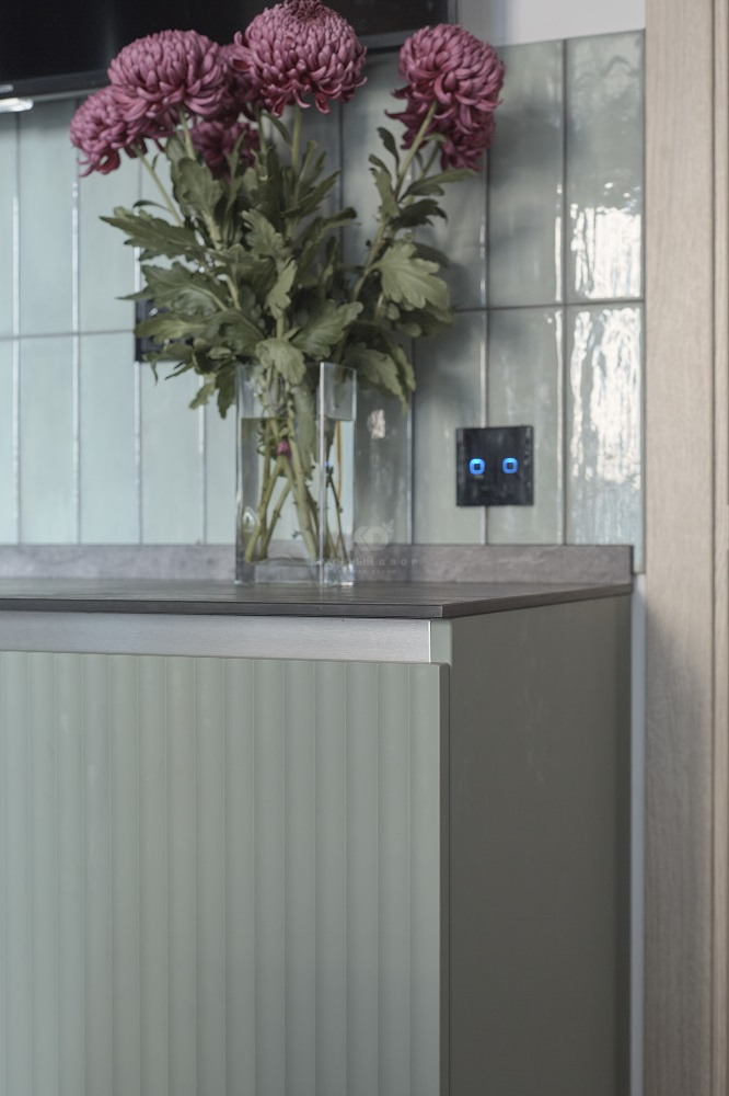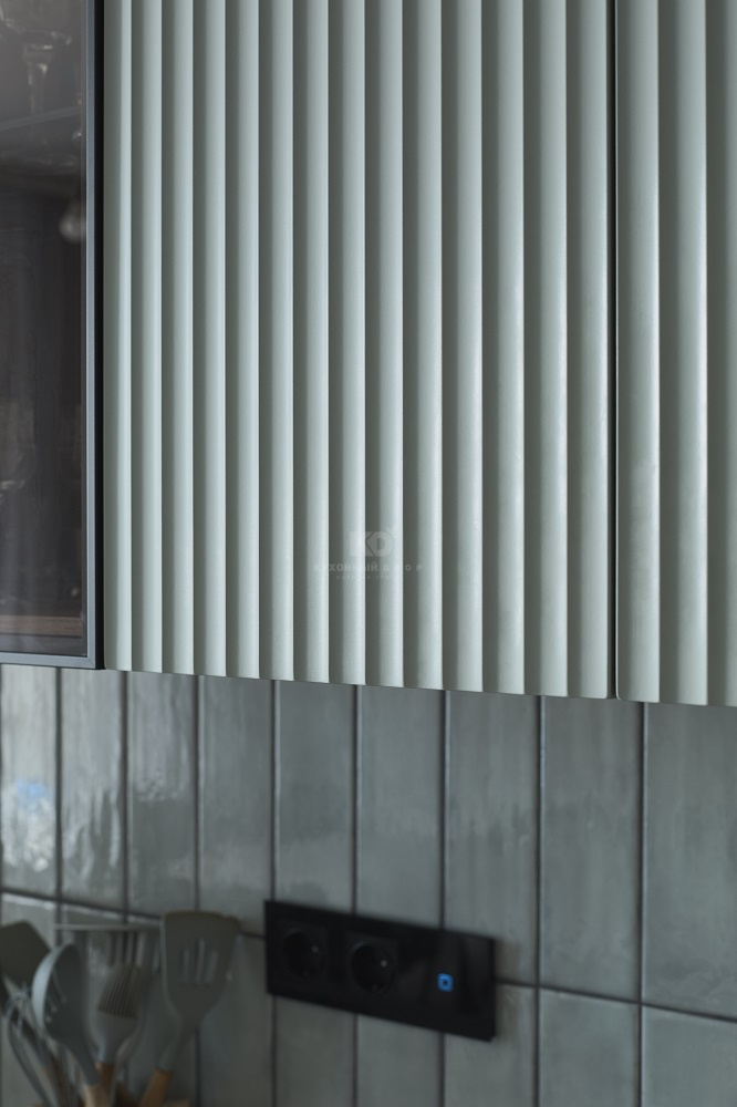 Яркая отличительная черта кухни «Джейн Вертикаль» – удивительной красоты фасады с вертикальной фрезеровкой. Волнообразный узор высокой частоты – эксклюзивная характеристика этой модели, которая была заимствована при создании нашего нового гарнитура. Фрезеровка на оливковом фоне задает особое умиротворенное настроение.