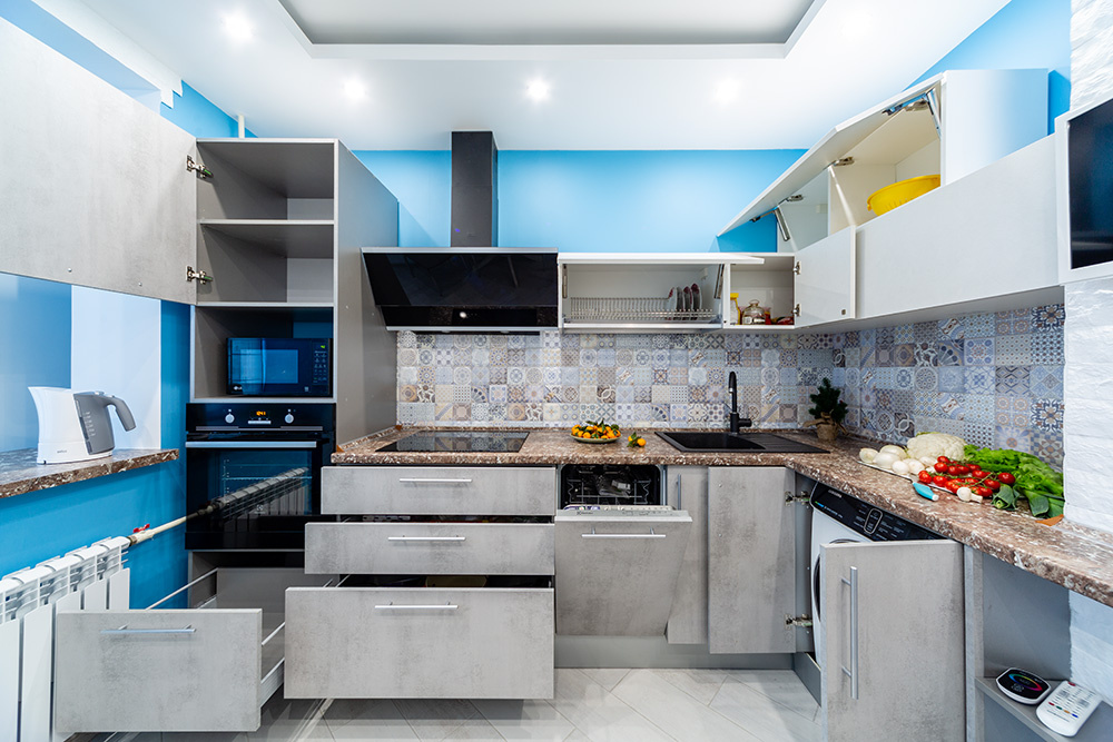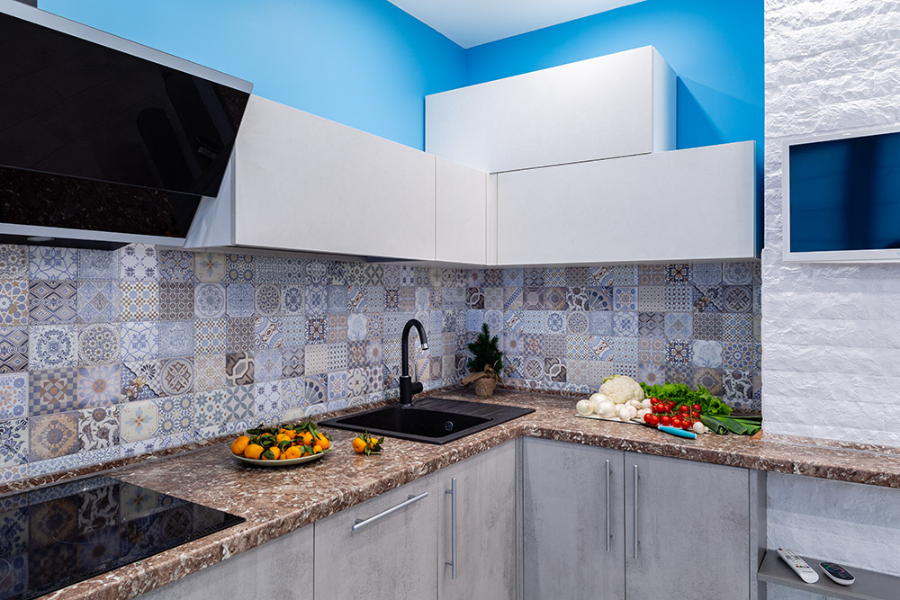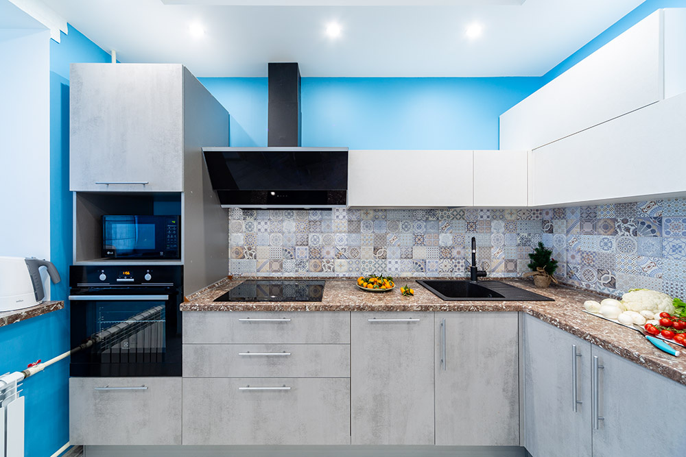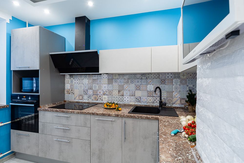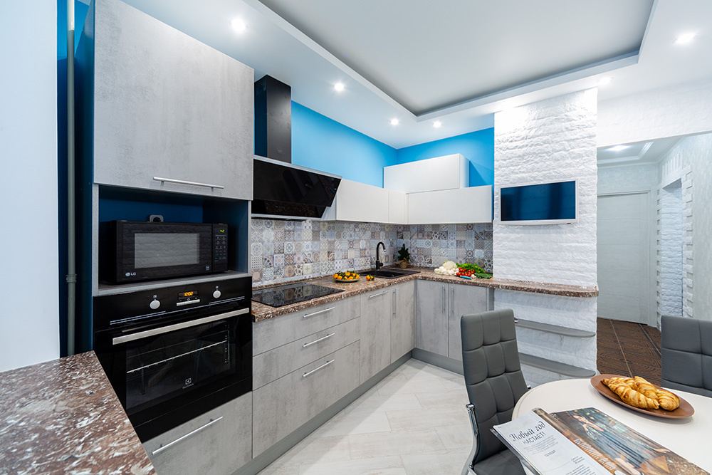 Хозяева выбрали для фасадов цвет и фактуру необработанного серого камня. Выглядит строго и основательно, как и столешница с крупнозернистым «гранитным» рисунком. Но почему же весь образ кухни смотрится столь «воздушно»? Секрет в мелких деталях! Взгляните на ящики верхнего яруса! Они отличаются от нижних по тону и не имеют ручек, благодаря чему даже брутальный «лофт» не выглядит «тяжело». Края столешницы и открытых полок тоже вносят свой штрих. Они скруглены, что смягчает геометрию кухни. А оригинальный фартук в технике печворк и стены в белых и голубых тонах делают «Стоун» еще более уютным. На ум приходят лишь два слова – простор и красота!