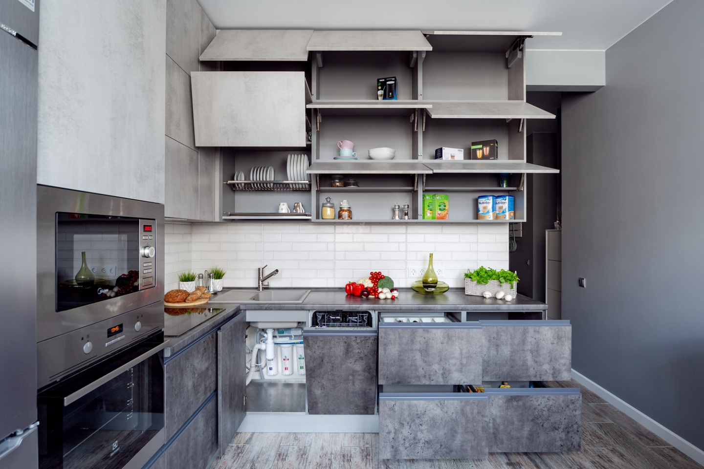 • Прием второй – отказ от ручек в классическом понимании этого слова. Фасады нижнего яруса здесь имеют скрытые интегрированные ручки. А верхний ярус оснащен особой фурнитурой «BLUM», позволяющей открывать модули лёгким нажатием. Отличное решение для трёхъярусных проектов в современной стилистике!
