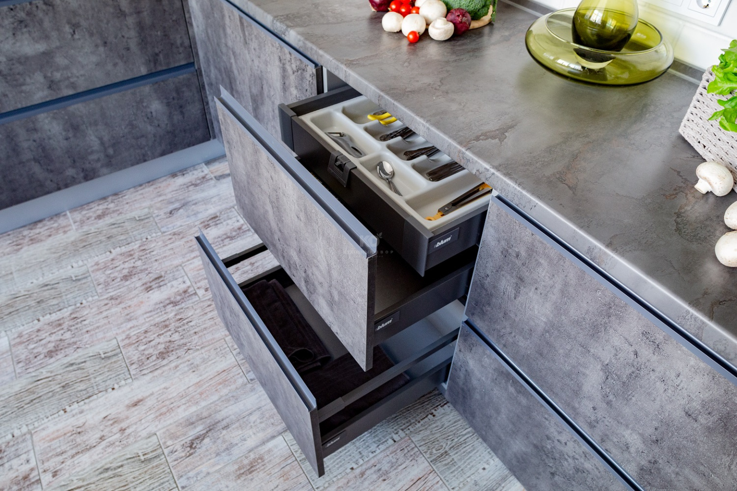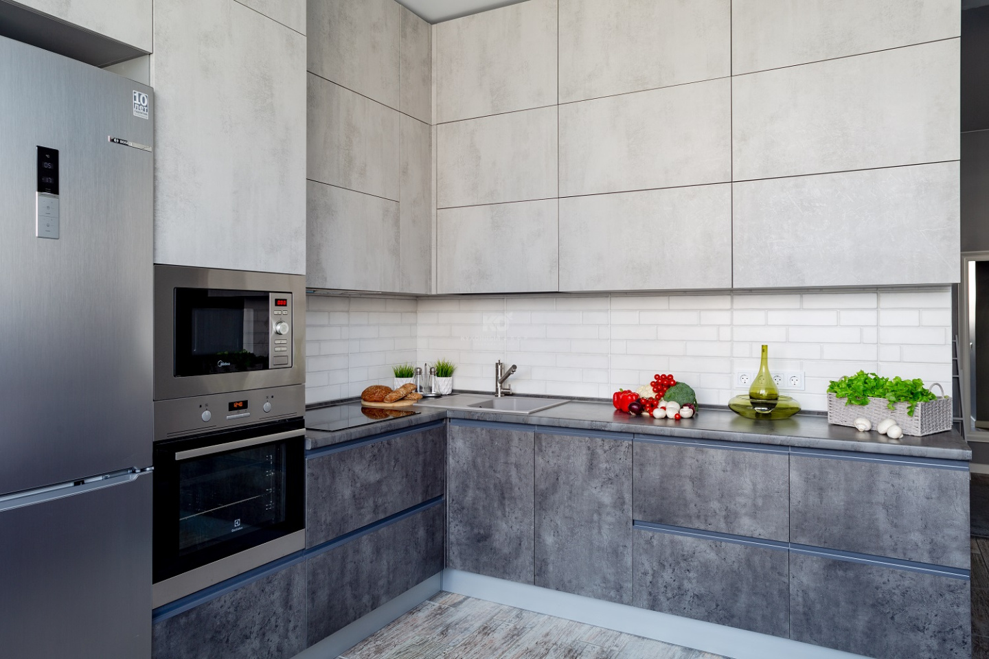 Чтобы зарядить кухню такими эмоциями, наши дизайнеры использовали фасады из немецкой экоплиты «Egger». Благодаря им «Стоун» выглядит так, словно сделан из настоящего бетона. Причем эта иллюзия сохраняется, даже когда Вы прикасаетесь к поверхностям! Экоплита –инновационный материал, способный дарить ни с чем несравнимые тактильные ощущения. К «Стоуну» хочется прикасаться снова и снова!