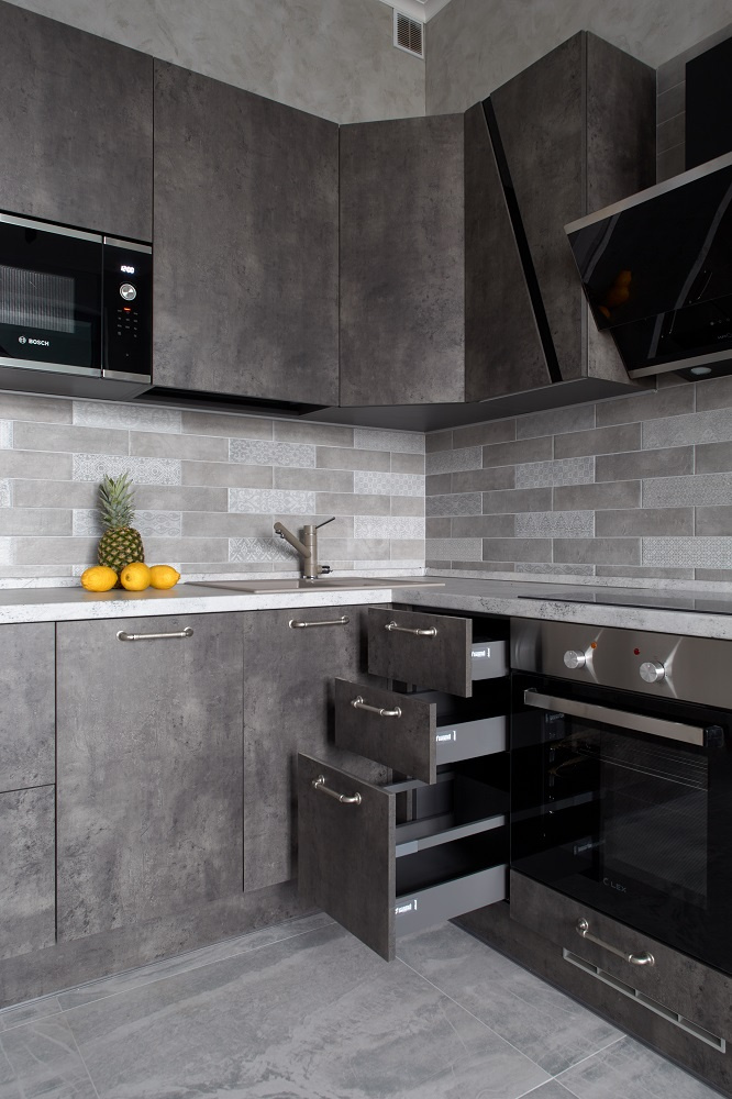 Что больше всего ценит в кухонной мебели признанный мастер актёрского искусства? Надёжность, удобство и лаконичность. Угловой «Стоун» соответствует каждой из этих ценностей! Его внешность строга, брутальна и не имеет ни единой лишней детали. Кажется, будто фасады «Стоуна» выполнены из бетона, но на самом деле это лёгкая и прочная эклоплита Egger (Германия). Материал излучает благородную уверенность, без которой не обходится практически ни одна «мужская» кухня. Впрочем, уверенность здесь не переходит в грубость, ведь мы оснастили «Стоун» парой изящных фасадов с косыми стеклянными вставками, а также светлой столешницей «Slotex» из HPL. Благодаря этим элементам гарнитур по-особому «звучит» в интерьерах, не перегружая и не загромождая их.