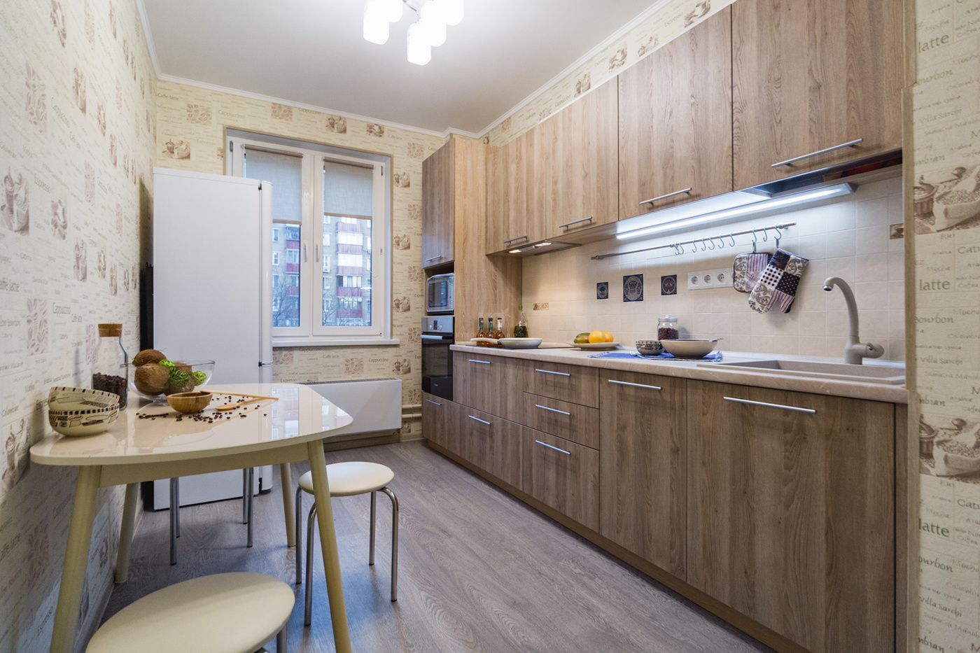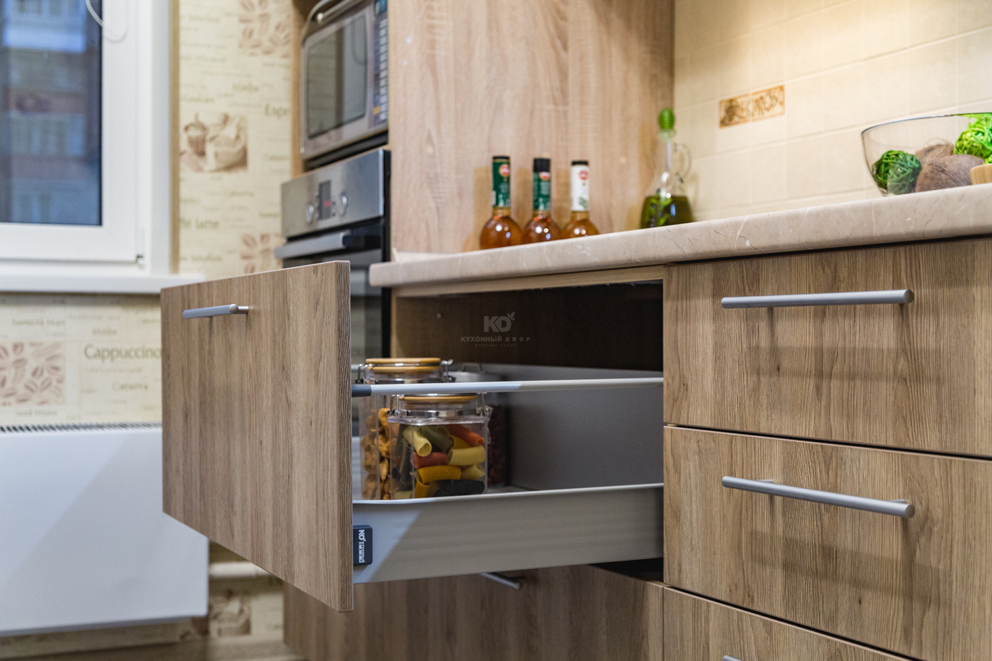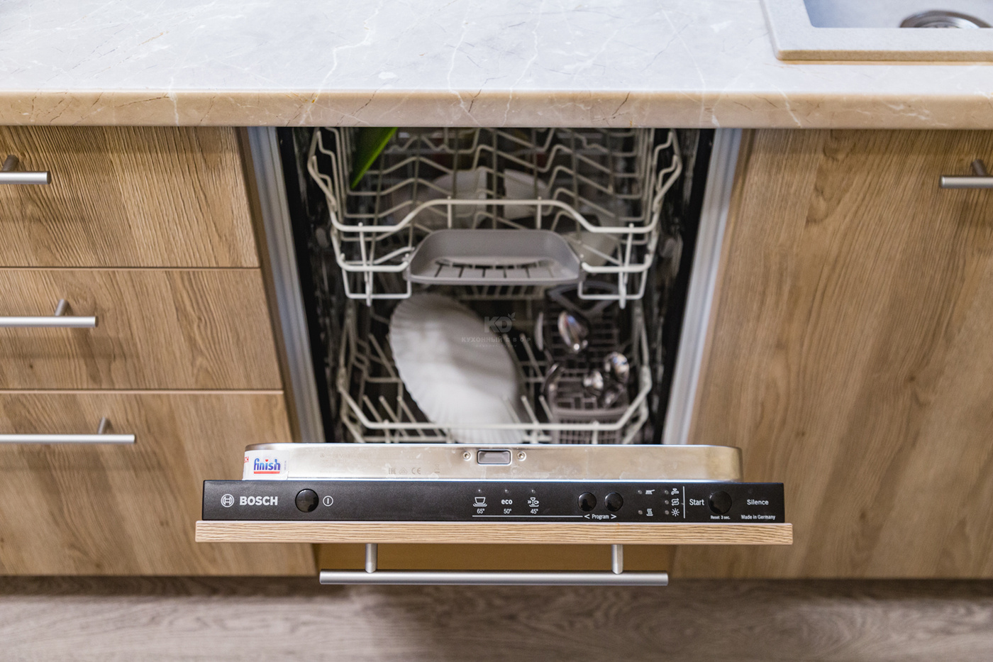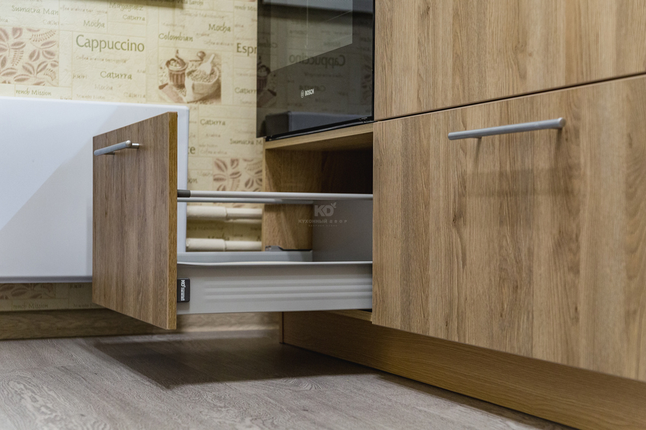 Кухня для молодой семьи, в которой есть маленький ребенок, должна быть безопасной, удобной, качественной, не маркой и, конечно, красивой! Наши клиенты - счастливая семья с малышом, тоже выбрали для своей новой квартиры модель «Уна» из немецкой коллекции «Kuchen Hof». Материал фасадов - экоплита Egger - покорил молодую маму своей необычной фактурой - она полностью имитирует натуральное дерево. Впоследствии выяснилось, что этот материал не только красив, но невероятно практичен: не маркий, устойчив к внешним воздействиям, в частности, царапинам и ударам. В доме, где есть маленький ребенок, такие свойства фасадов незаменимы. Внутреннее наполнение гарнитура соответствует запросам современной мамы, для которой самое главное в приготовлении еды - экономия времени, удобство и безопасность.