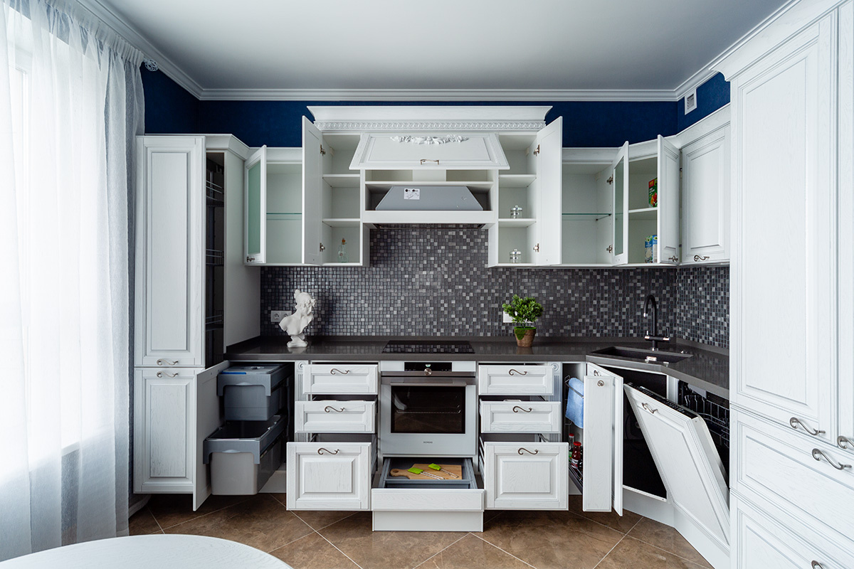 Внешний облик этой кухни призван восхищать, а внутреннее наполнение – дарить максимальный комфорт. «Виконт» оснащен современным духовым шкафом, индукционной варочной панелью, мощной компактной вытяжкой, посудомоечной машиной и огромным двухстворчатым холодильником. Для посуды, утвари и продуктов длительного хранения предусмотрено множество вместительных ящиков, а также каскадные зоны хранения и выкатные системы.