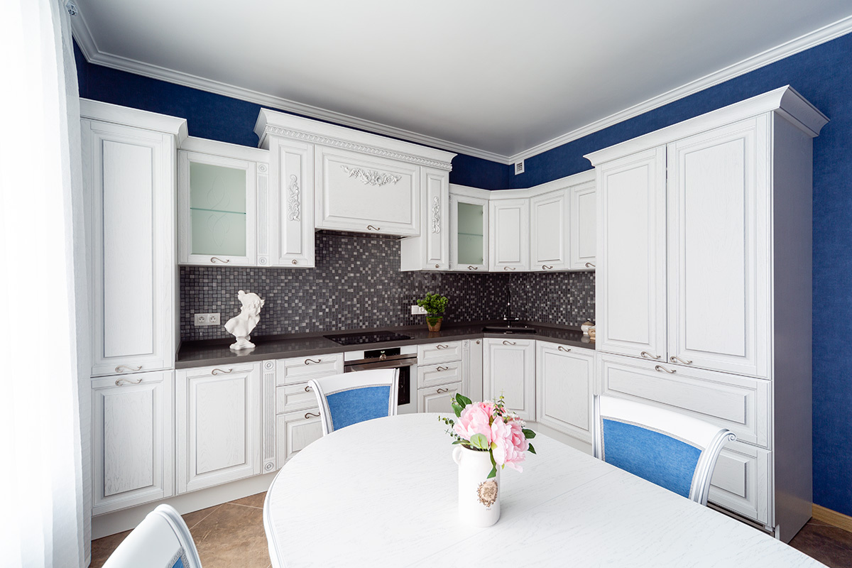 Белоснежные фасады из массива дуба, строгая прямоугольная фрезеровка, изящные пилястры, роскошная лепнина в зоне портала, элегантные карнизы, матированные витражи… Облик этого гарнитура – чистейшая, выкристаллизованная классика! Её строгие нормы соблюдены во всём, начиная от общего построения композиции, и завершая выбором самых мелких деталей. Каждая линия, вплоть до изгибов витиеватых ручек, подобрана с бесконечным вниманием. Ведь именно этого и хотела хозяйка: красоты, созданной по канонам.