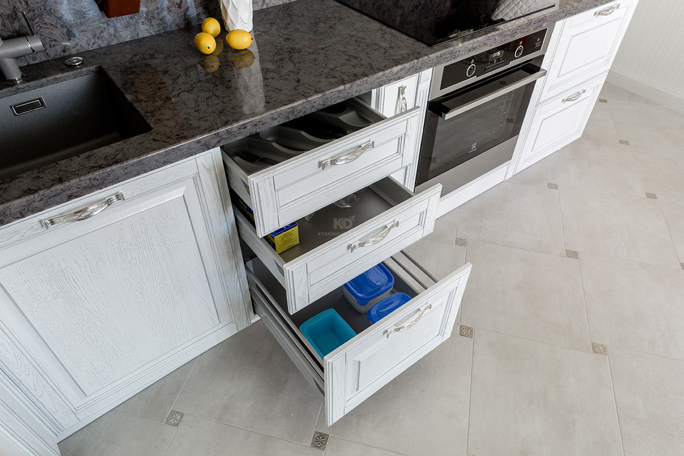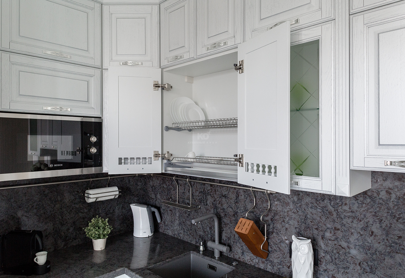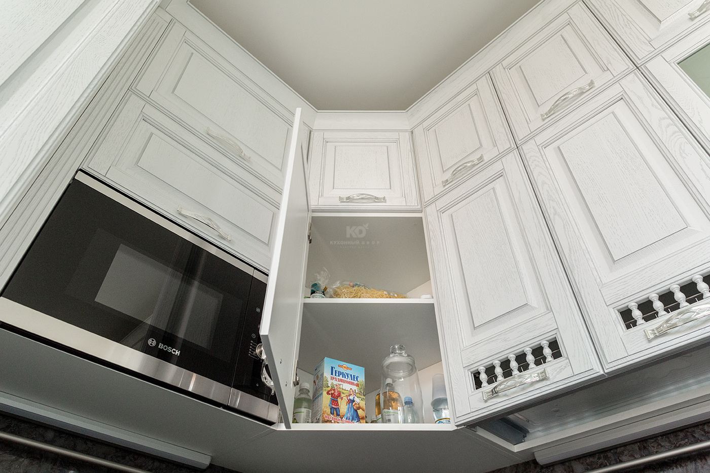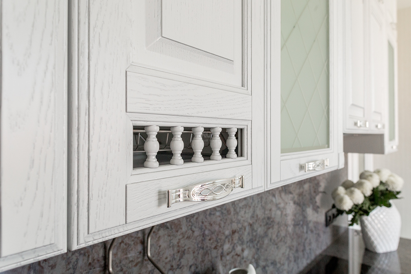Скользните взглядом по кружеву серебристых ручек. Задержитесь на украшенных классической фрезеровкой фасадах из массива дуба. Оцените красоту изящных балюстрад и матовых витражей в верхних модулях. Взгляните, как элегантно верхние и нижние ящики связаны фартуком, точно подобранным в цвет столешницы из кварцевого агломерата. Гарнитур выглядит безукоризненно и по-настоящему роскошно. Его образ – не мозаика из проверенных временем дизайнерских решений. Напротив, в нем сквозит абсолютная цельность, присущая настоящим шедеврам.