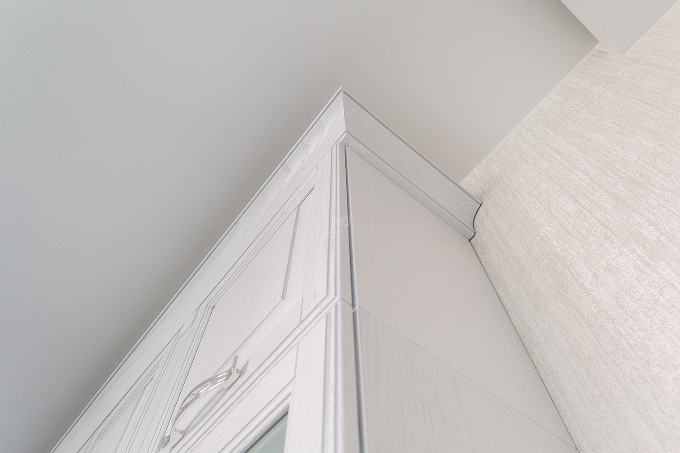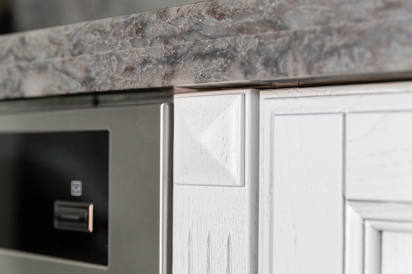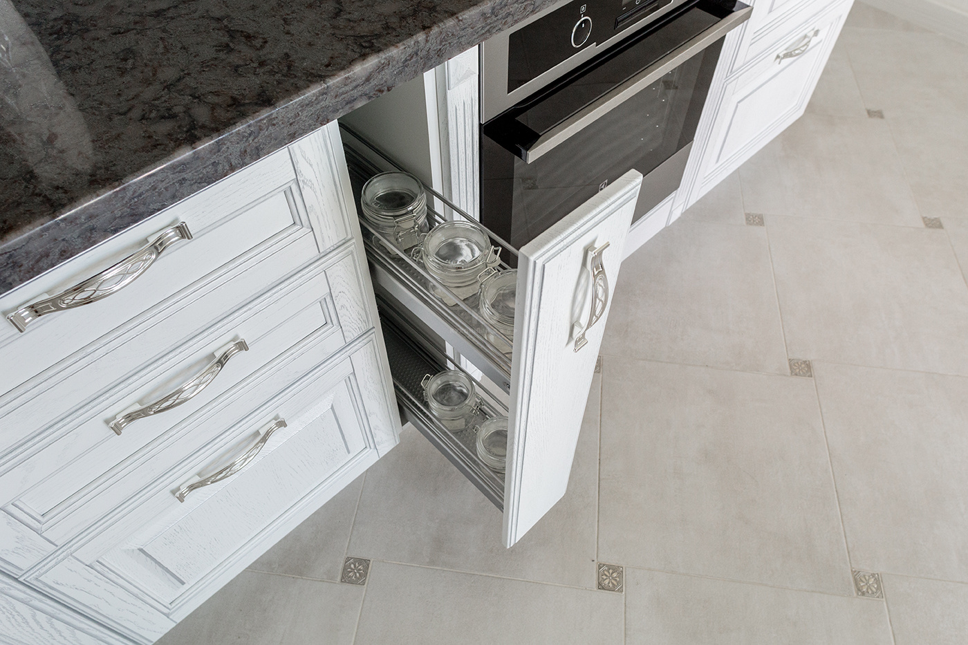 Скользните взглядом по кружеву серебристых ручек. Задержитесь на украшенных классической фрезеровкой фасадах из массива дуба. Оцените красоту изящных балюстрад и матовых витражей в верхних модулях. Взгляните, как элегантно верхние и нижние ящики связаны фартуком, точно подобранным в цвет столешницы из кварцевого агломерата. Гарнитур выглядит безукоризненно и по-настоящему роскошно. Его образ – не мозаика из проверенных временем дизайнерских решений. Напротив, в нем сквозит абсолютная цельность, присущая настоящим шедеврам.