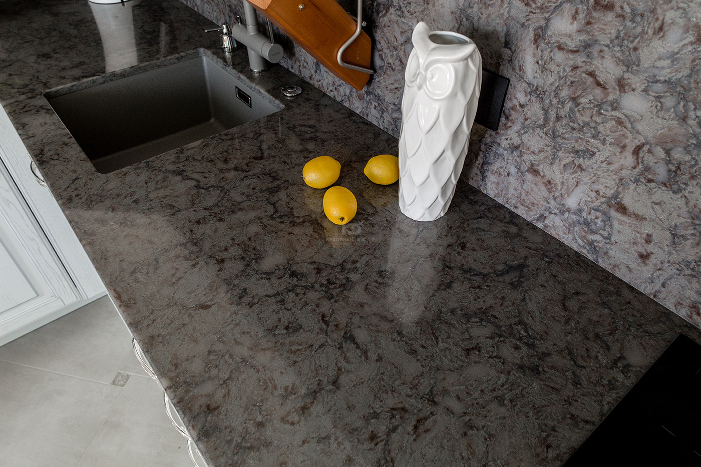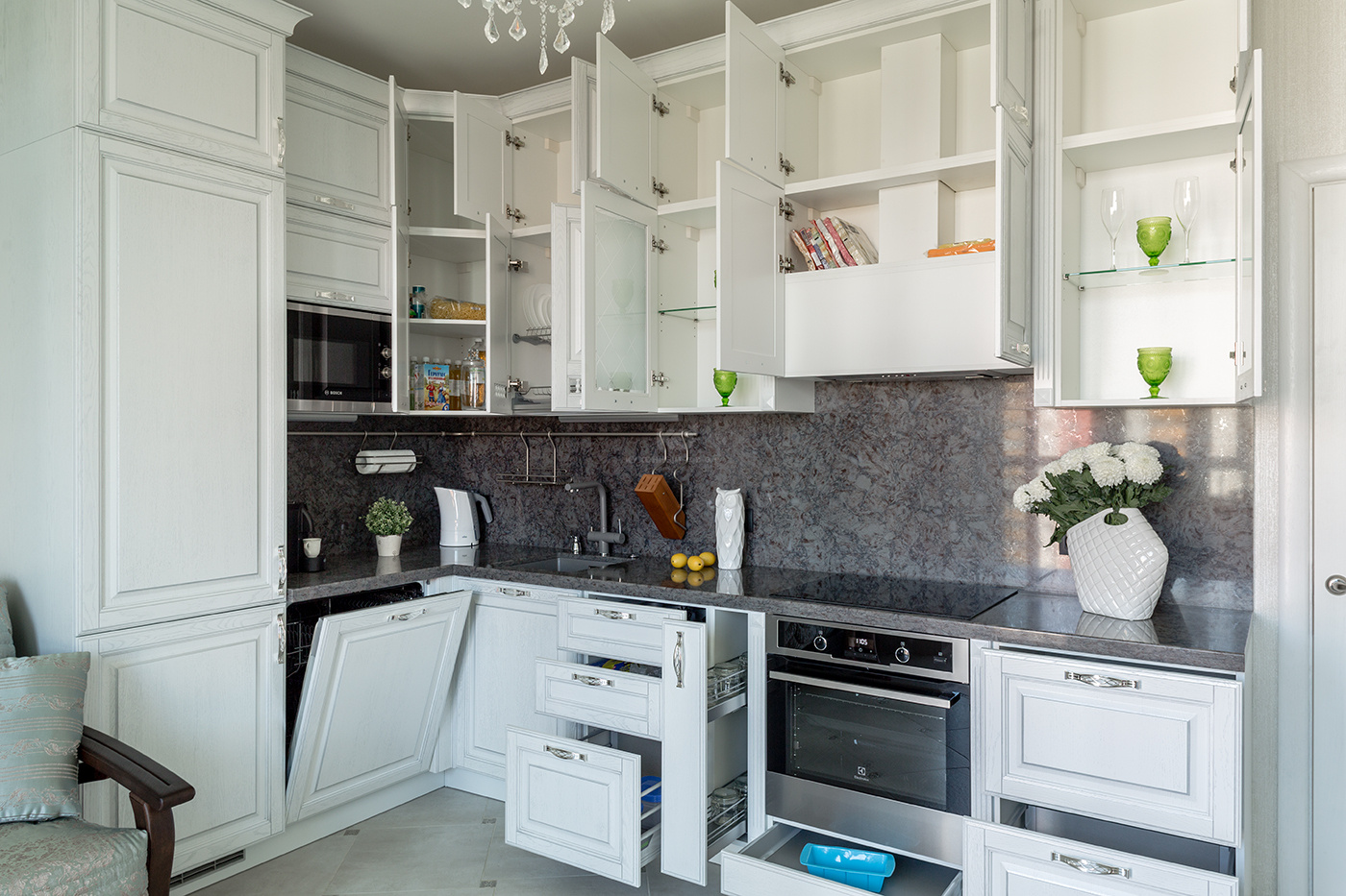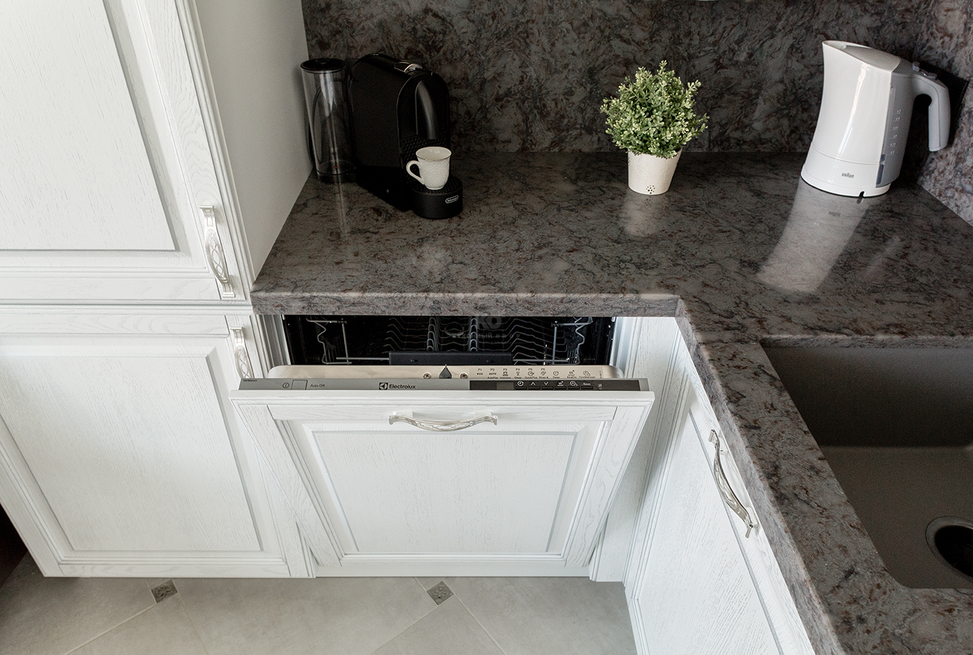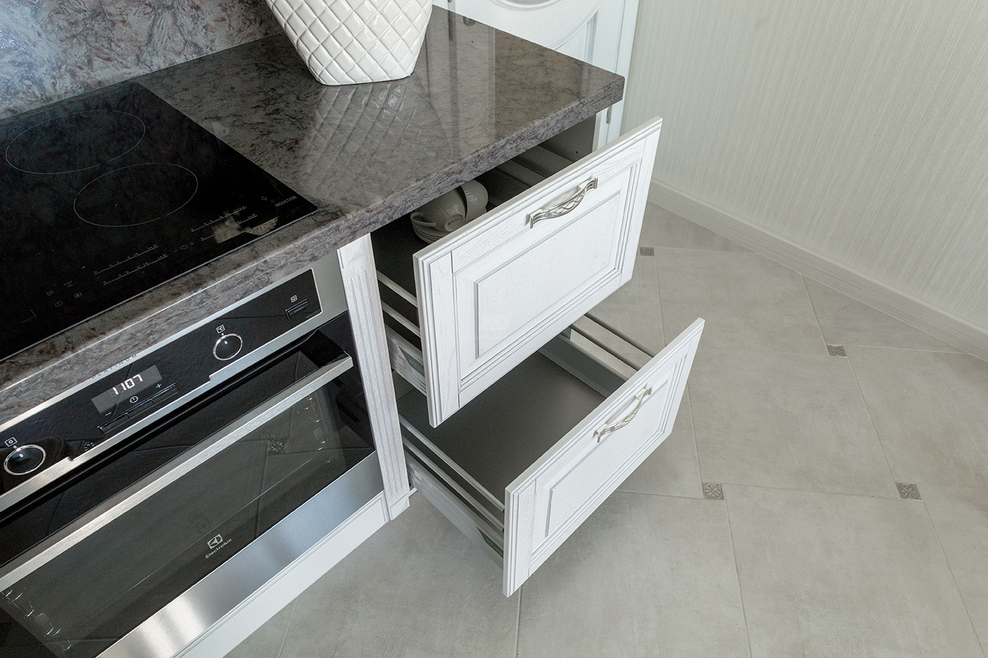 Скользните взглядом по кружеву серебристых ручек. Задержитесь на украшенных классической фрезеровкой фасадах из массива дуба. Оцените красоту изящных балюстрад и матовых витражей в верхних модулях. Взгляните, как элегантно верхние и нижние ящики связаны фартуком, точно подобранным в цвет столешницы из кварцевого агломерата. Гарнитур выглядит безукоризненно и по-настоящему роскошно. Его образ – не мозаика из проверенных временем дизайнерских решений. Напротив, в нем сквозит абсолютная цельность, присущая настоящим шедеврам.