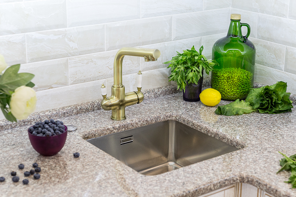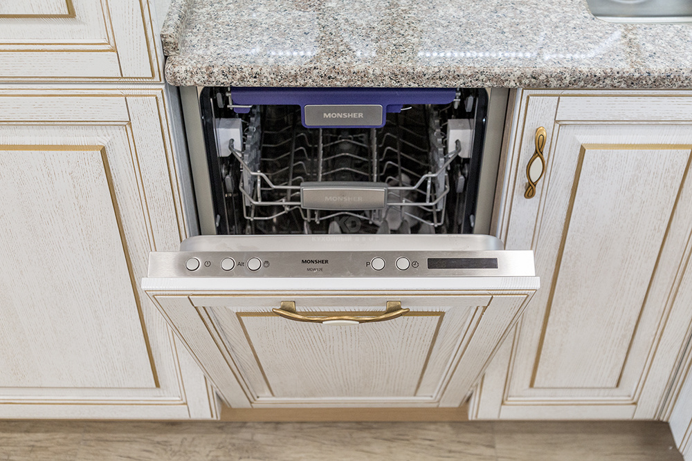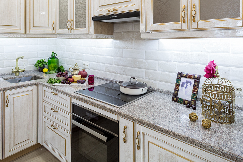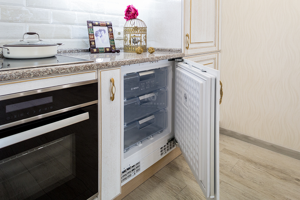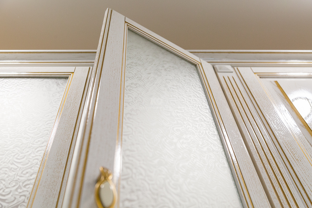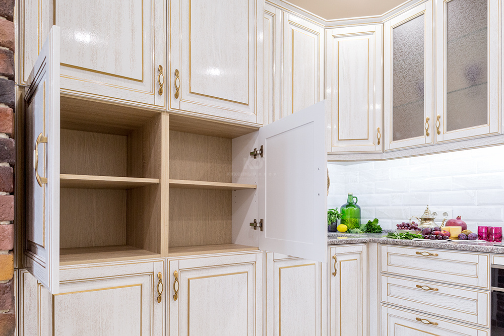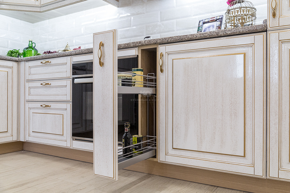 Наши клиенты талантливы во всем: успешный медицинский работник легко перевоплощается в дизайнера, создавая неповторимый интерьер новой квартиры. Достойным украшением новой кухни стал гарнитур «Виконт», который вошел в десятку бестселлеров бренда «Кухонный Двор». Роскошная, величественная, удобная угловая кухня «Виконт» гармонично смотрится в просторном светлом помещении, дополняя его. Фасады гарнитура выполнены из массива бука, тонированы в белый цвет с золотой патиной. Дополняют образ резные архитектурные элементы, пилястры и стилизованные под золотой век ручки.