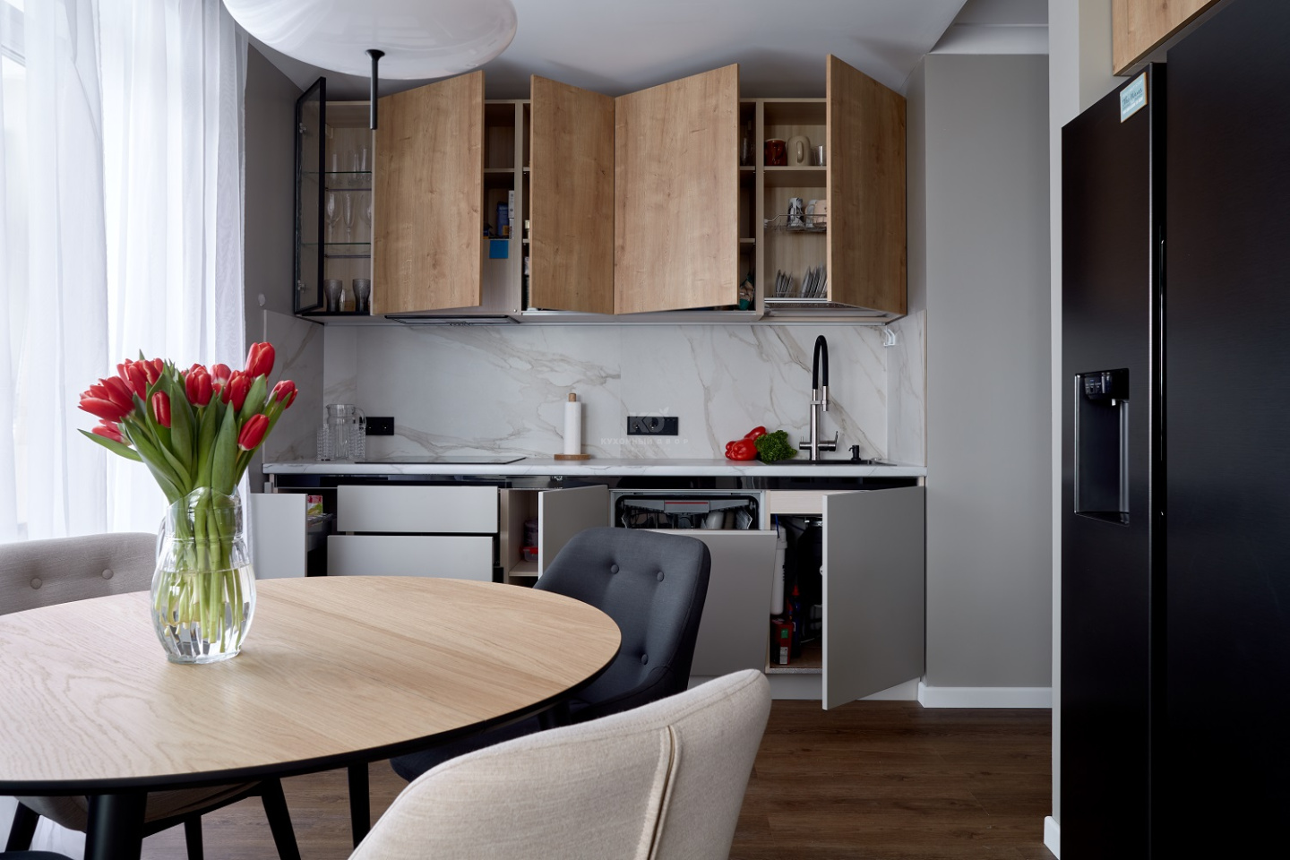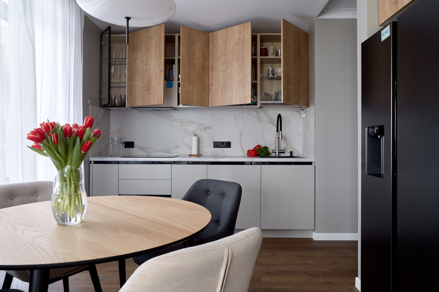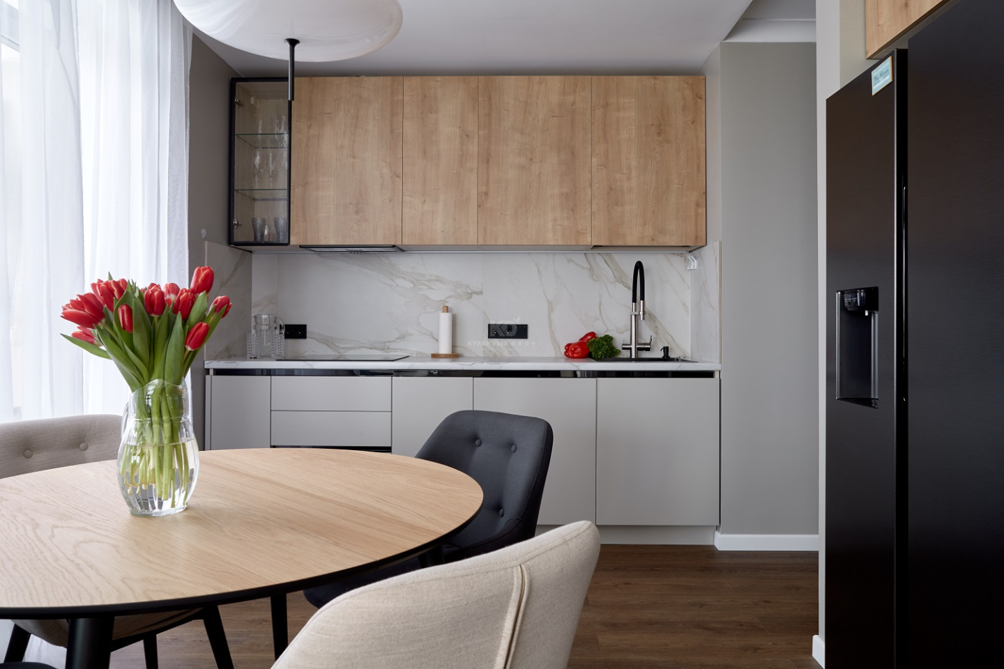 Выгода внушительна, а проект – прекрасен, ведь в нём гармонично замиксованы модный soft minimal и эко-стиль. Образ кухни выстроен на беспроигрышном сочетании чёрного и серого цветов с добавлением древесных фактур. Фасады «под дерево» созданы из экоплиты и взяты от гарнитура «Стоун Вуд». А поверхности цвета «серый шёлк» достались проекту от «Фаворита-1» – флагманской модели от КД. Все фасады легки, долговечны, а также устойчивы к механическим повреждениям, перепадам температур, загрязнениям и солнечному ультрафиолету. Как раз то, что нужно для современной кухни!