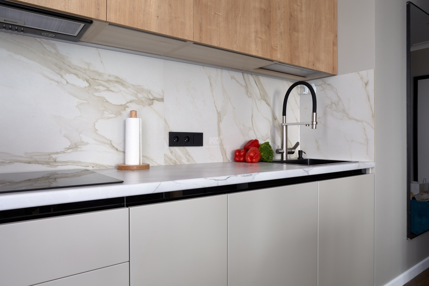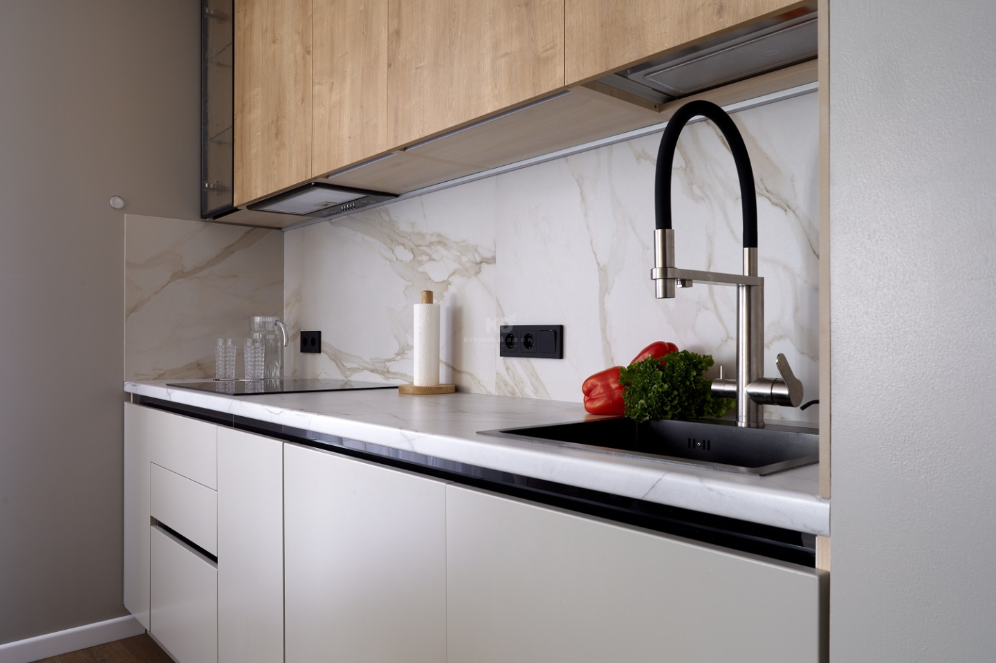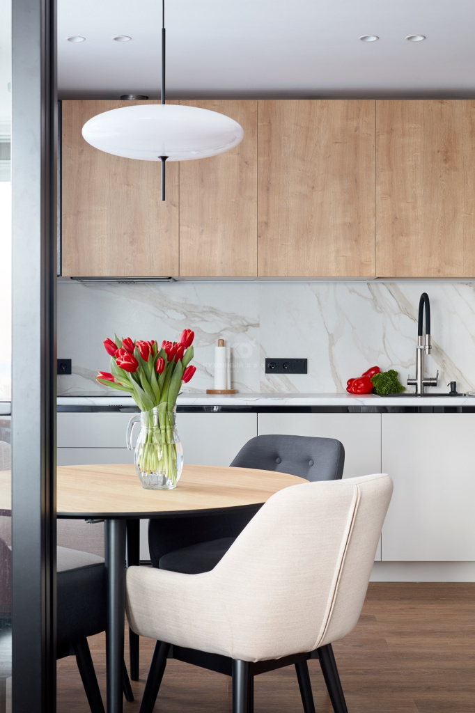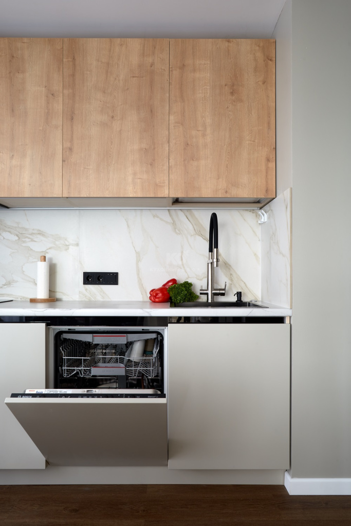 Выгода внушительна, а проект – прекрасен, ведь в нём гармонично замиксованы модный soft minimal и эко-стиль. Образ кухни выстроен на беспроигрышном сочетании чёрного и серого цветов с добавлением древесных фактур. Фасады «под дерево» созданы из экоплиты и взяты от гарнитура «Стоун Вуд». А поверхности цвета «серый шёлк» достались проекту от «Фаворита-1» – флагманской модели от КД. Все фасады легки, долговечны, а также устойчивы к механическим повреждениям, перепадам температур, загрязнениям и солнечному ультрафиолету. Как раз то, что нужно для современной кухни!