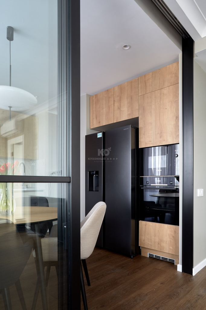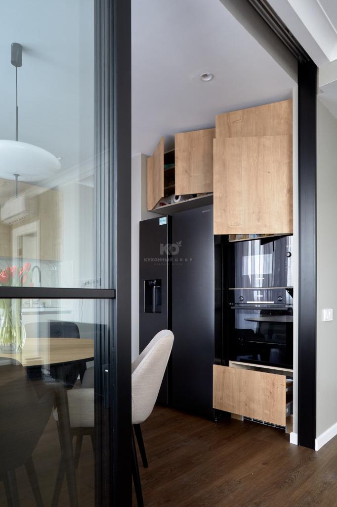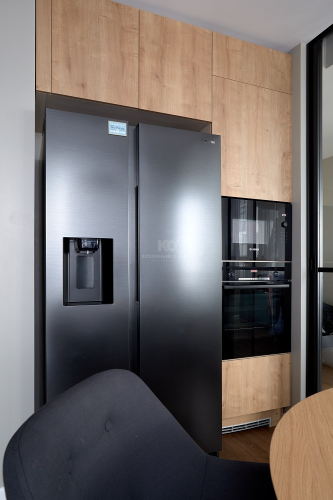 Прекрасно смотрится и зона с «утопленным» в нишу холодильником. Здесь в высоком пенале на удобной высоте располагаются встроенные СВЧ и духовой шкаф. Помимо них кухня также оснащена мощной варочной панелью, полноразмерной посудомоечной машиной и даже измельчителем пищевых отходов!