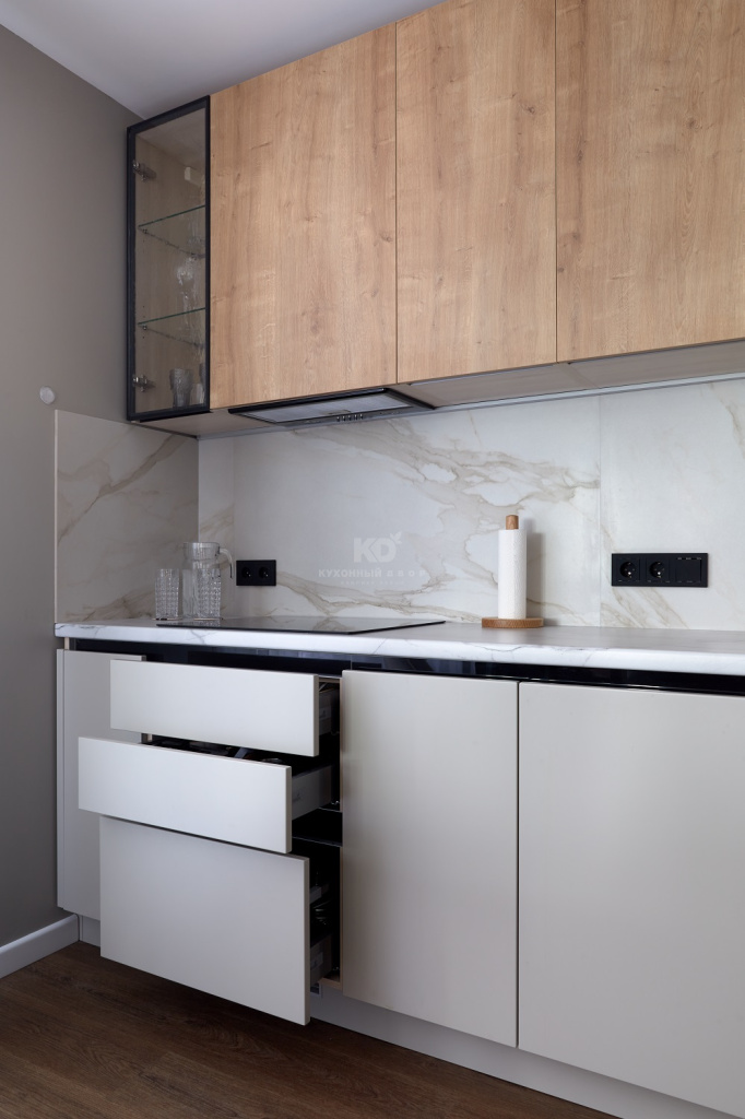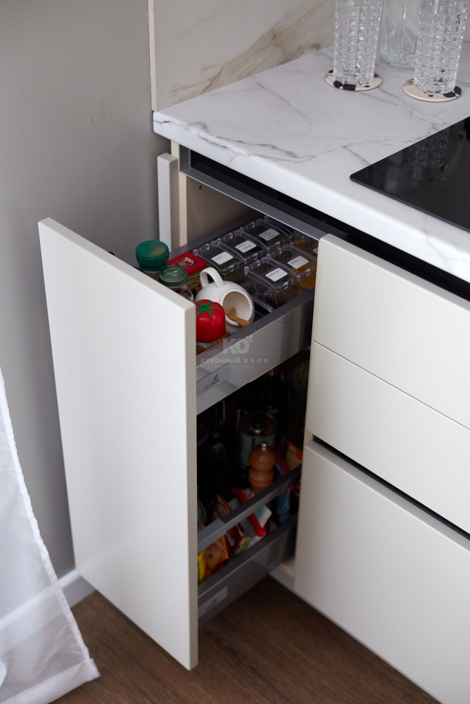 А что нужно ещё? Привлекательная внешность! С ней, как видите, тоже полный порядок – все зоны гарнитура могут похвастать трендовыми решениям. Так, нижний ярус здесь оснащён системой открывания фасадов без ручек «Space Line», которая выразительно «вычерчивает» линию столешницы. А «изюминка» верхнего яруса – шкаф с застеклённым фасадом и чёрной алюминиевой рамкой. Этот шкаф оснащён стильной подсветкой и выполняет роль витрины для самой дорогой посуды.