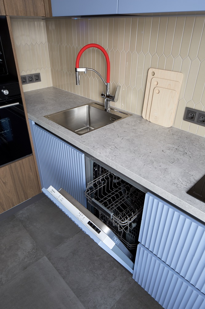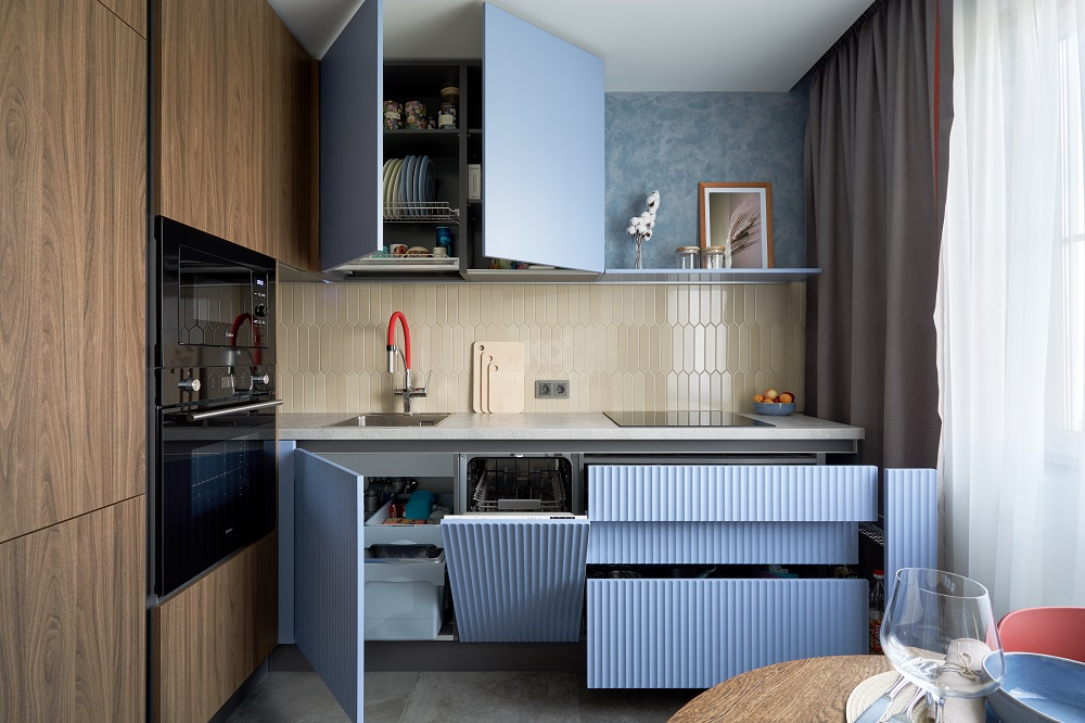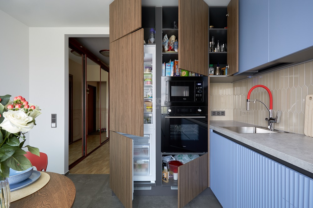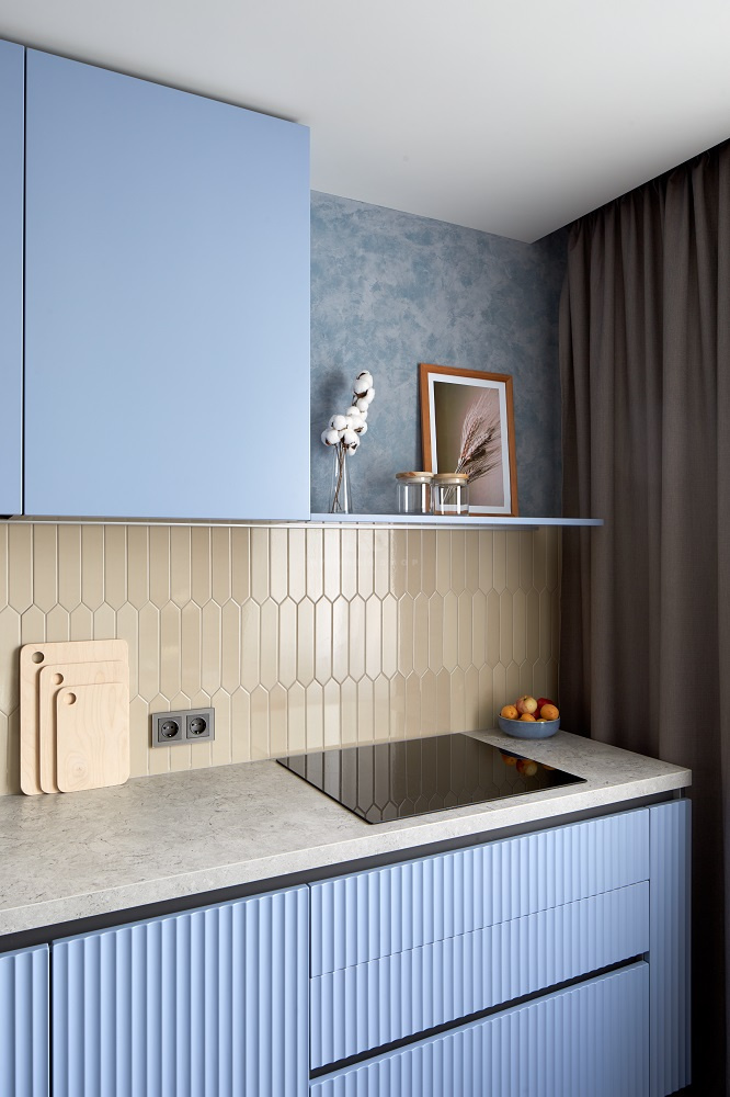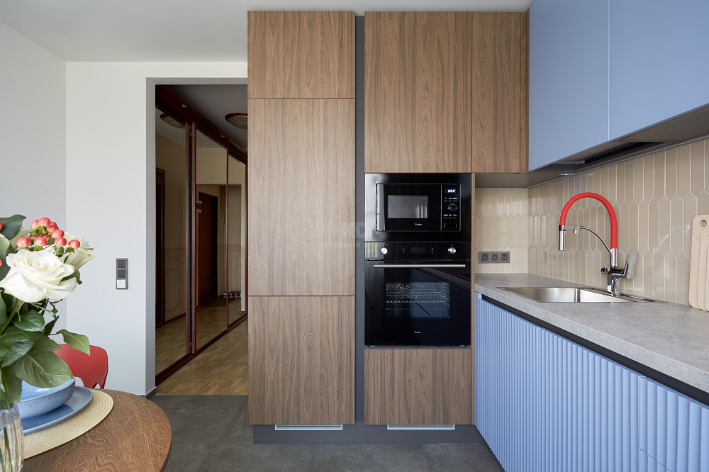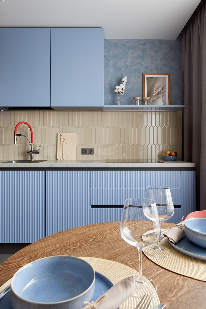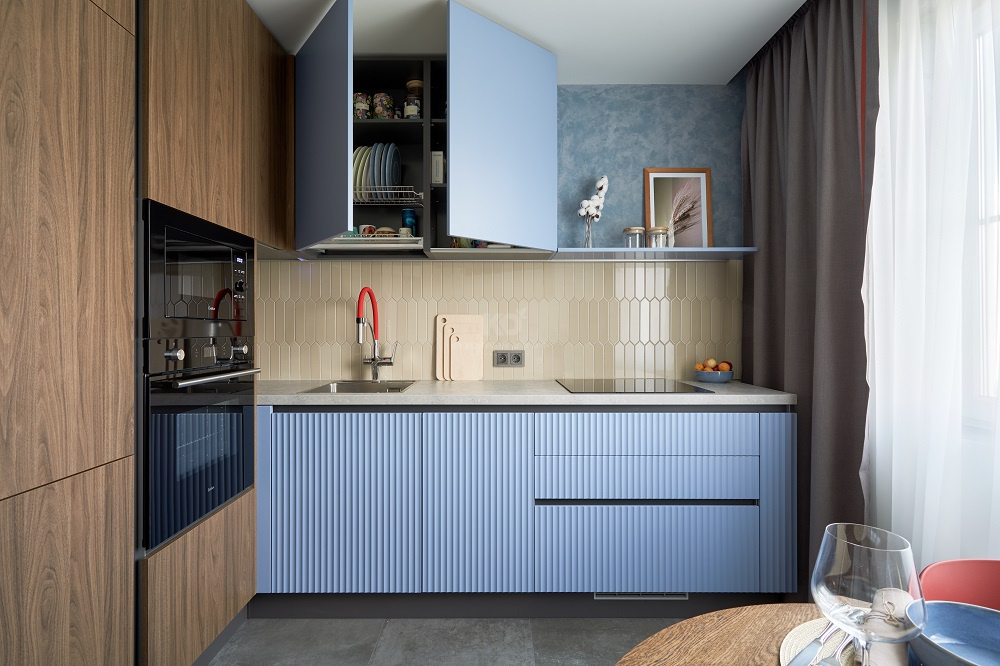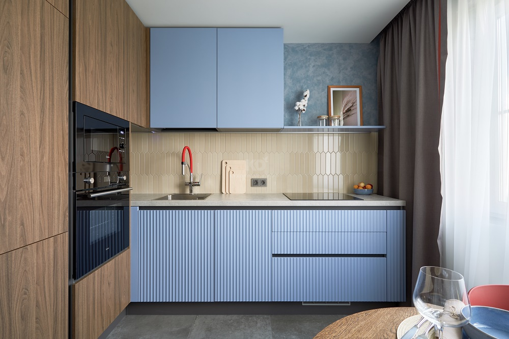Признайтесь, вас тоже очаровал этот цвет? Кажется, будто опытный художник перенёс красоту самого неба на кухонные фасады. А рядом «изобразил» древесные фактуры, которые сделали композицию законченной и гармоничной. Такую цветофактурную комбинацию нечасто увидишь в наших проектах, и тем сильнее она западает в душу. Покой, умиротворение и лёгкость – вот какие чувства пробуждает эта кухня!
