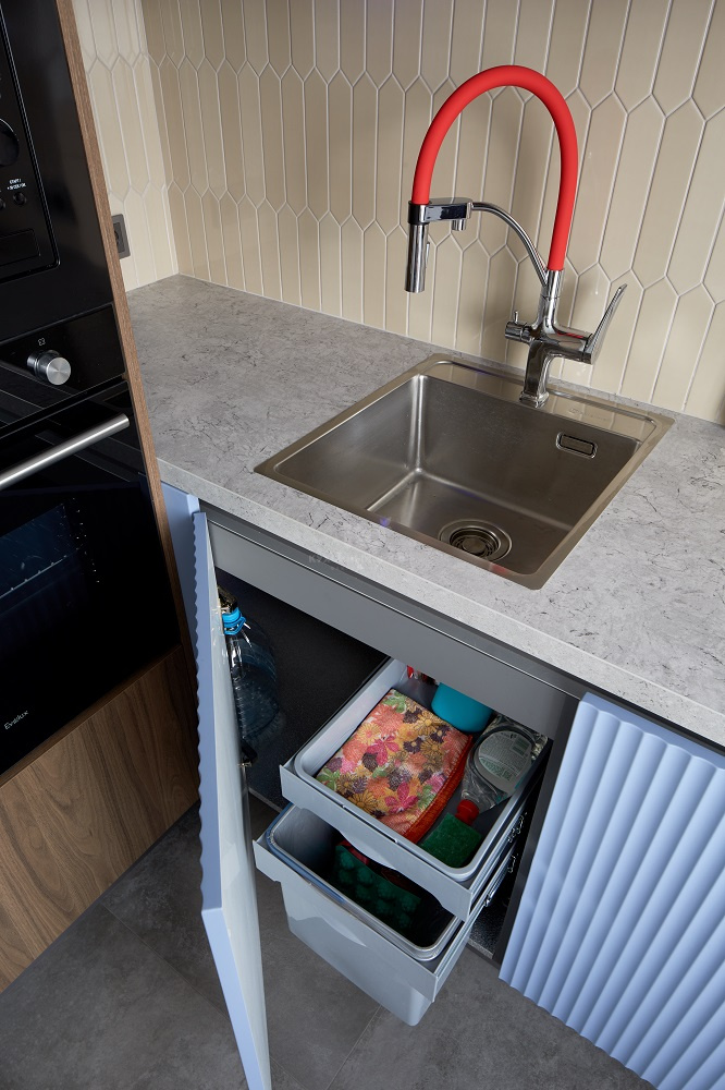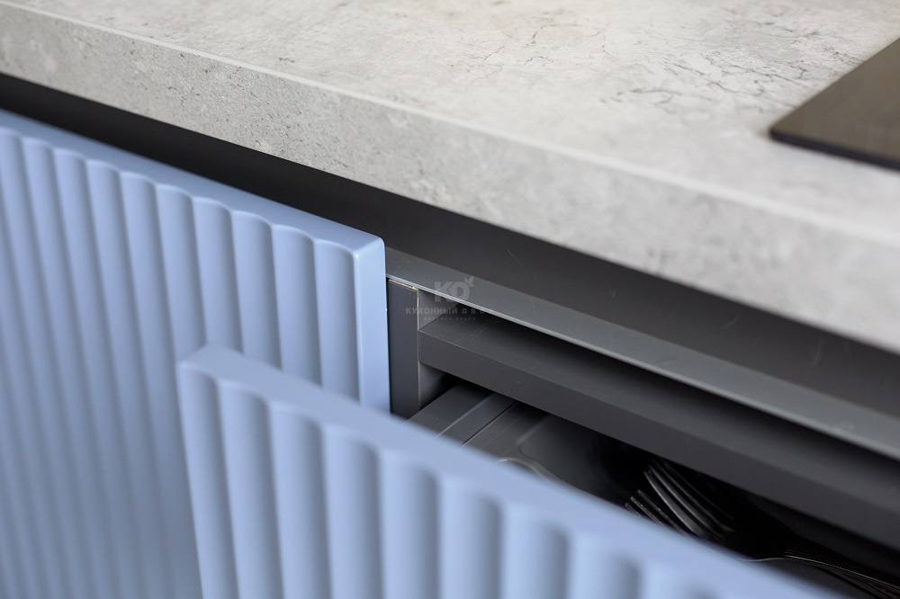 Зона голубого цвета – это уже наша новая модель, Джейн Арт. Здесь фасады выполнены из МДФ и покрыты высокопрочной матовой эмалью. Такое покрытие невероятно устойчиво к повреждениям, перепадам влажности и температур, а также солнечному ультрафиолету. При правильной эксплуатации фасады Джейн Арт сохраняют первозданный цвет на протяжении десятилетий! Приятное свойство, ведь столь очаровательным оттенком голубого хочется наслаждаться максимально долго. К слову, Джейн Арт доступно свыше 1000 (!) цветовых исполнений, так что каждый может подобрать для неё свой любимый цвет!