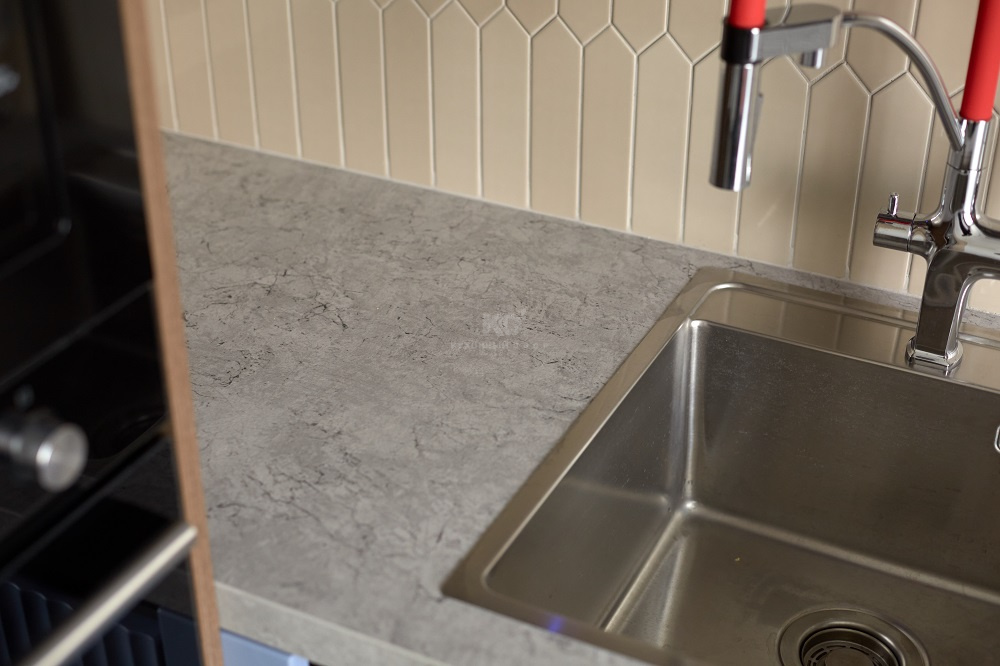 Проект создан из двух моделей. Зона с СВЧ, холодильником и духовым шкафом принадлежит модели «Стоун Вуд». Фасады здесь выполнены из экоплиты, имитирующей текстуру дерева. Экоплита легка, прочна и долговечна, а её рисунок удивительно точен и не повторяется в рамках одного проекта..