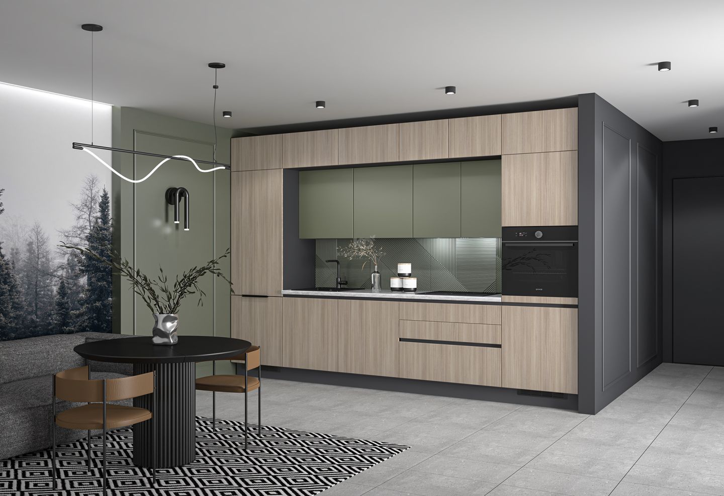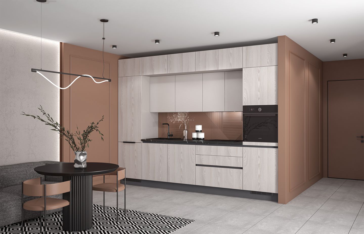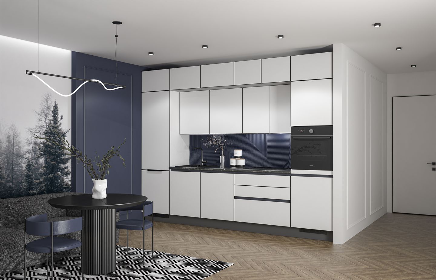 Вертикальный потенциал: включение антресольных шкафов в верхний ярус позволяет задействовать пространство до самого потолка. Это идеальное место для хранения редко используемой техники и посуды, избавляя вас от визуального шума и поддерживая безупречный минимализм нижних уровней.