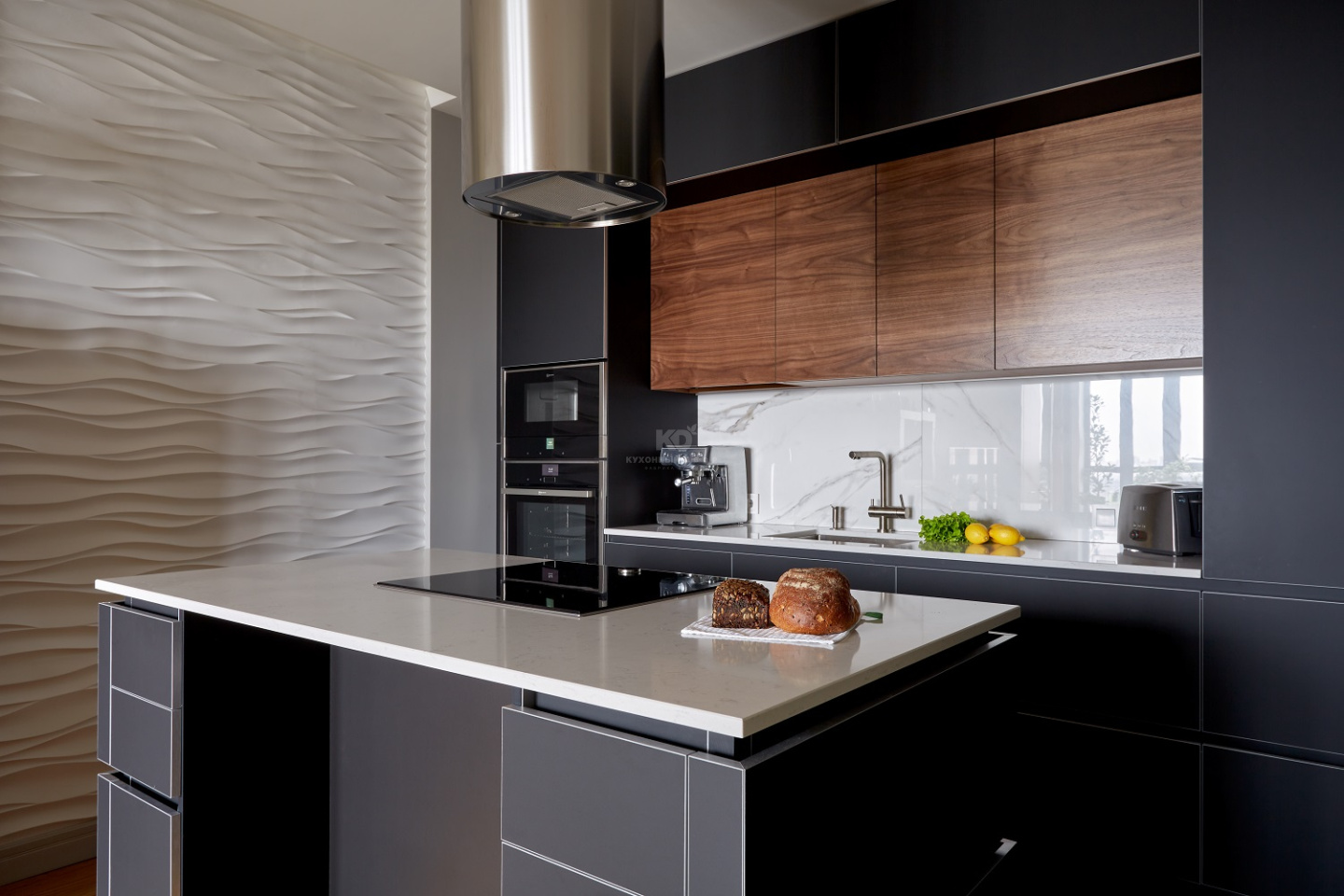 Стоит подумать и об оптимальной конфигурации гарнитура: будете вы устанавливать мебель вдоль одной стены, двух или более. В зависимости от этого и стоит отталкиваться – нужна вам прямая, угловая или П-образная черно-белая кухня на заказ.