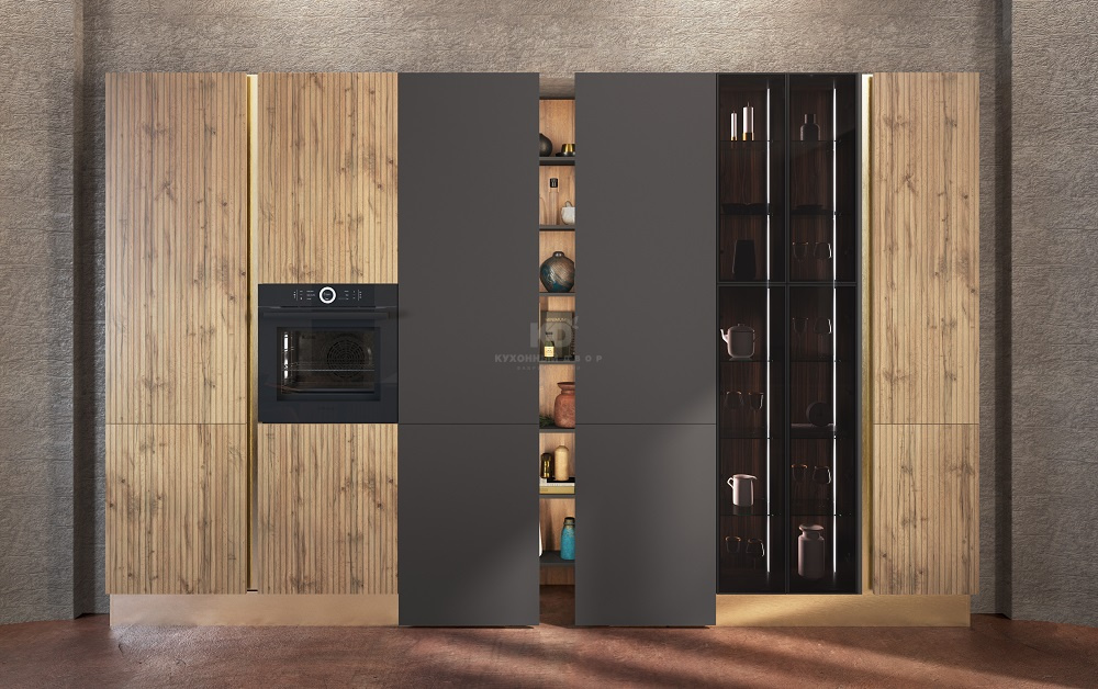 - Нестандартные системы открывания. «Бриджит Этно» может быть оснащена уникальной поворотной системой, которая позволяет открывать фасады и как бы «прятать» их в корпусе. Также доступна сдвижная система открывания по принципу «купе», причём даже для крупных фасадов!