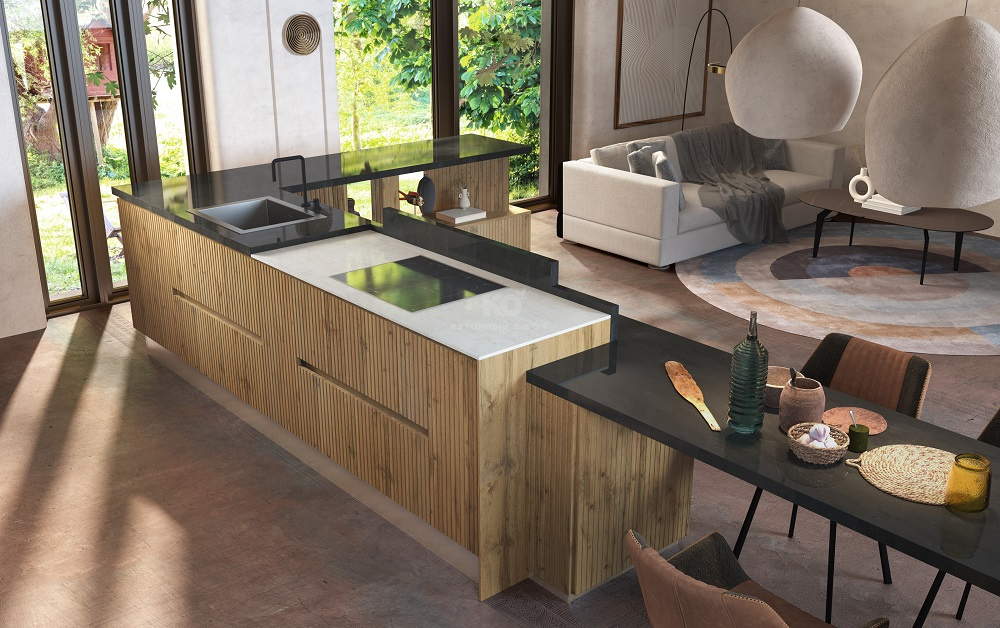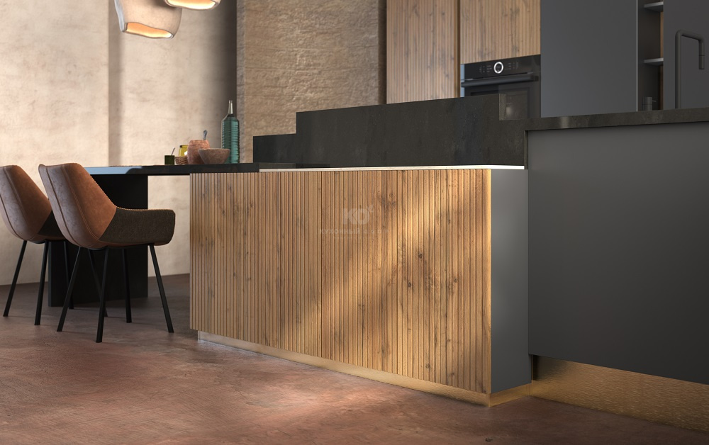 - Фрезеровка и покрытие. Фасады модели кажутся очень разными. Одни гладкие и одноцветные, другие же имеют древесную фактуру и восхитительную «рифлёную» фрезеровку. При этом оба типа фасадов созданы из МДФ и покрыты инновационной «дышащей» экомембраной, устойчивой к влажности, ультрафиолету и температурным перепадам.