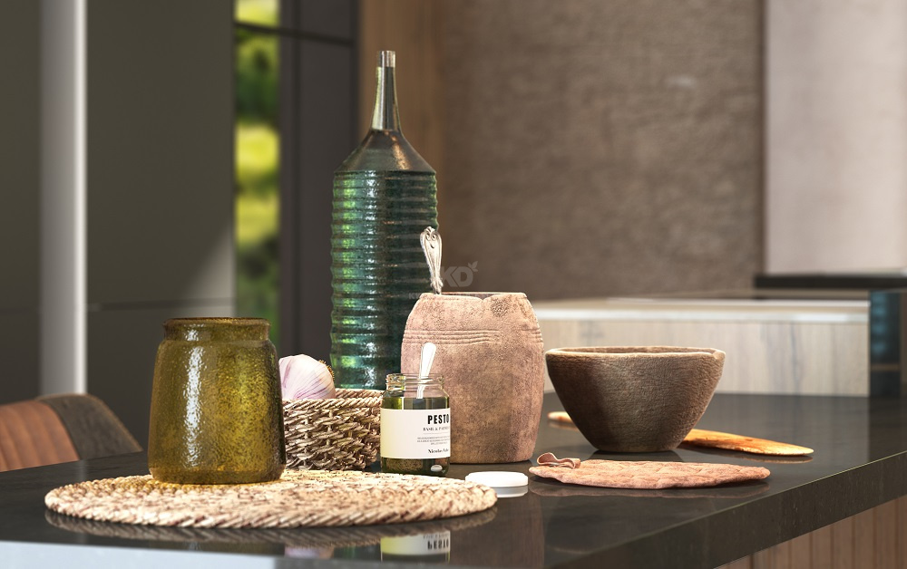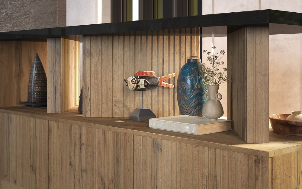 - Поддерживающие элементы столешницы. Они позволяют создать под столешницей открытое пространство с архитектурой в духе арт-галереи. Это пространство просто идеально для размещения предметов декора! А солнечный свет, проходя сквозь него, порождает необычную игру теней.