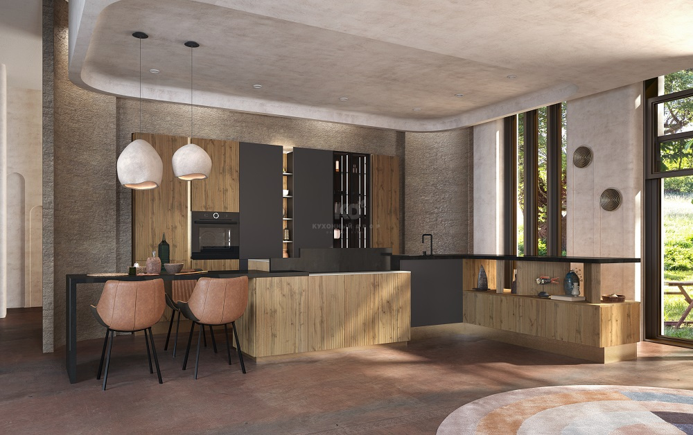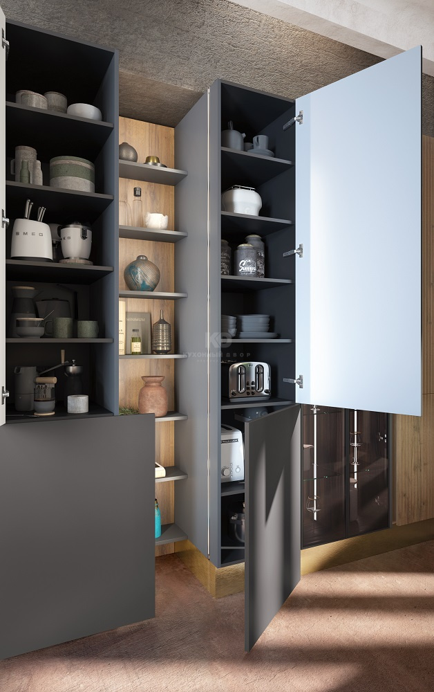 - Открытые секции. Зона с открытыми полками в центральной части кухни выглядит очень притягательно из-за особой конструкции тёмных фасадов. Фасады перекрывают часть пространства, как бы слегка пряча полочки за собой. Это не только эффектно смотрится, но и позволяет организовать скрытую подсветку открытых зон. Вы едва ли найдёте что-то подобное в других кухнях.