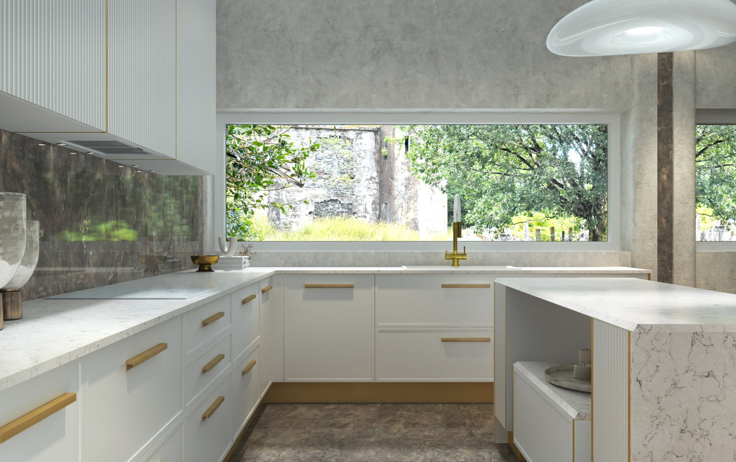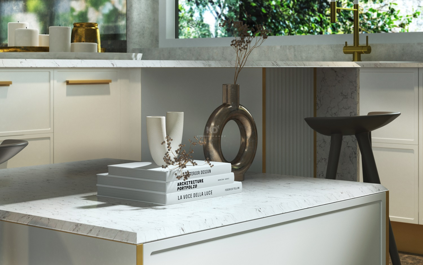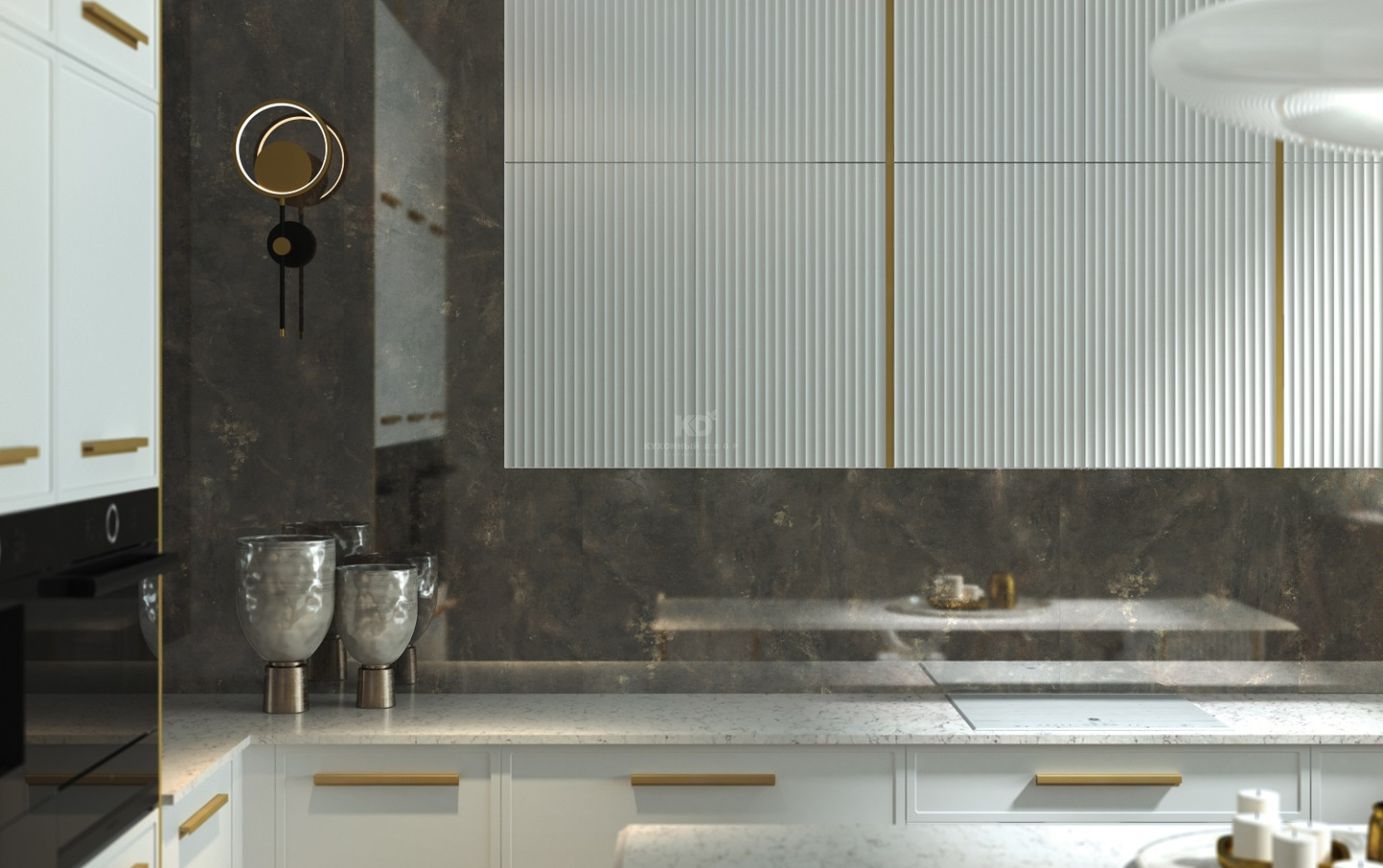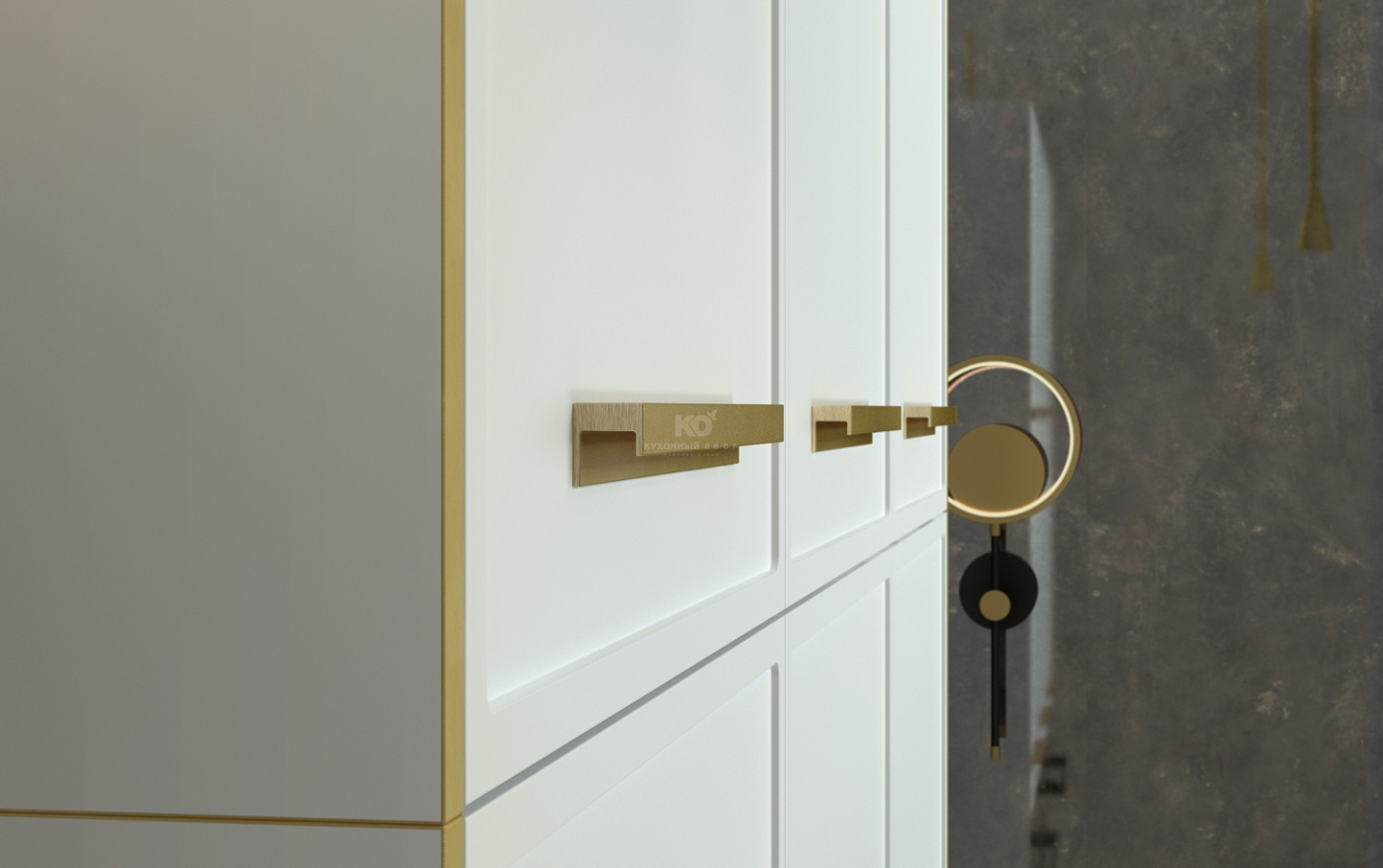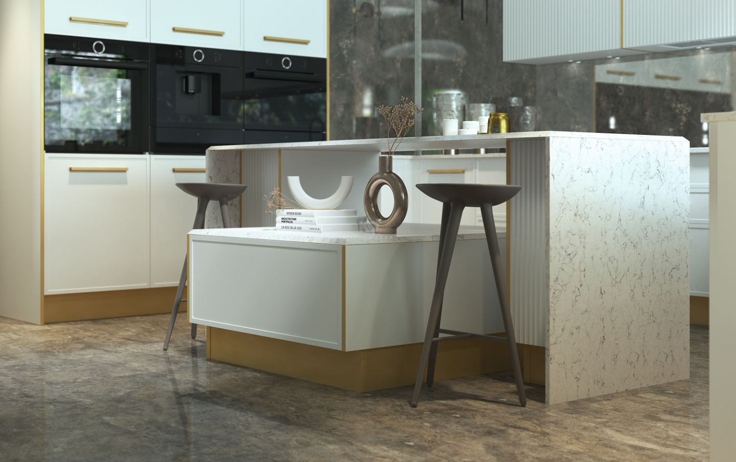 Вертикальная волнообразная фрезеровка высокой частоты – эксклюзивная черта этой модели. Она задаёт особое настроение и отлично сочетается с выразительными цветовыми акцентами. К слову о них: ручки, цоколи и торцевые части корпусов здесь имеют золотой оттенок, который входит в пикантный контраст с белоснежными фасадами. Подобная палитра делает «Джейн Вертикаль» чистой, но не наивной. Лёгкой, но преисполненной благородства. Столь чувственный нарратив отлично дополняется столешницей «под мрамор» из натурального кварца, а также особым оформлением острова. Последний выполнен в очень утончённой стилистике, одновременно выступая как обеденная зона, чайный столик и место для модного декора.