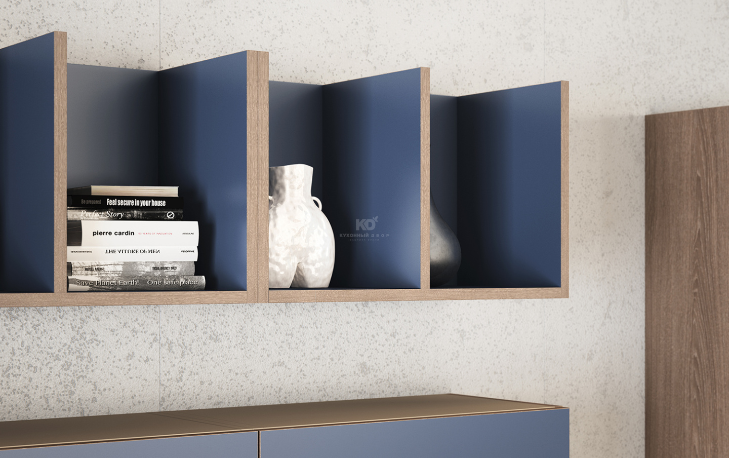 Фасады «Эстер» могут отличаться по цветофактуре от материала корпуса, а могут, напротив, быть полностью идентичными друг другу. Кухня полна необычных сочетаний, однако каждое из них чётко выверено и не выходит «за рамки» вкуса. Кстати о рамках: торцевые части фасадов и открытых полок здесь словно очерчивают контуры некоторых зон. Это делает характер модели ещё более смелым и игривым. Нестандартная внешность в сочетании с превосходным техническим оснащением – вот формула красоты, имя которой «Эстер»!