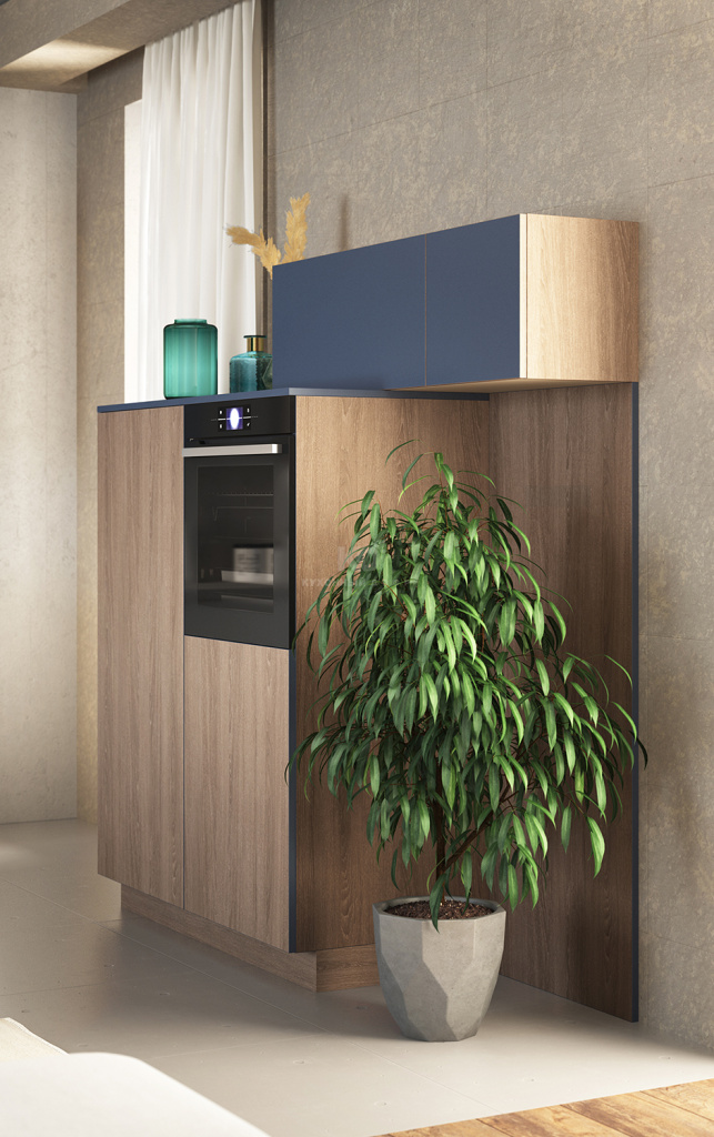 Эта кухня обожает смелые решения. Фасады из покрытой эмалью экоплиты она «по-скандинавски» сочетает с «древесными» цоколями. Рядом со стоящими на полу элементами гармонично сосуществуют «парящие» пеналы, навесные шкафы разных размеров и оригинальные полки с «открытым» верхом. А зона с духовым шкафом и вовсе кажется собранной из отдельных «кубиков», подобно конструктору. Мягкий и уютный минимализм «шведского» формата предстаёт здесь во всей красе!