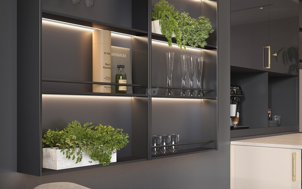 Выразительный декор. Для «Флер Манифик» доступны декоративные элементы «Cubo» с подсветкой. На их основе можно создать вместительные открытые зоны для хранения посуды, утвари, продуктов и интерьерных украшений.