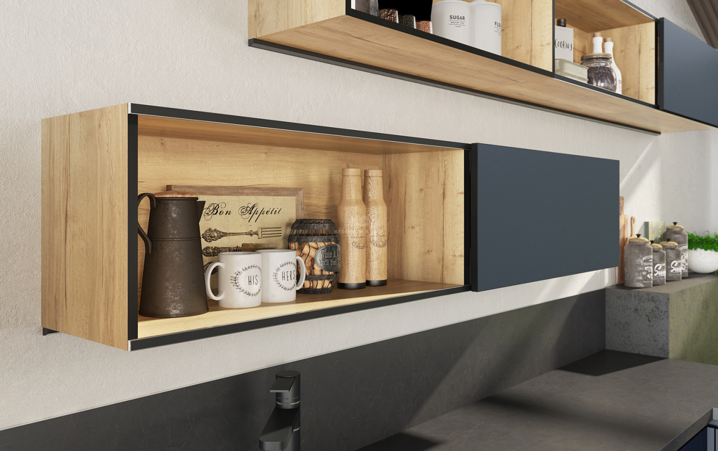 Навесные шкафы «Ханна Блэк» оснащены системой «Slide Doors». Она позволяет Вам в любой момент менять дизайнерские акценты, оставляя открытыми желаемые зоны. Не менее удивительно смотрятся элементы под духовые шкафы. Они выглядят очень компактно, ведь значительная их часть скрыта в стене. Кажется, будто техника просто «парит» в воздухе! Также «Ханна Блэк» доступна комплектация «Black Line», с которой всё внутреннее пространство гарнитура может быть выполнено в трендовом чёрном цвете.