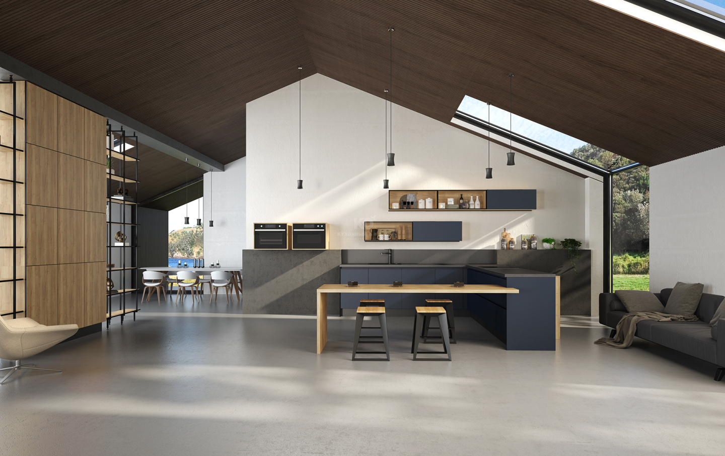 Кто-то назовёт «индиго» цветом Вселенной, и будет прав. В нём заключена красота вечернего неба, на котором загораются первые звёзды. Не удивительно, что этот естественный оттенок синего столь гармонично сочетается с натуральными древесными фактурами. Светлое дерево идеально вписывается в ритмику этой композиции, ведь образует с «индиго» эффектный контраст. Чтобы подчеркнуть его, торцевые части «Генриха окаймлены стильными чёрными кромками. Выглядит очень выразительно!