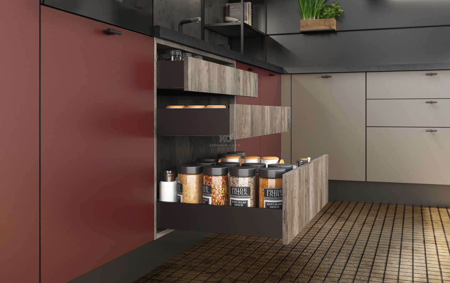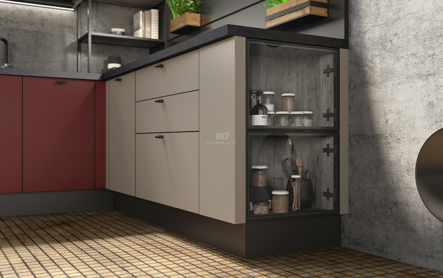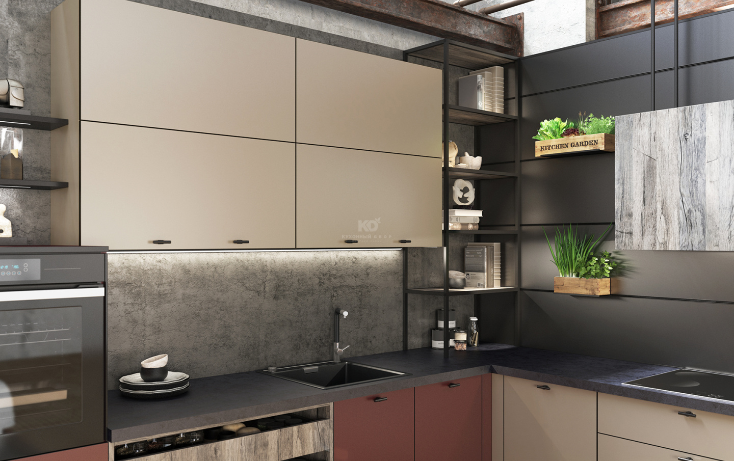 Каждая линия «Ханны Блэк BL» выверена с ювелирной точностью. Чтобы подчеркнуть строгость архитектуры этой кухни, дизайнеры «KD-Lab» используют чёрные кромки. Они придают минималистичному облику объём и выразительность. А еще создают контраст с «бархатистыми» фасадами «Extra Touch Matt» гранатового и бежевого цветов. Эти цвета великолепны в тандеме с графитовым, не так ли?