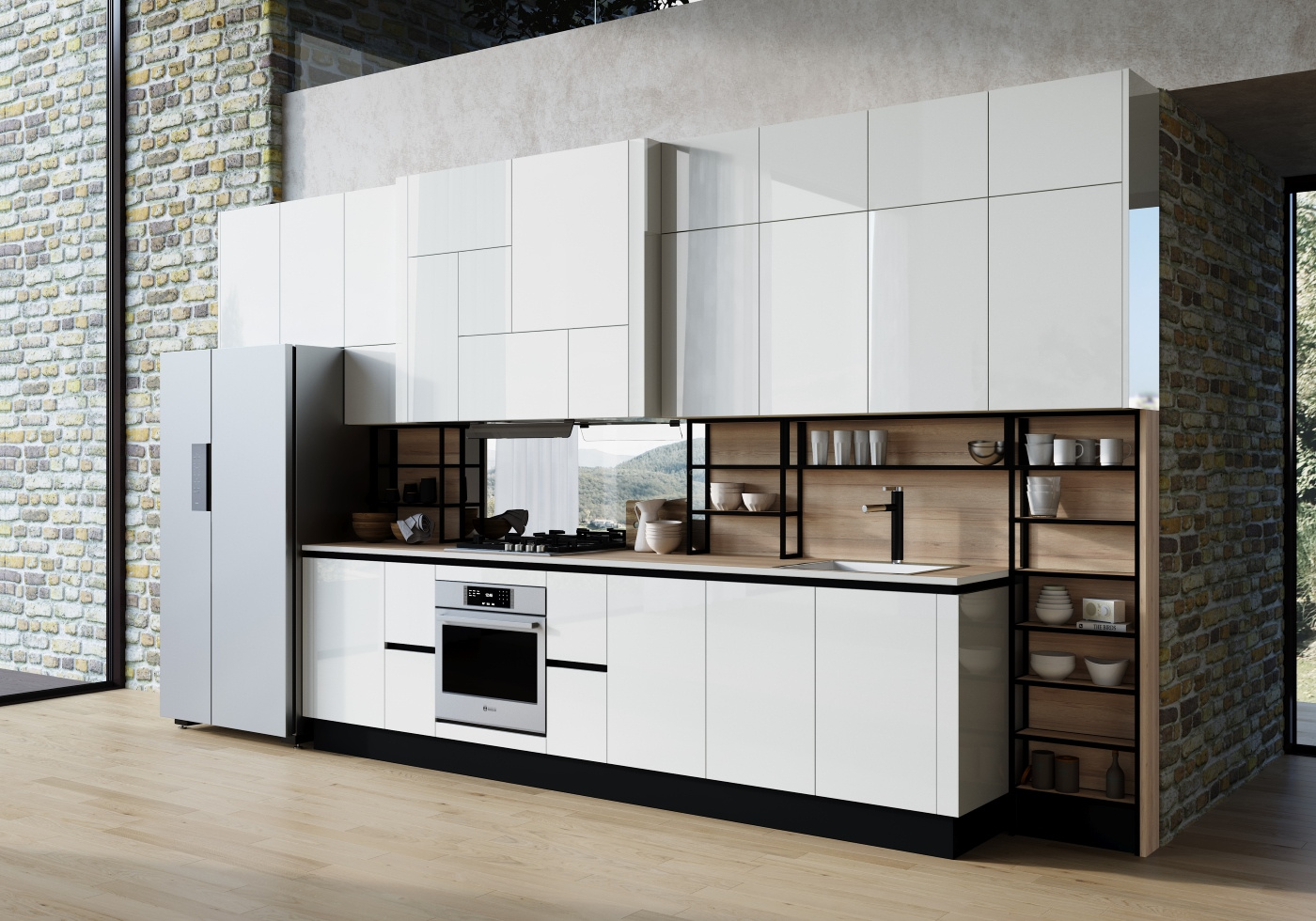 Вообще, времена, когда кухня была чем-то скомканным и неоднородным, уходят в прошлое. Современный гарнитур – это взаимосвязь каждой точки пространства, их синергия и симбиоз. «Ричард» не отделяет верхний ярус от нижнего – они связаны элегантной сетью открытых полок из анодированного алюминиевого профиля. Остров также не имеет ни единой лишней детали, полностью перекликаясь с остальными частями кухни.