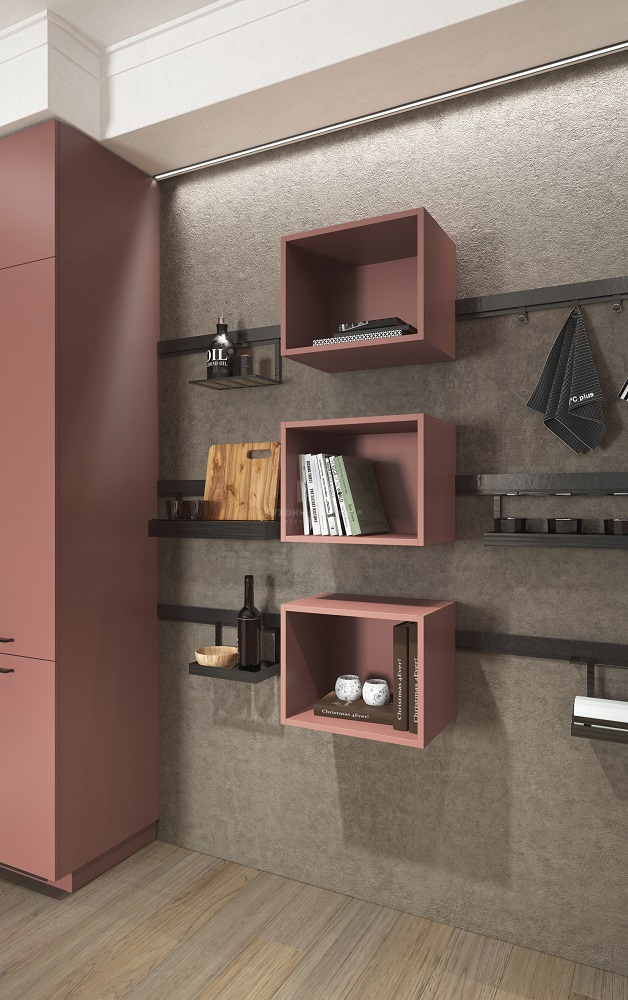 И, конечно же, нельзя обделить вниманием навесные открытые ящики в центре композиции. Скомбинировав их рейлинговой системой из анодированного алюминия, Вы получите весьма оригинальную зону для размещения предметов декора и полезных мелочей.