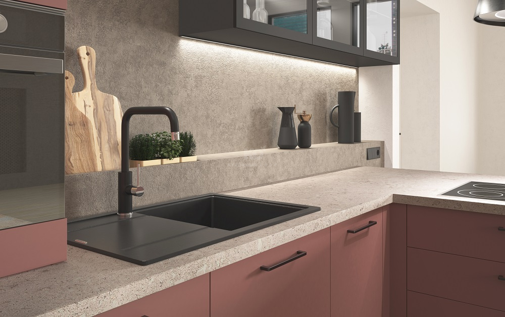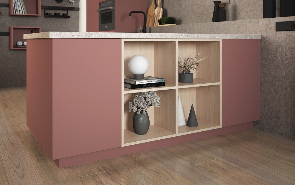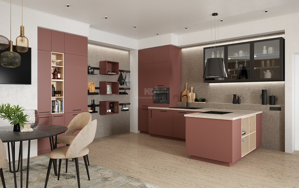Вы только взгляните, сколь гармонично в облик «Уны» вписаны открытые зоны под светлое дерево. Они идеально «разбавляют» как высокие пеналы с глухими фасадами, так и массивный полуостров, внося в каждый элемент нотку лёгкости.