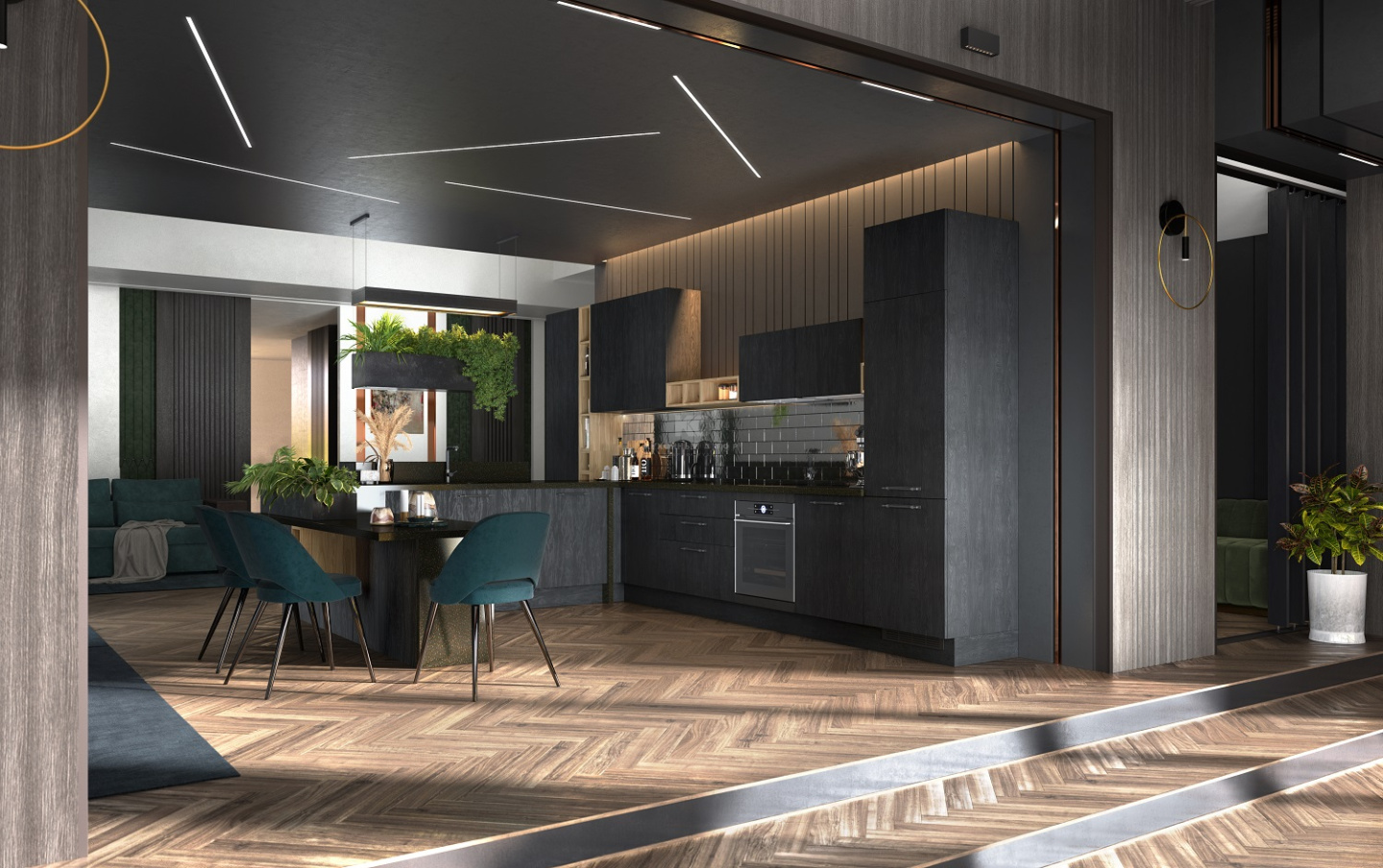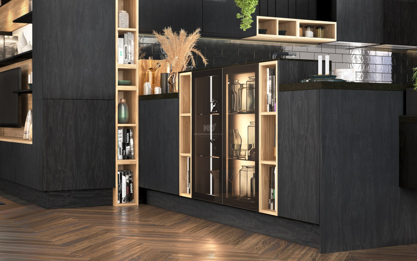 «Ноа» пленяет не только фактурами и красотой фурнитуры, но и формами! В этой кухне использовано выразительное сочетание открытых модулей и элементов со стеклянными фасадами. Модули верхнего яруса над рабочей зоной имеют разную высоту и задают образу особый ритм. Разноуровневыми являются и столешницы полуострова: его можно использовать и как рабочую, и как обеденную зону. А лаконичность общей архитектуры позволяет Вам создать на основе «Ноа» идеальную кухню-гостиную!