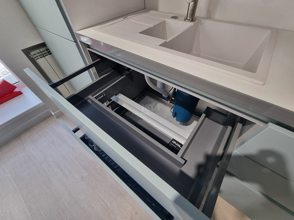 Фасады - МДФ с покрытием суперматовая экомембрана в сочетании с фасадами Эггер SuperGloss высокий глянец.