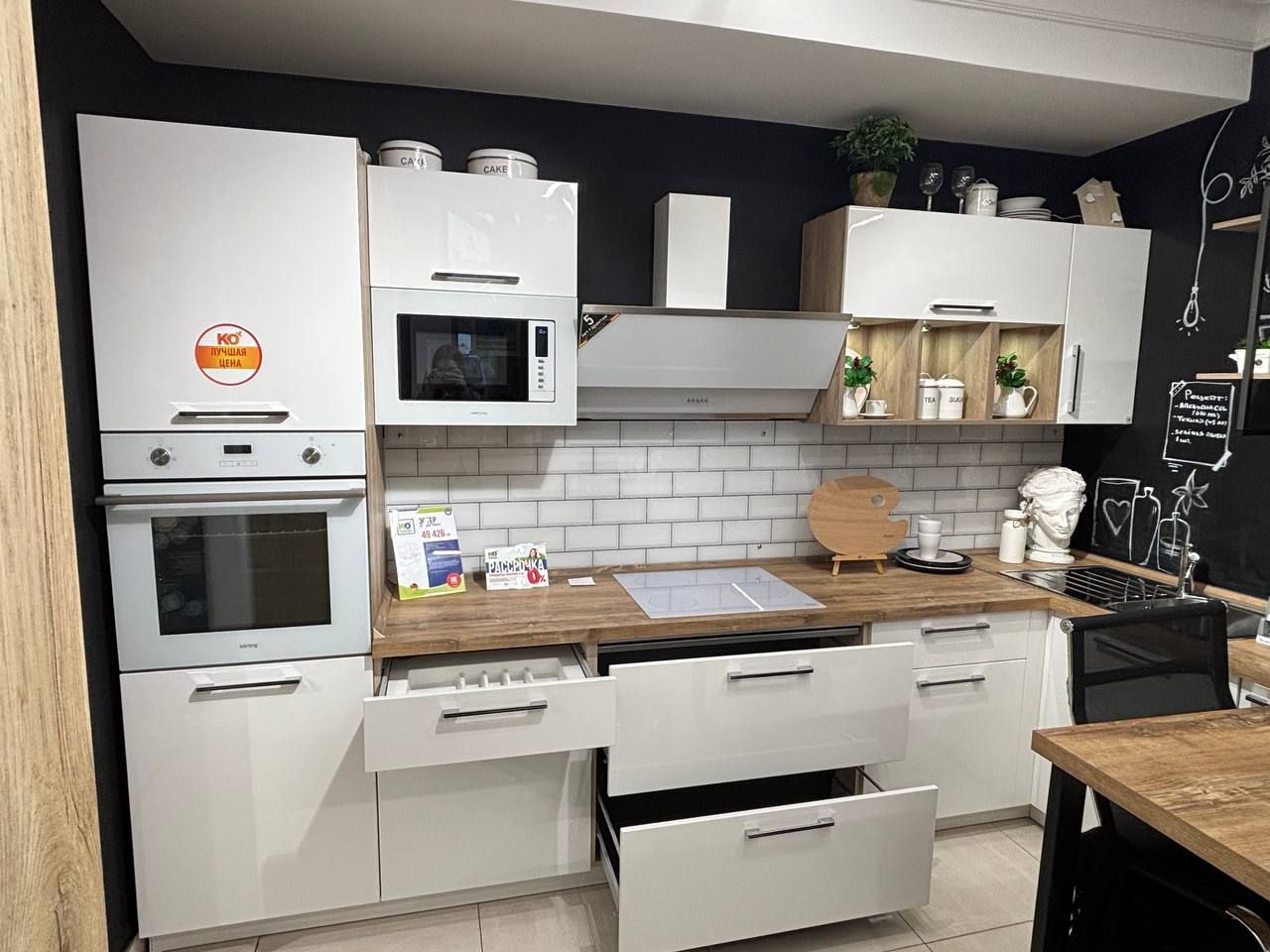 Особенности: Глянцевые фасады в сочетании с древесной фактурой.