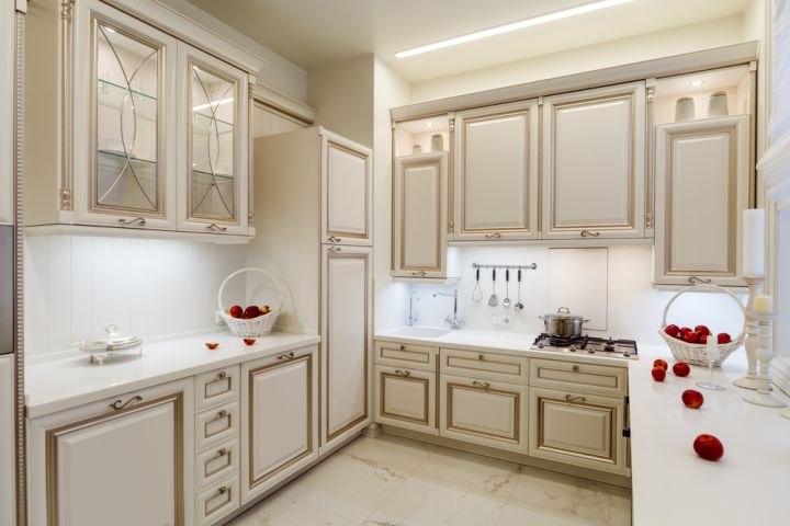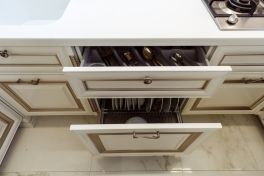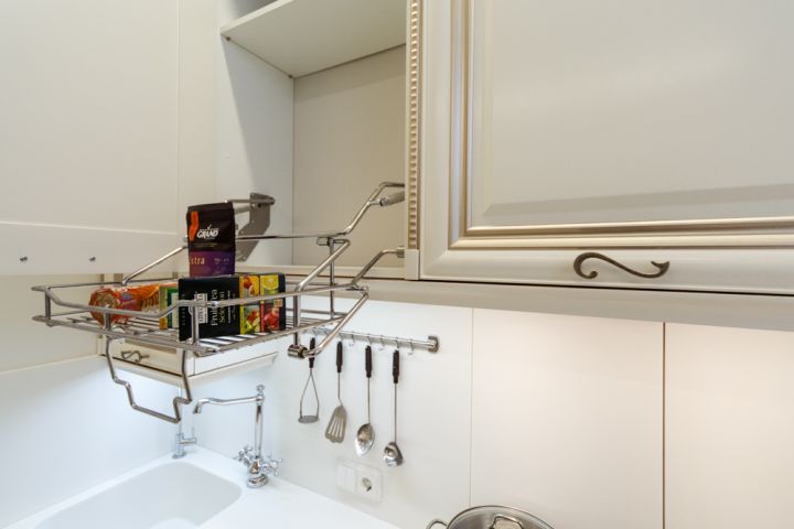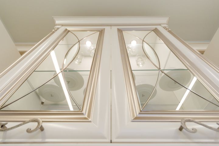 Кухонный гарнитур – тонкая работа мебельных мастеров. Фасады из МДФ молочно-белого оттенка собрали по той же технологии, что и настоящие деревянные: рамки и филенки соединяли друг с другом по отдельности. Сверху поверхность покрыли патиной оттенка припыленного серебра. Все ящики дополнили изогнутыми ручками под состаренное серебро в тон патине. П-образную кухню спланировали таким образом, чтобы она была удобна для человека с ограниченными возможностями. Основную рабочую столешницу опустили на 10 см от стандарта, а у окна разместили обыкновенный стол без ящиков, чтобы его можно было использовать, сидя в коляске. Кроме того, два верхних шкафчика повесили ниже обычного уровня, чтобы сделать их доступными для героини. Духовой шкаф размещен в нижнем ярусе, рядом со столом без ящиков: хозяйка сможет подъехать к духовке максимально близко. Чтобы облегчить доступ, в нижнем ярусе справа от мойки разместили сушку для посуды с решеткой для чашек и держателями для тарелок (в нее будет удобно складывать посуду из посудомойки). Над выдвижной сушкой – ящик для столовых приборов.Чтобы задействовать все полезное пространство, нижний угловой шкаф оснастили выдвижными полками в виде неправильной восьмерки. Здесь отлично поместятся кастрюли, сковородки и другие крупногабаритные предметы. Верхние центральные шкафчики опустить было невозможно, так как в один из них встроена вытяжка, которую необходимо вешать на расстоянии не менее 70 см от плиты. Поэтому левую секцию оснастили лифтовым механизмом, который позволяет опускать содержимое полки до комфортного уровня. Ручку механизма можно привести в движение крючком от половника или любым другим предметом.Вторая рабочая поверхность стандартной высоты, так что будет удобна для дочери героини (к тому же под столешницей встроена бытовая техника). Над рабочей зоной повесили буфетный шкафчик с точеными пилястрами и стеклянными дверцами с фацетом и гравировкой. Фартук под ним отделан наборными панелями «Буазери». В две симметричные колонны встроены отдельные холодильник и морозильник: хранение продуктов специально разнесли по двум секциям, чтобы хозяйка могла без труда достать все необходимое. Под столешницей разместили стиральную и посудомоечную машины, а также ряд выдвижных ящиков для мелочевки.